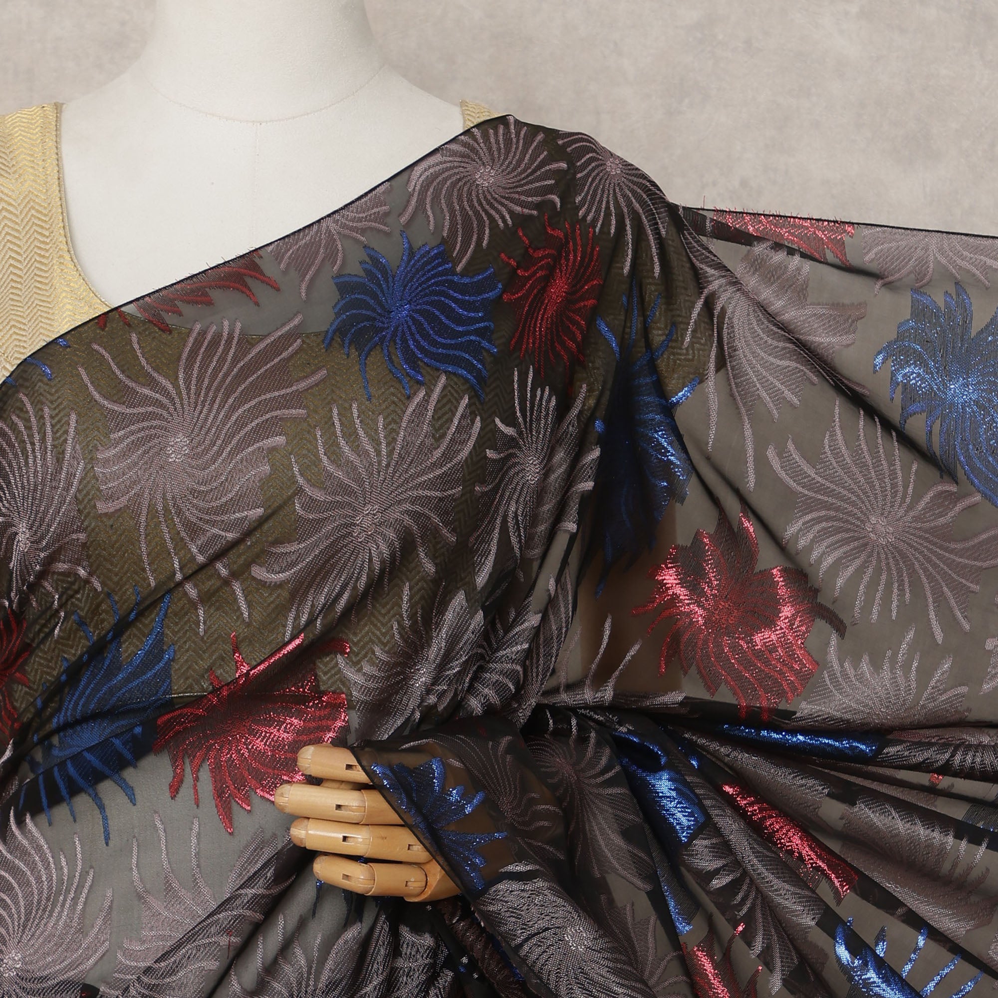 Black chiffon base with multicolor metallic lurex leaf motifs for vibrant elegance