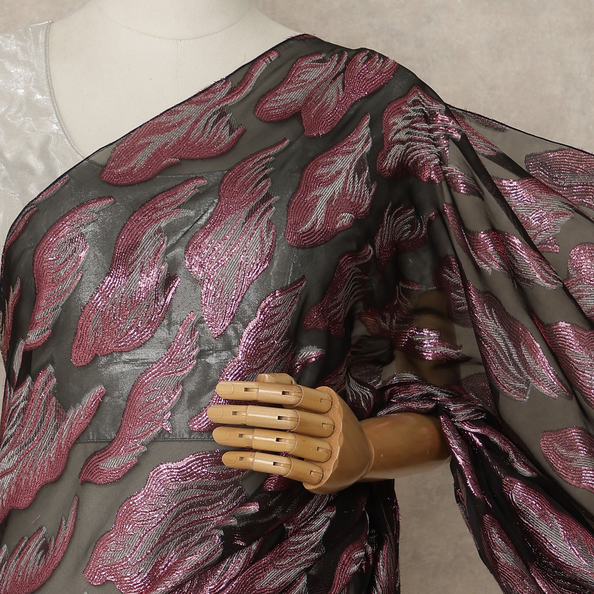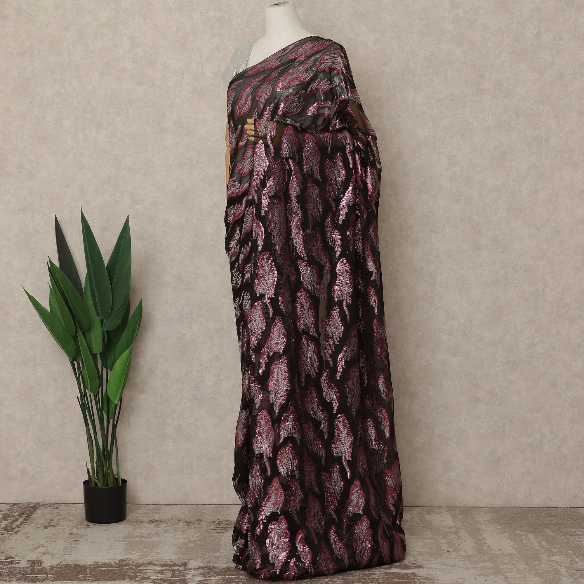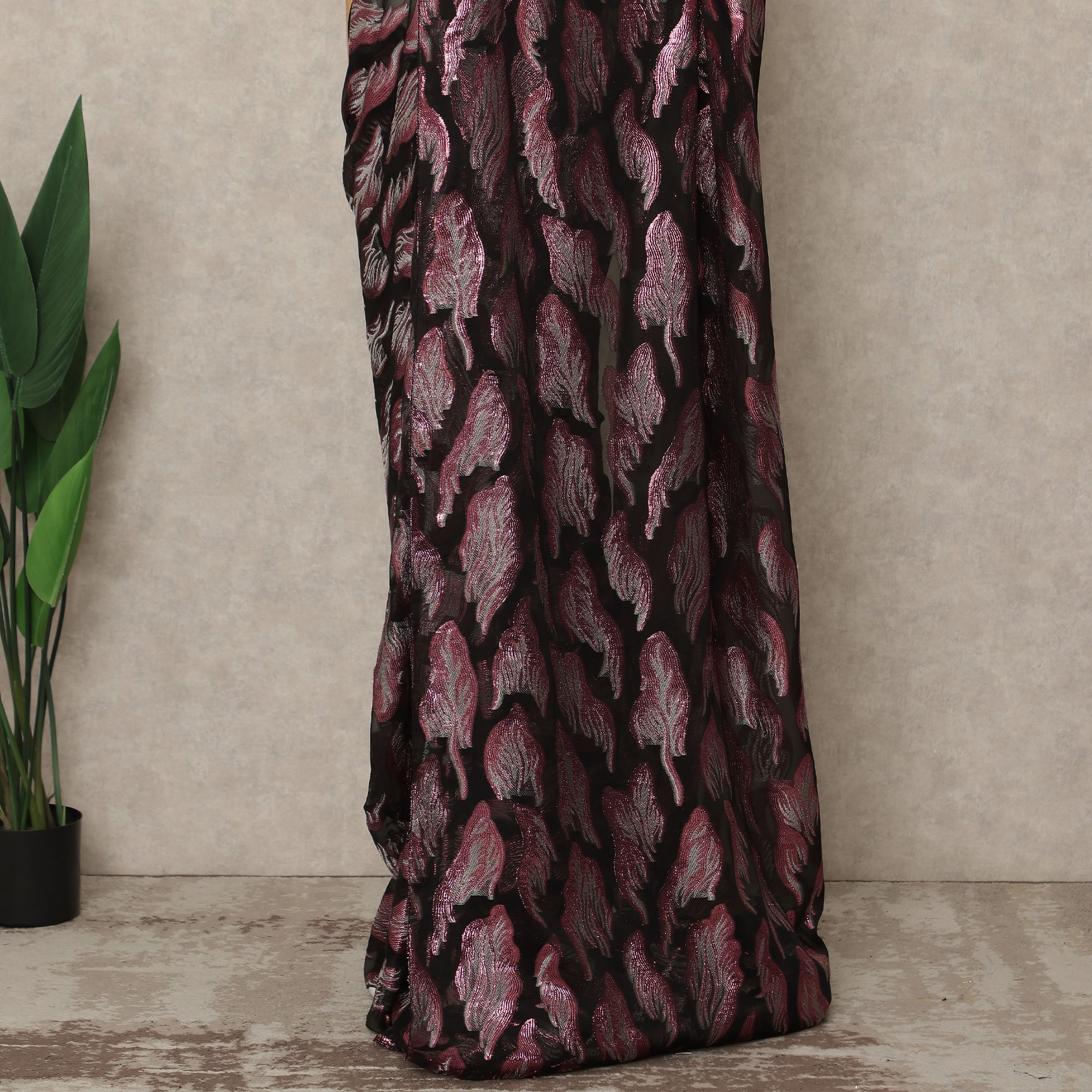 This premium French silk chiffon saree in a striking black base with rose pink woven motifs is created for women who appreciate bold elegance with a modern touch. Crafted from fine-quality chiffon sourced from France, the fabric is exceptionally lightweight, soft, and fluid, allowing a graceful drape that enhances movement and comfort. The shimmering rose pink motifs add depth and visual richness, making this saree ideal for weddings, evening parties, festive celebrations, and special occasions. Measuring approximately 5.5 meters in length with a generous 110 cms width, it offers ample fabric for neat pleats and versatile draping styles. The breathable texture ensures all-day comfort while maintaining a refined, luxurious appearance. Blouse piece is not included, giving you complete freedom to style it with a blouse of your choice.