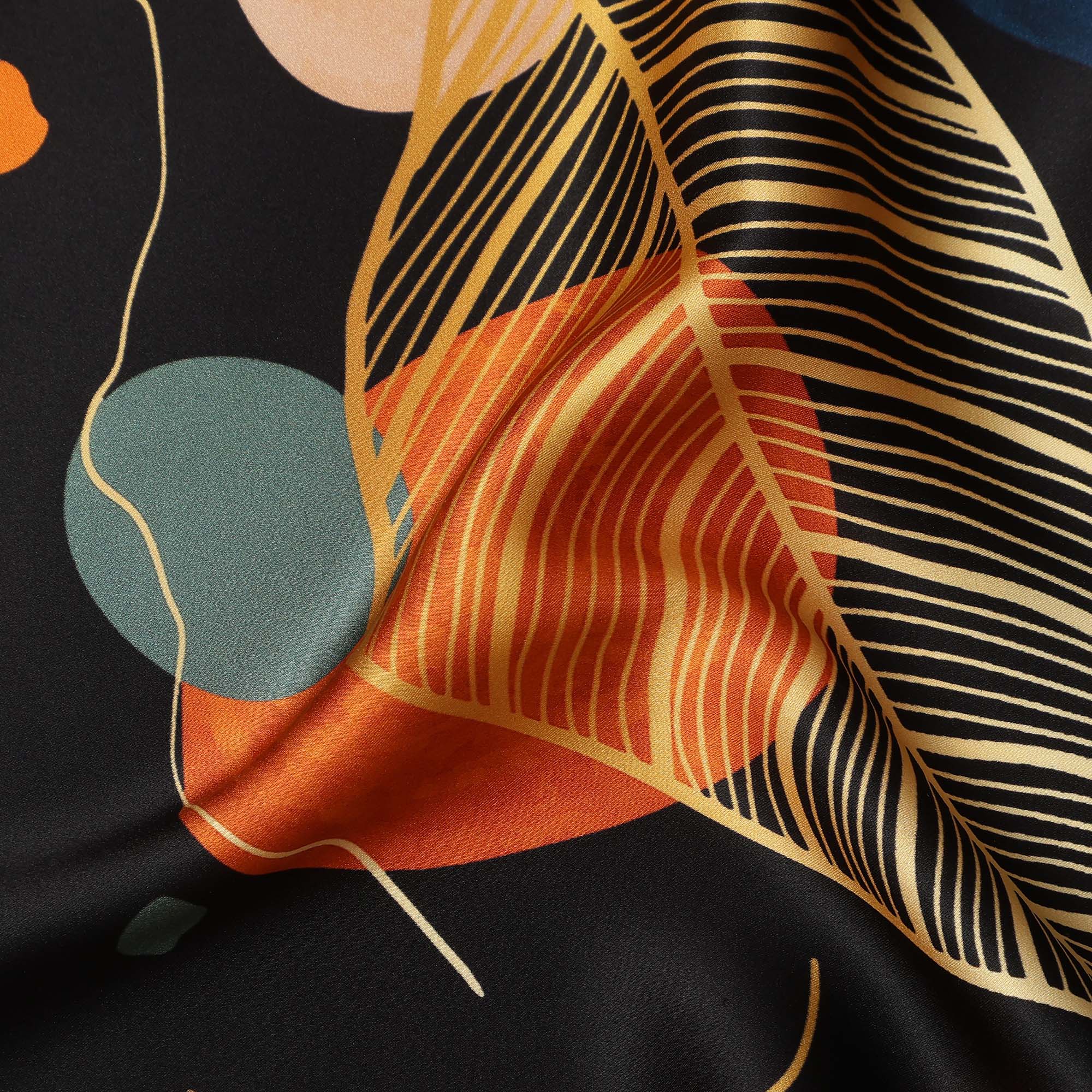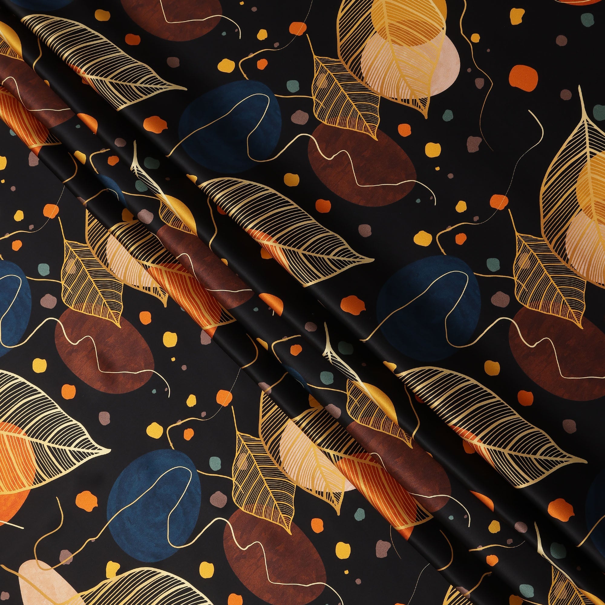 Premium black pure silk satin fabric with abstract leaf and geometric print