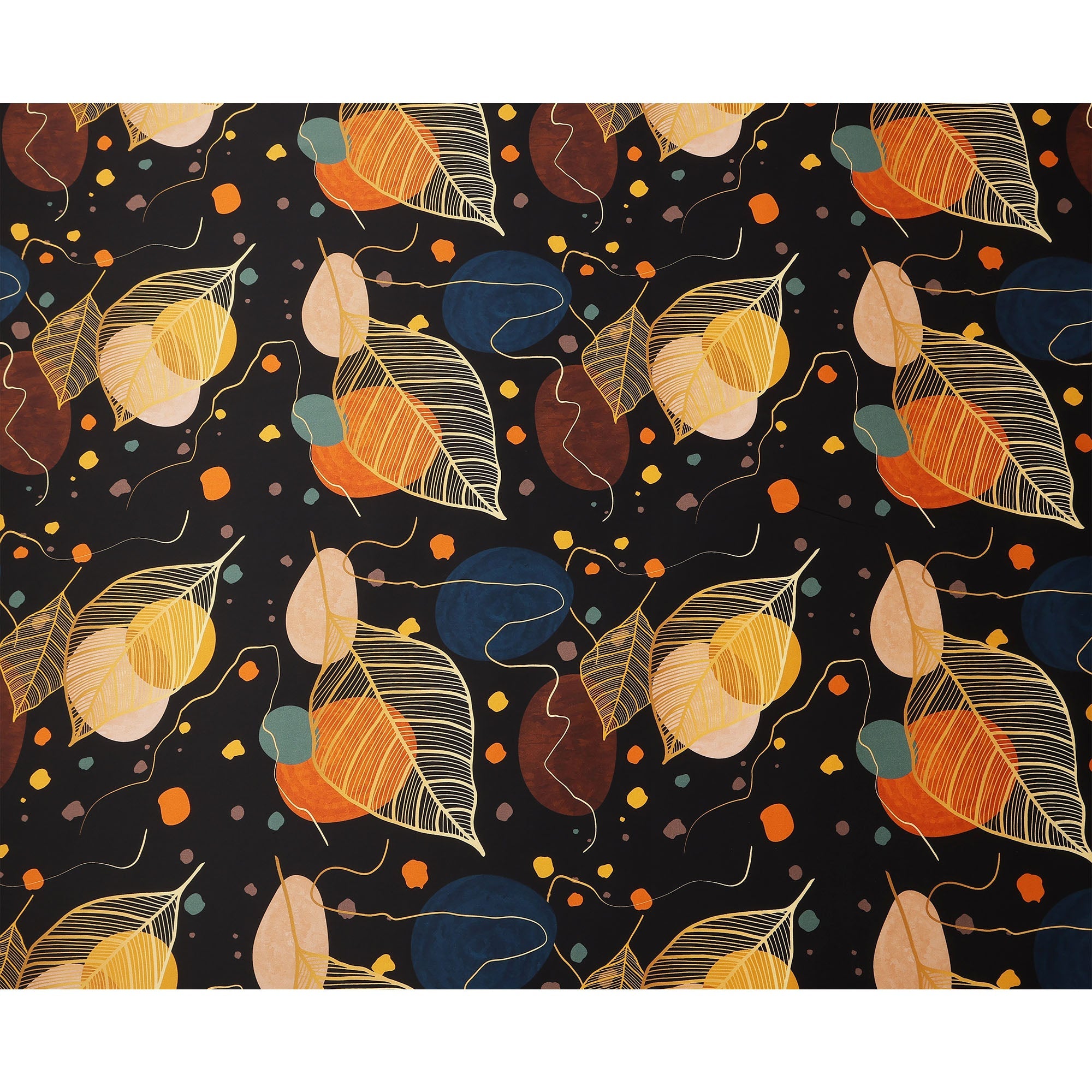 This Black Pure Silk Satin Fabric with abstract leaf and geometric print is a bold and artistic fabric designed to make a striking statement. The deep black background serves as a dramatic canvas for vibrant patterns featuring oversized golden-yellow and orange leaves, earthy brown tones, emerald green, and navy blue geometric shapes, all harmonized with scattered dot accents that enhance its contemporary flair. Crafted from pure silk satin, this fabric offers a smooth, soft, and lustrous texture that feels luxurious against the skin while providing an elegant drape for fluid silhouettes. With its wide 140 cms width, it allows creative versatility for gowns, dresses, blouses, sarees, and designer outfits. Ideal for both modern couture and festive wear, this fabric reflects South Korean craftsmanship that blends tradition with innovation. It is perfect for those who wish to experiment with fashion-forward prints while enjoying the timeless comfort of silk satin.