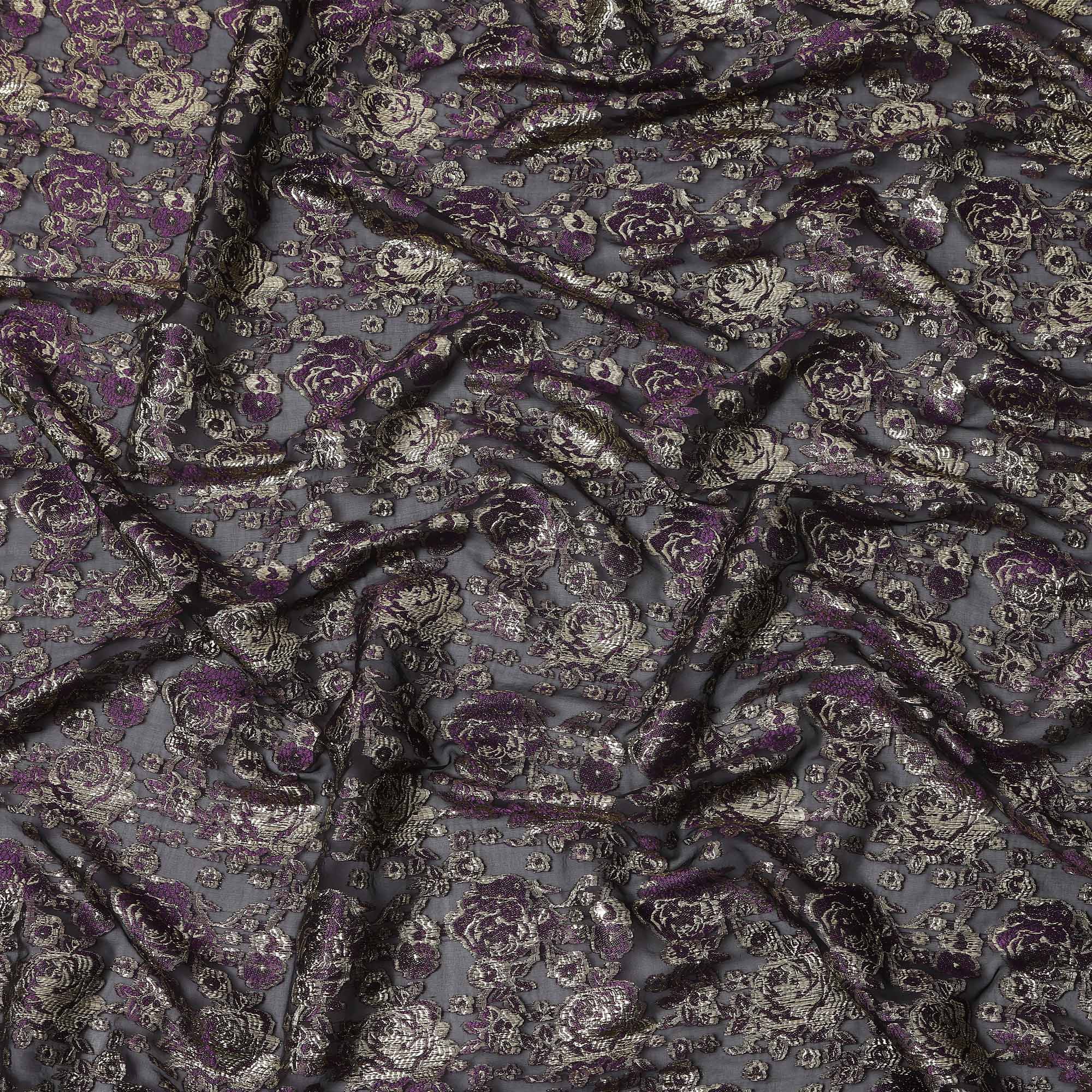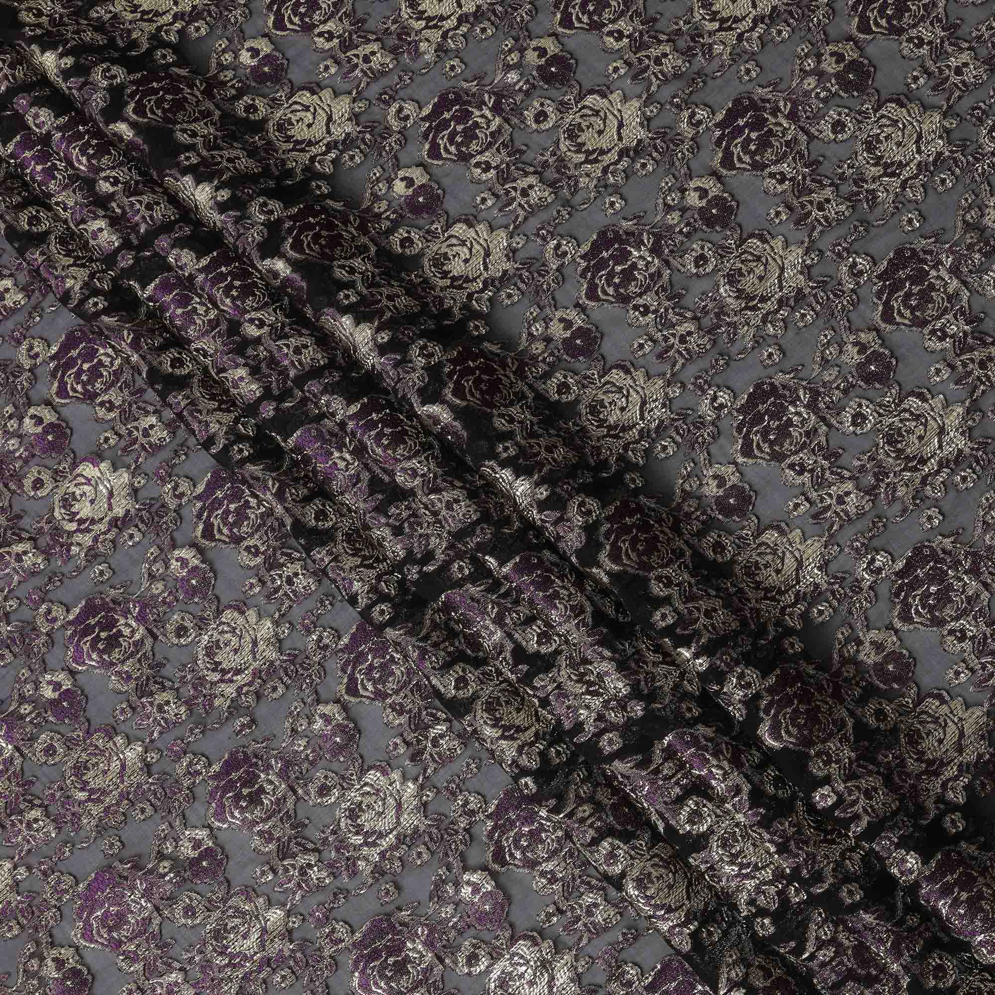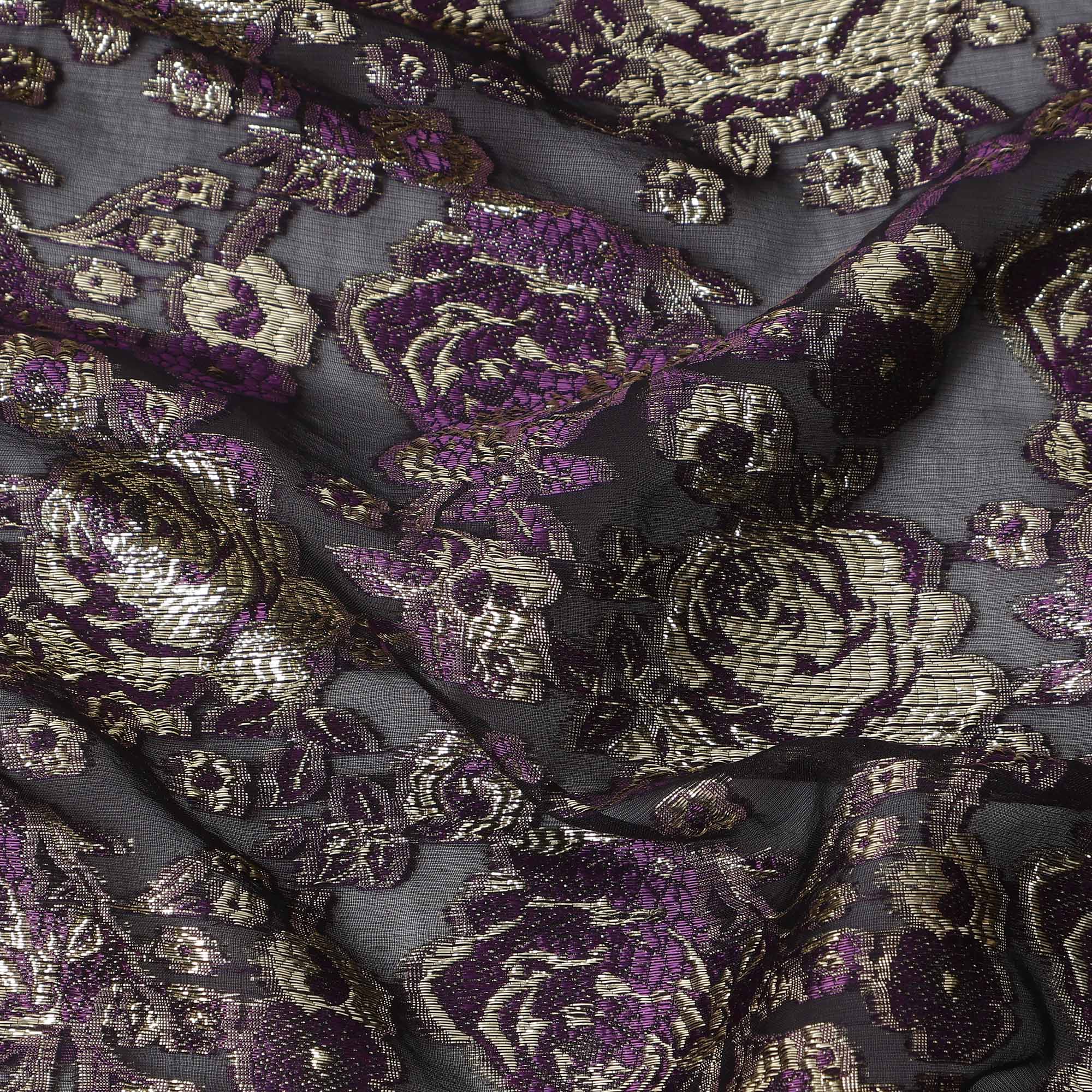 Black Purple Gold Metallic Lurex Design Premium Silk Chiffon Fabric, 110 Cms Width, Made in South Korea-D25952