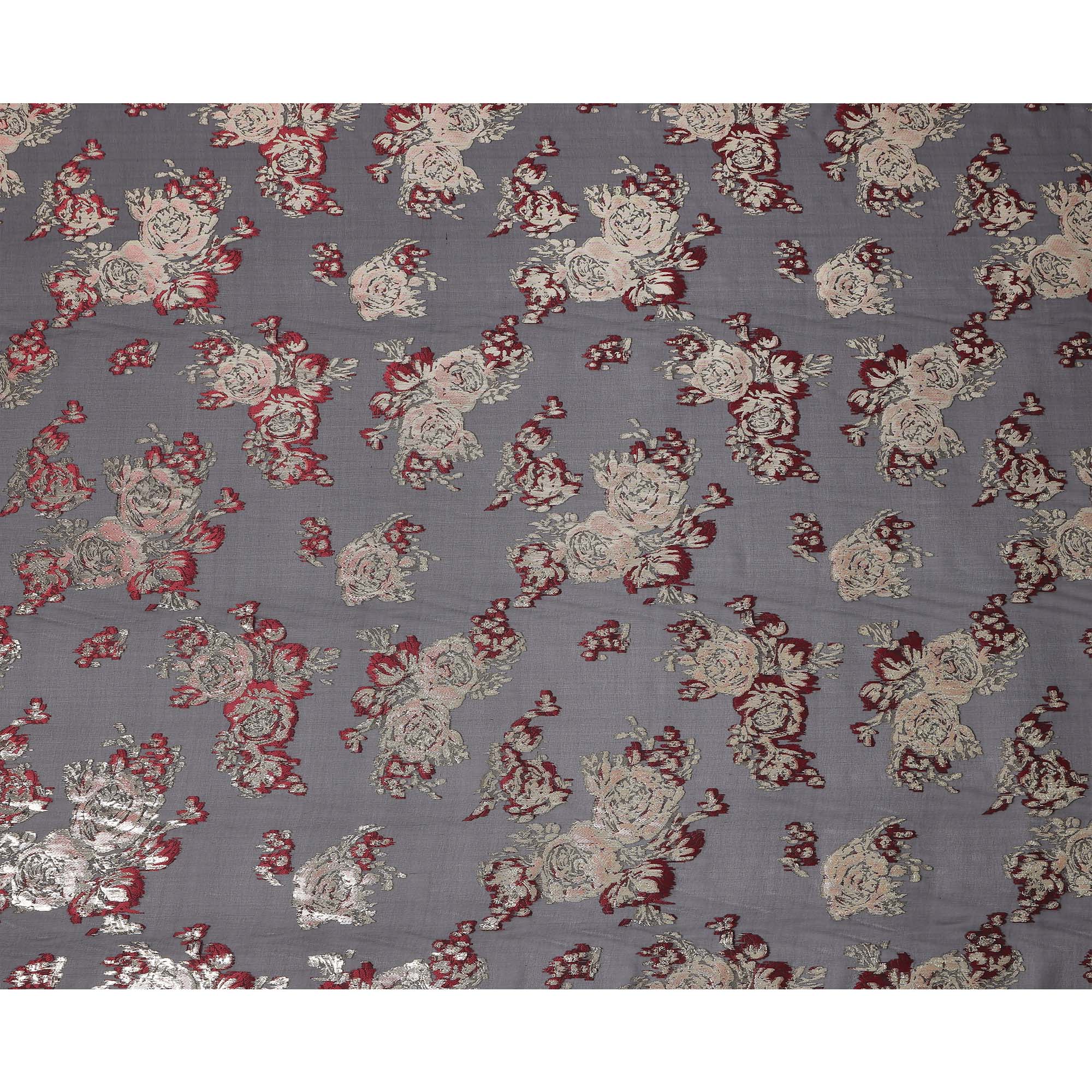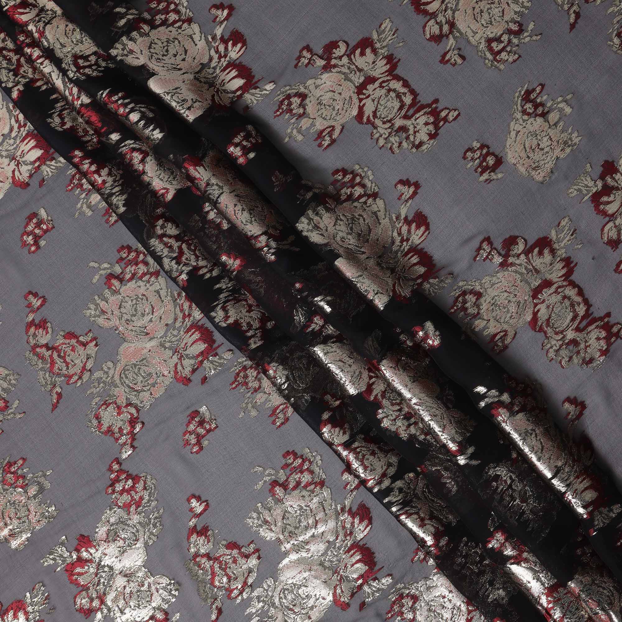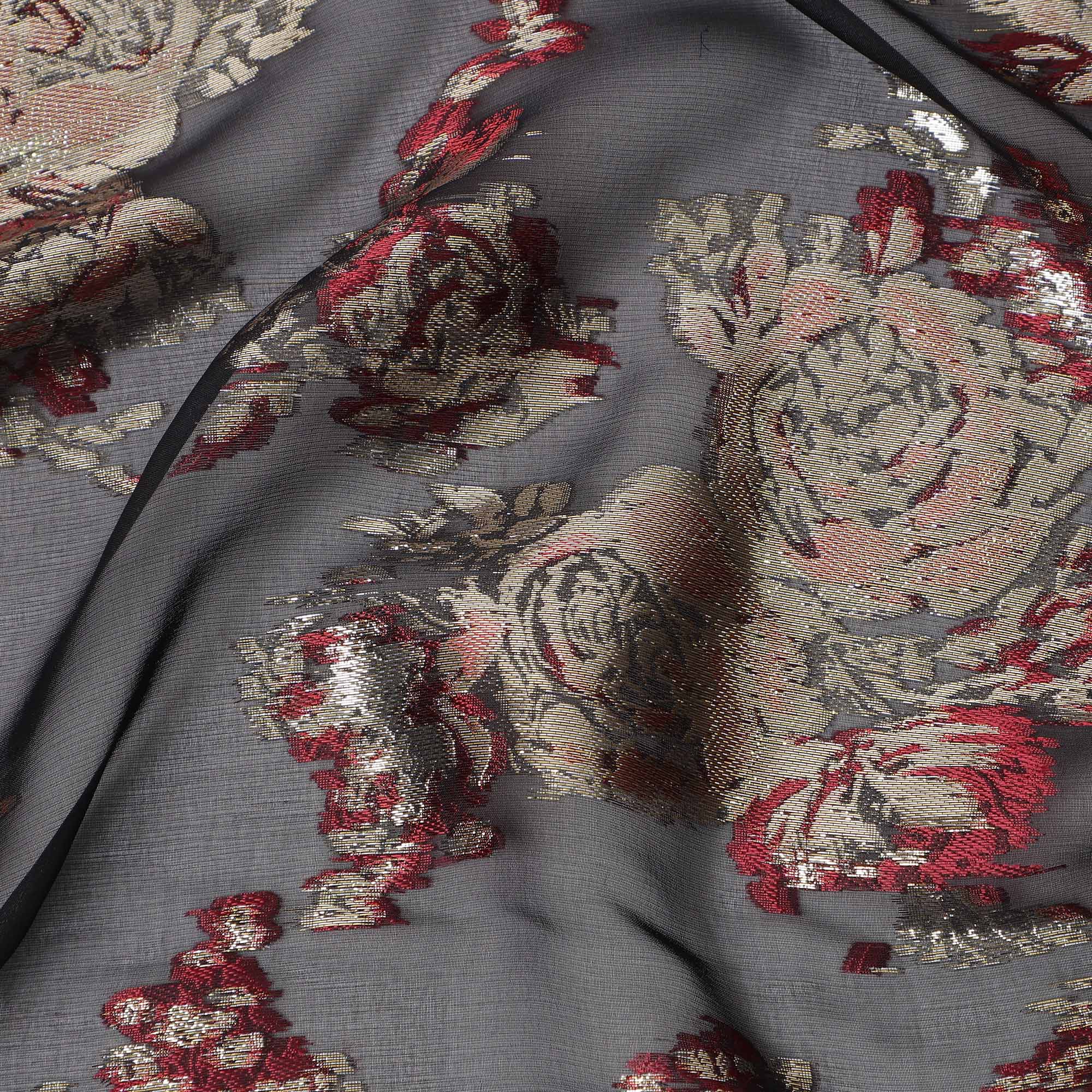 Black Red Floral Pure Silk Chiffon Fabric with Metallic Lurex, 110 Cms Width, South Korea-D25255