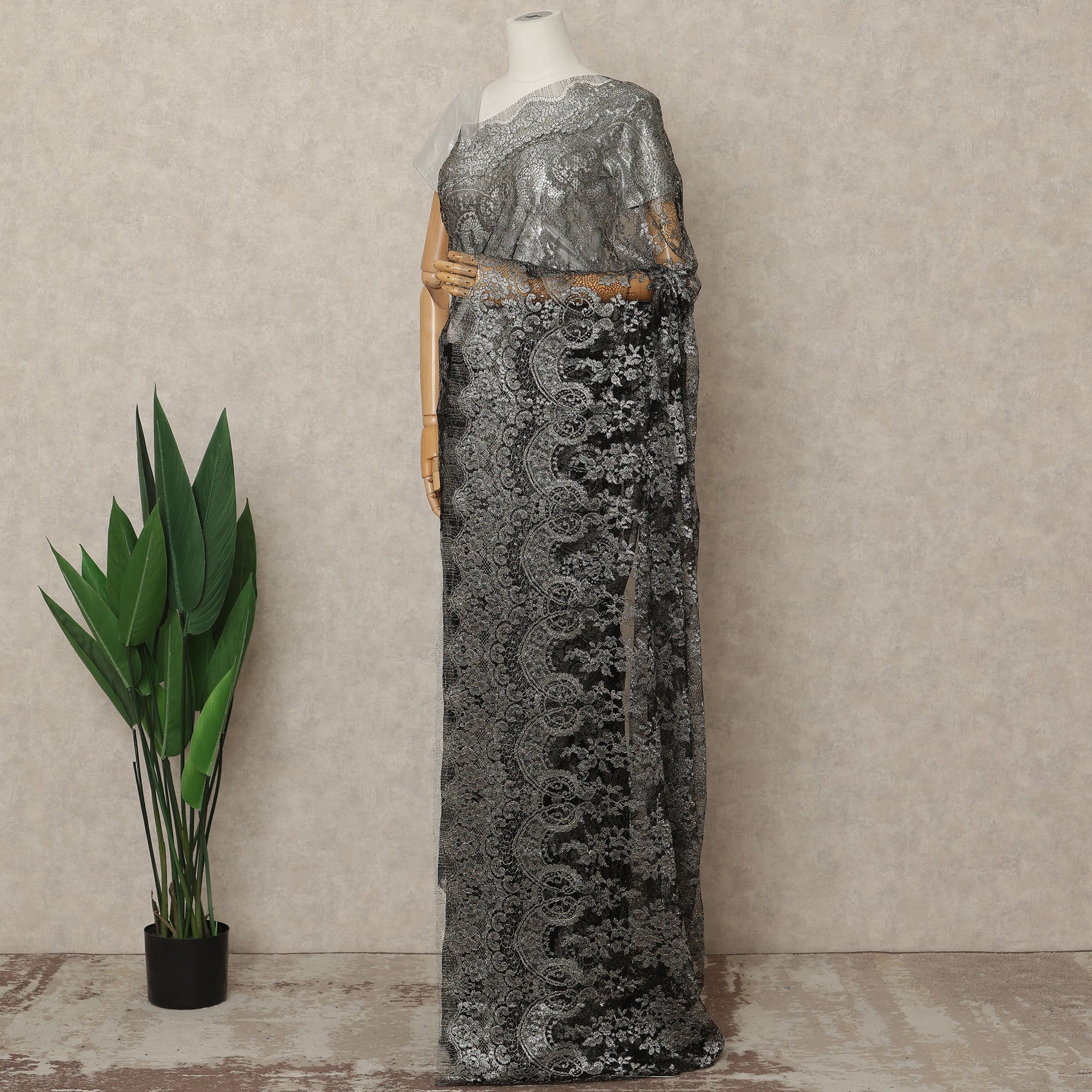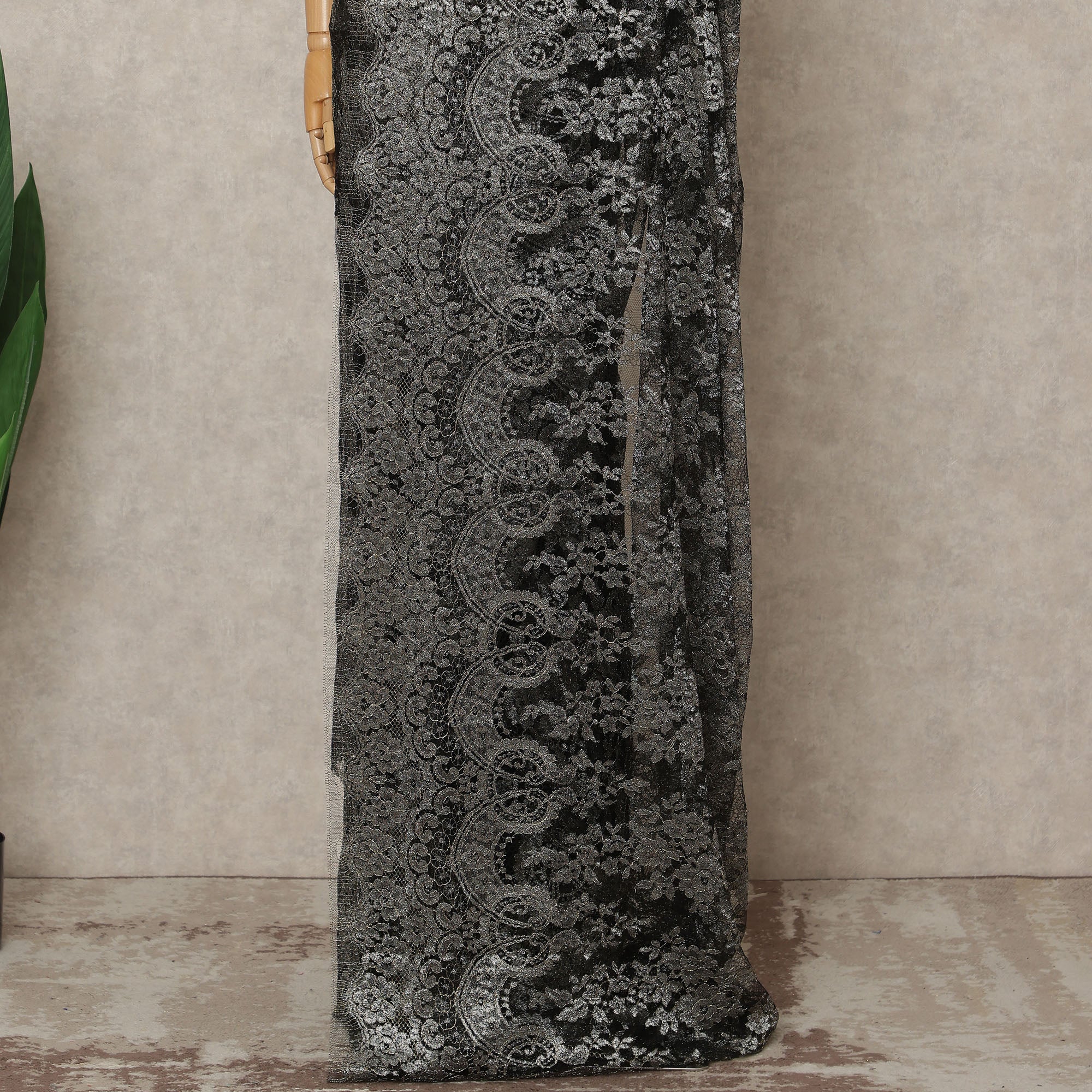 Black Silver Premium French Metallic Chantilly Lace Saree Fabric, 5.5 Mtrs Length, 110 Cms Width, Crafted in France – Rich Metallic Floral Lace, Blouse Not Included-D26422