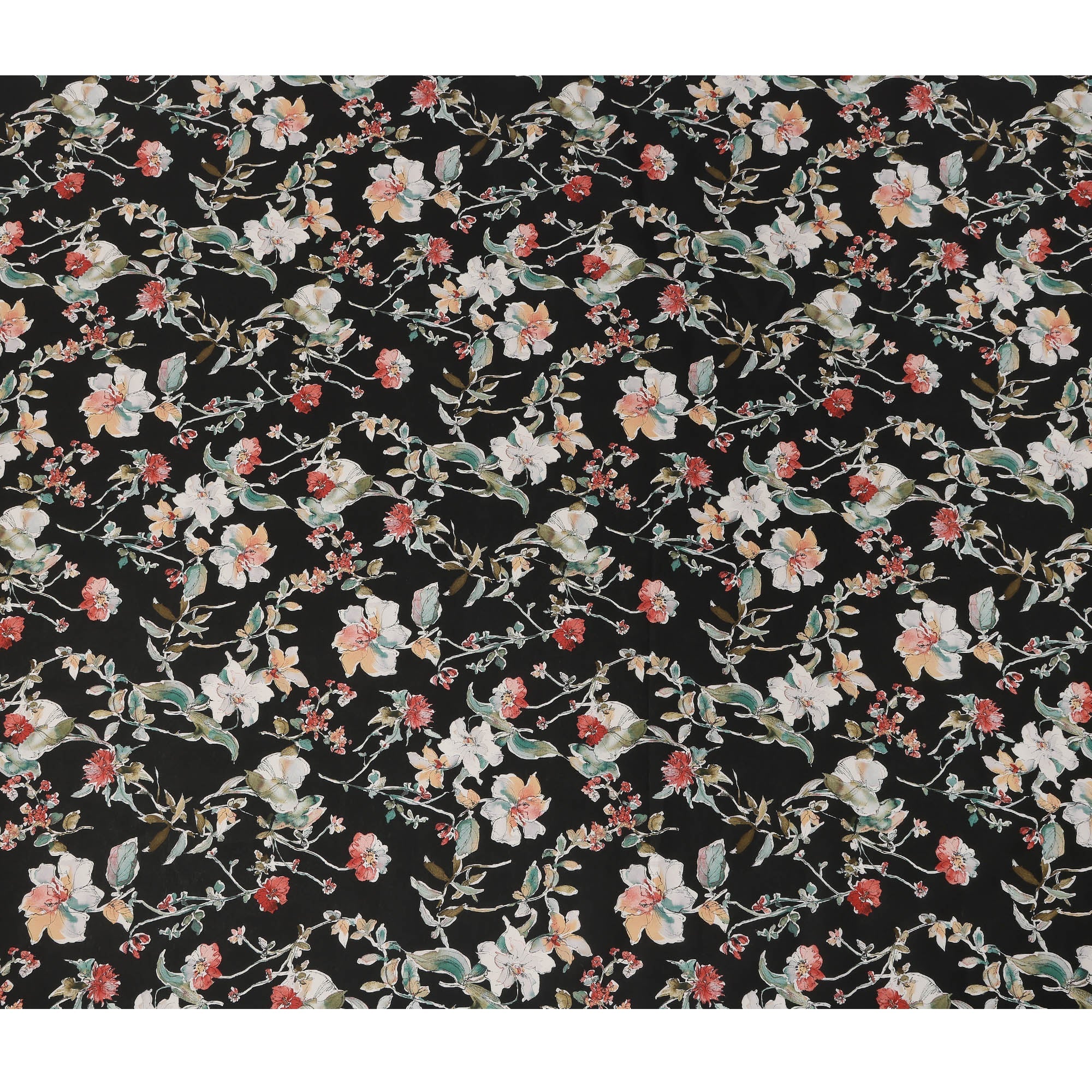Black base enriched with white, red, peach, and multicolor botanical florals