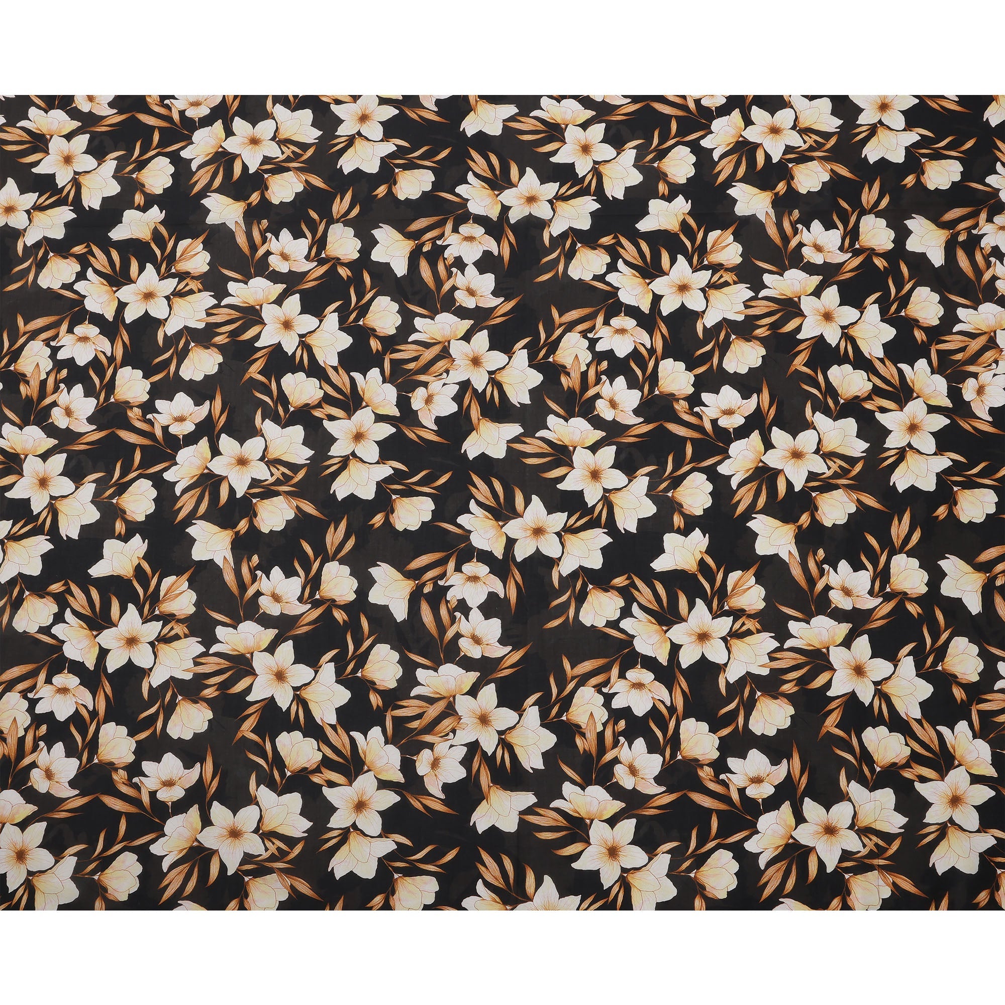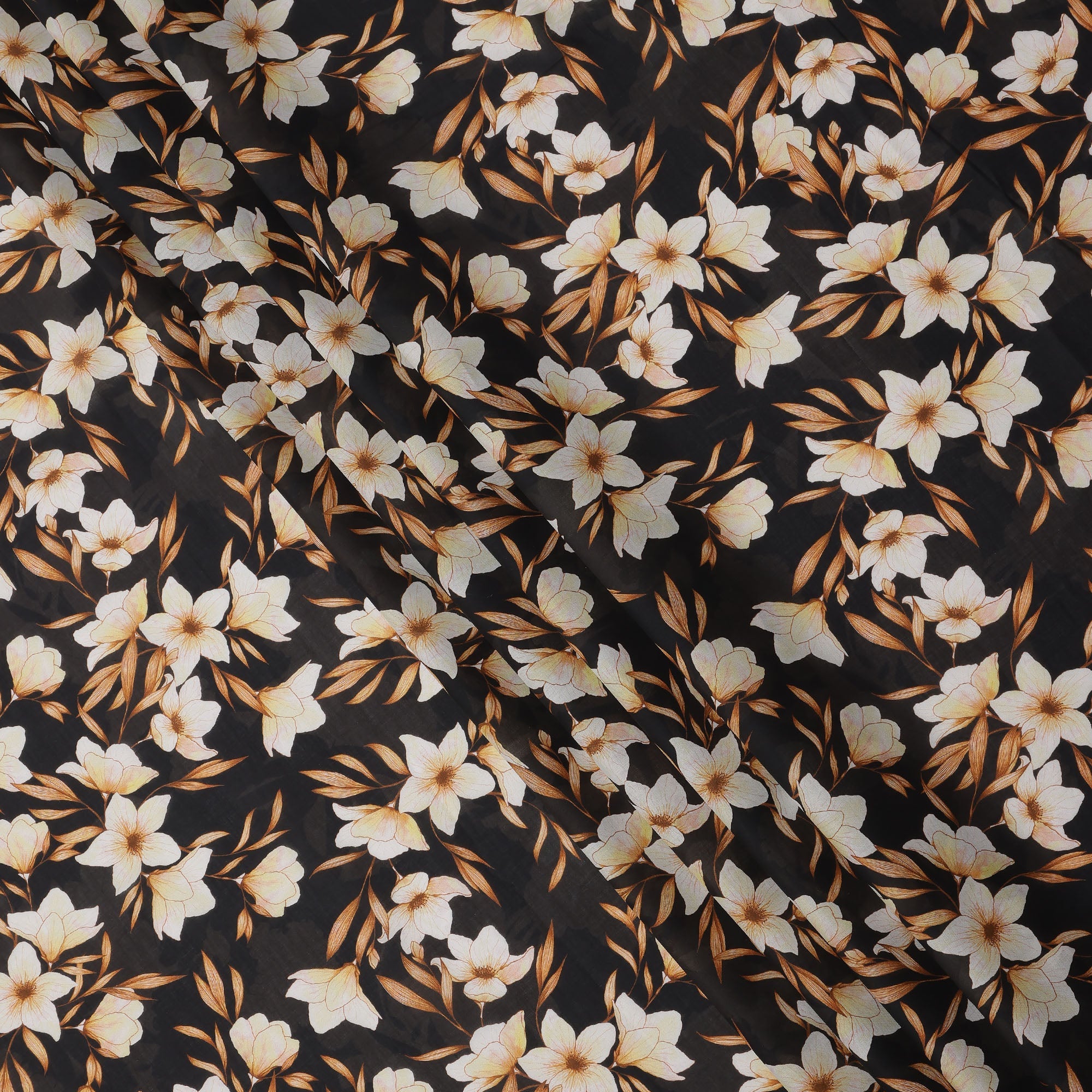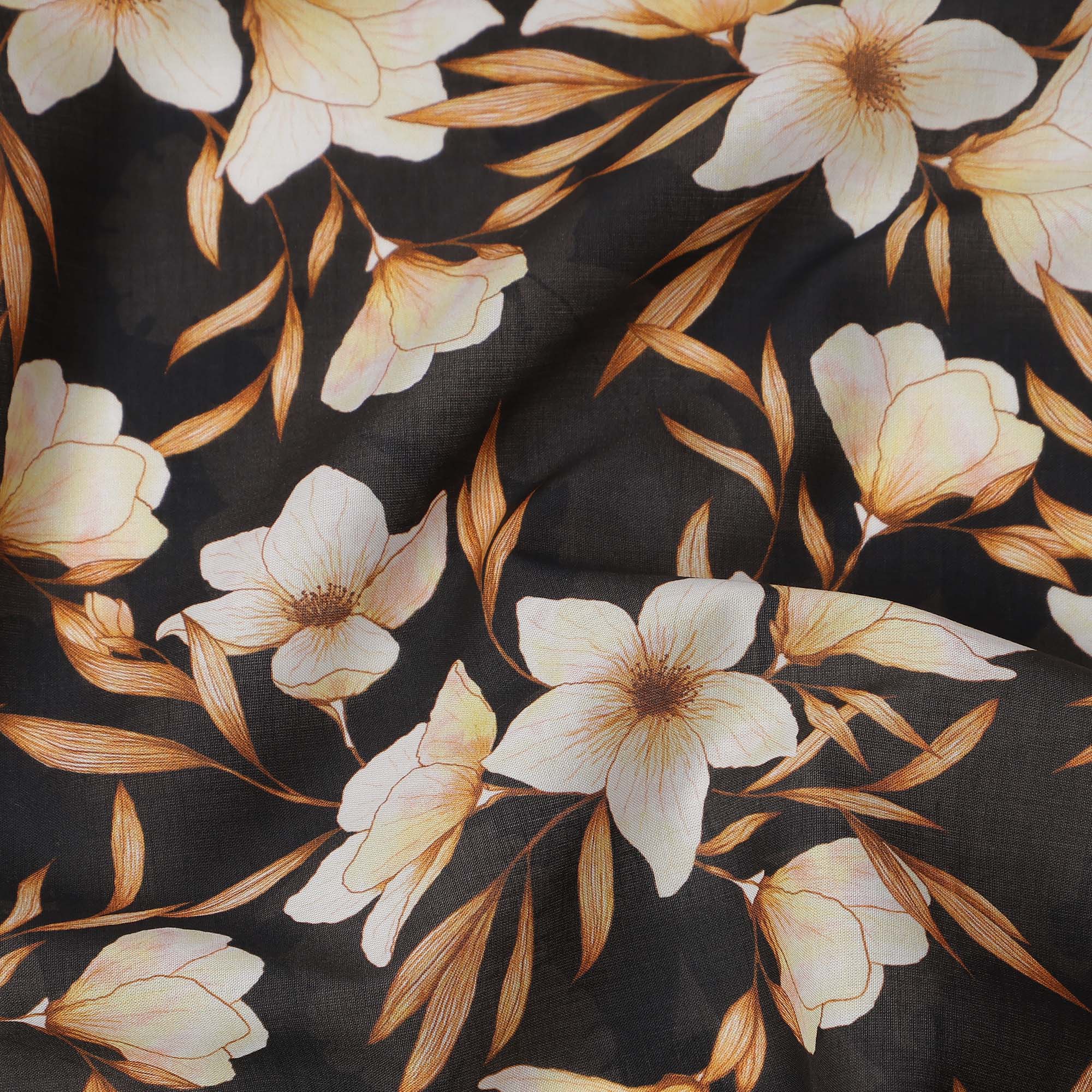 Black with Beige and Golden Floral Print Pure Italian Cotton Lawn Fabric, 140 Cms, Italy-D25401