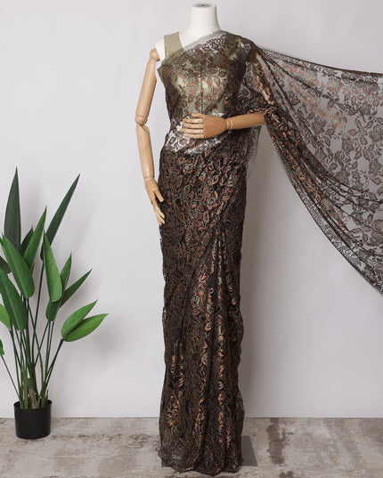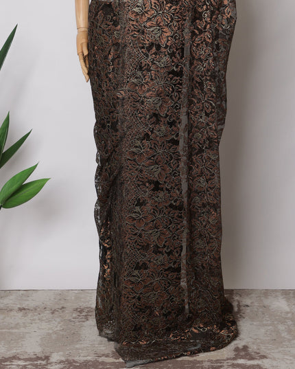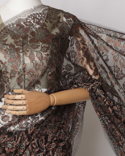 Black with Copper Gold Premium French Metallic Chantilly Saree Lace Fabric, 5.5 MetersX110 Cms-D21523