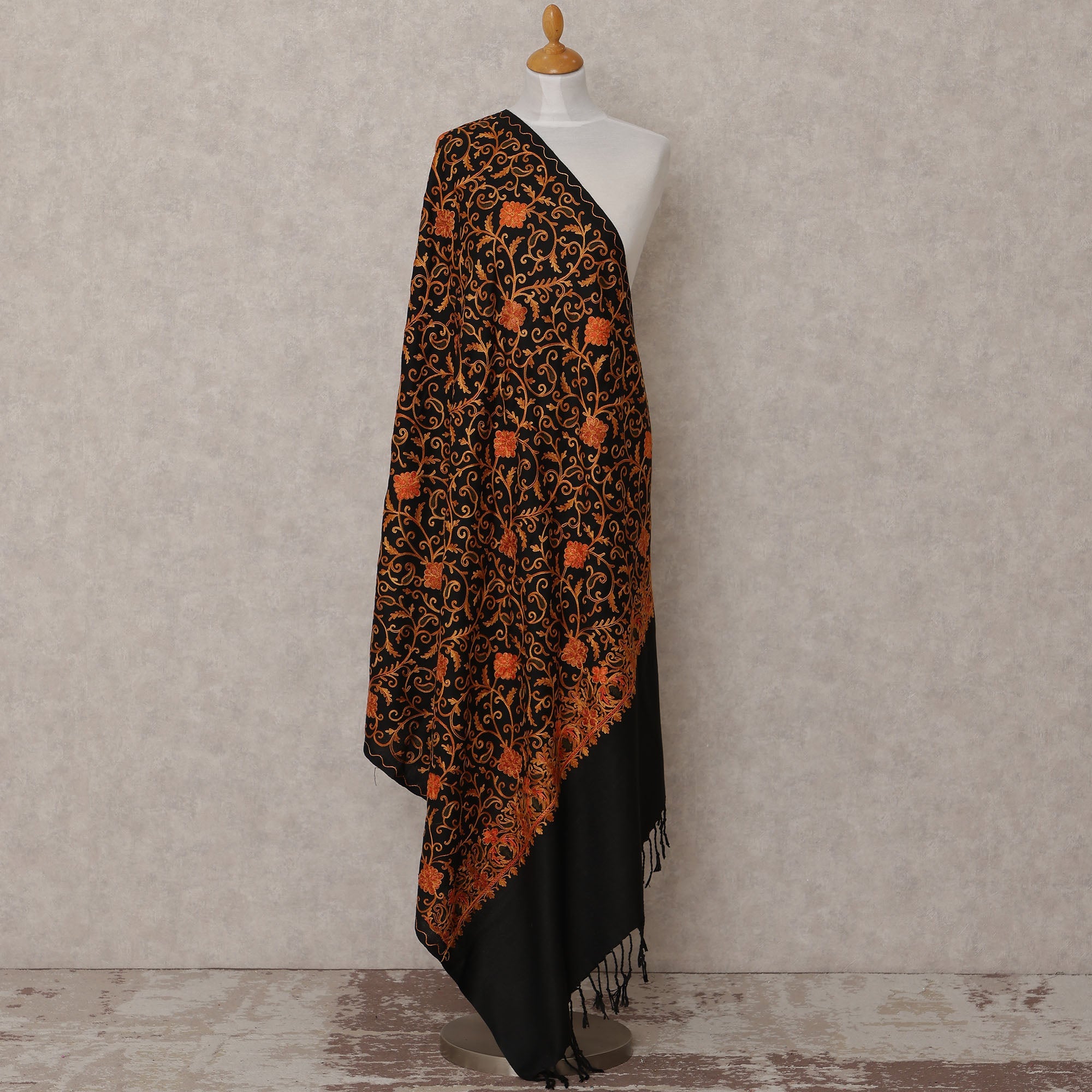 This black with orange floral vine design blended Kashmiri pashmina shawl is a timeless expression of elegance, traditional artistry, and luxurious comfort. The deep black base enhances the intricate vine motifs and floral patterns embroidered in vibrant orange and golden tones, reflecting the exquisite craftsmanship of Kashmiri heritage. Made from a fine pashmina blend, the shawl is soft, warm, and lightweight, making it suitable for year-round wear. Its 210X100 cms size ensures ample coverage, offering versatile styling whether draped gracefully over the shoulders or wrapped for cozy warmth. The meticulous embroidery adds a regal charm, perfect for festive occasions, evening gatherings, or elevating everyday ensembles. Finished with tasseled edges, this shawl blends tradition with modern sophistication, making it a valuable addition to any wardrobe.