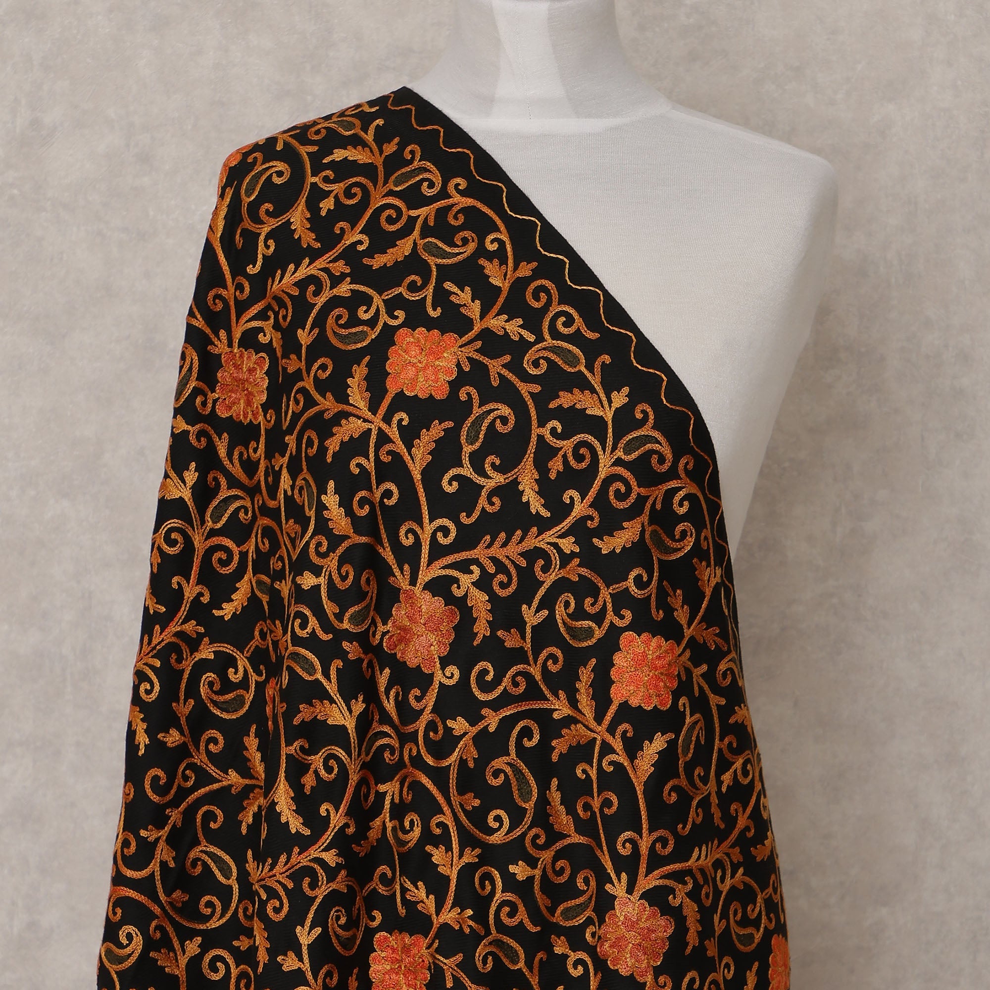 Black base adorned with intricate orange and golden floral vine embroidery