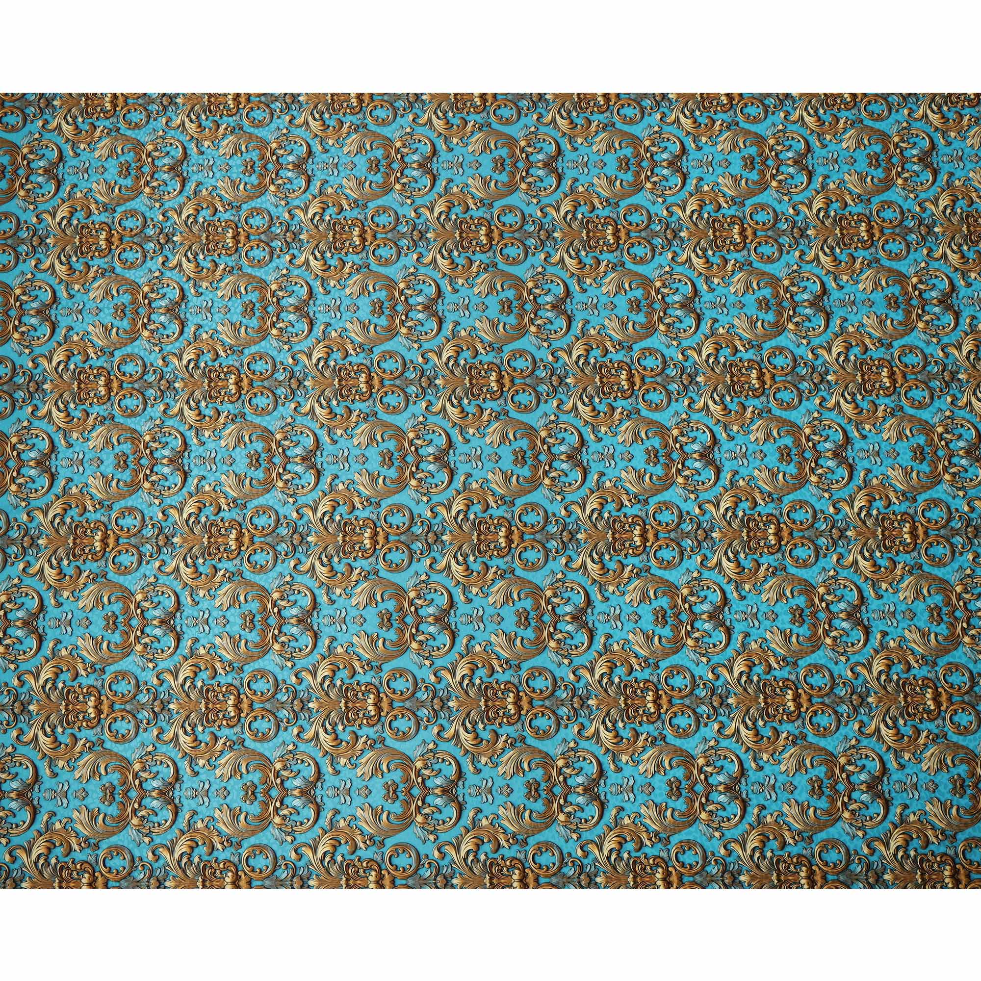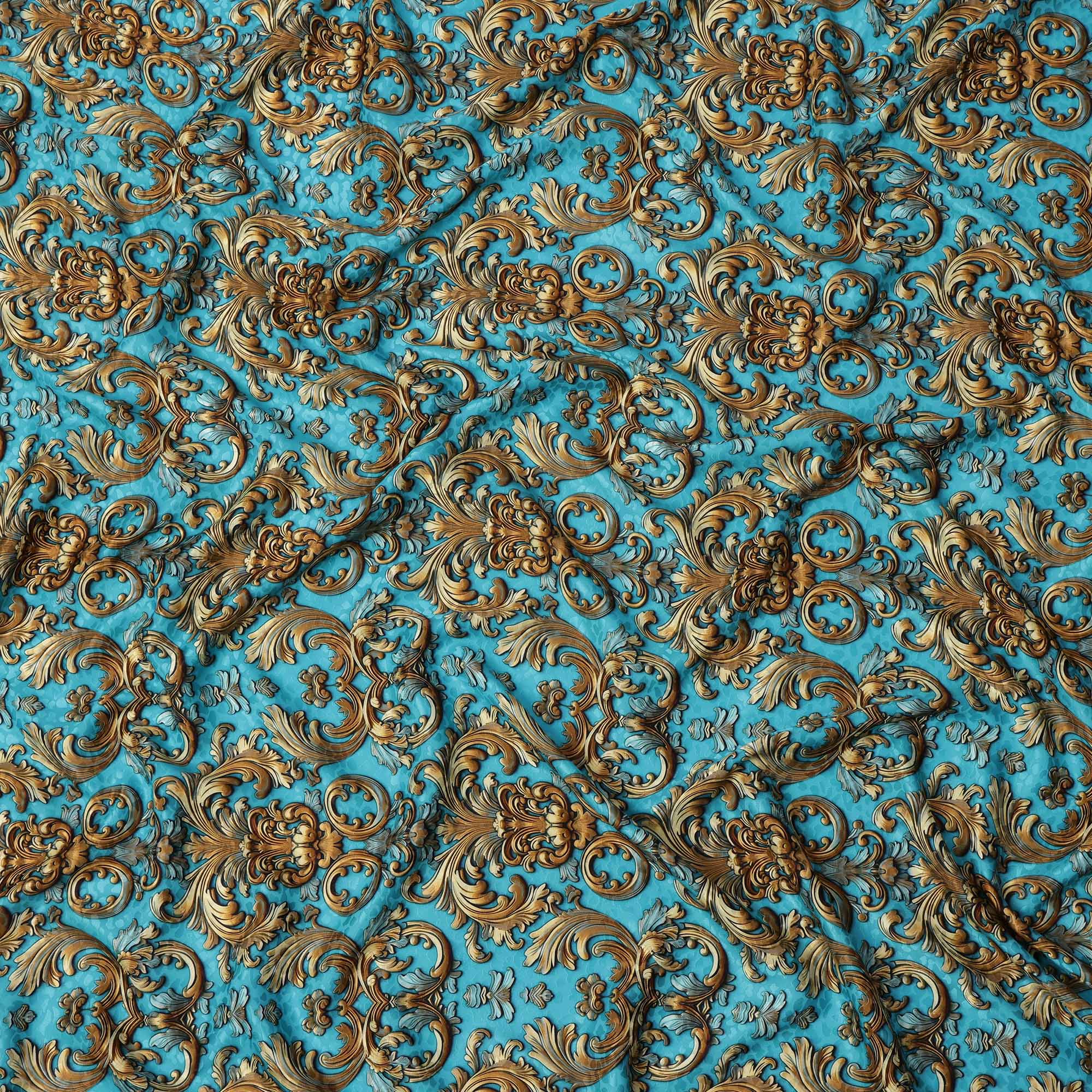 Blue and Gold Ornamental Baroque Print on Premium Pure Italian Silk Satin Fabric, 140 Cms Width, Italy-D24785