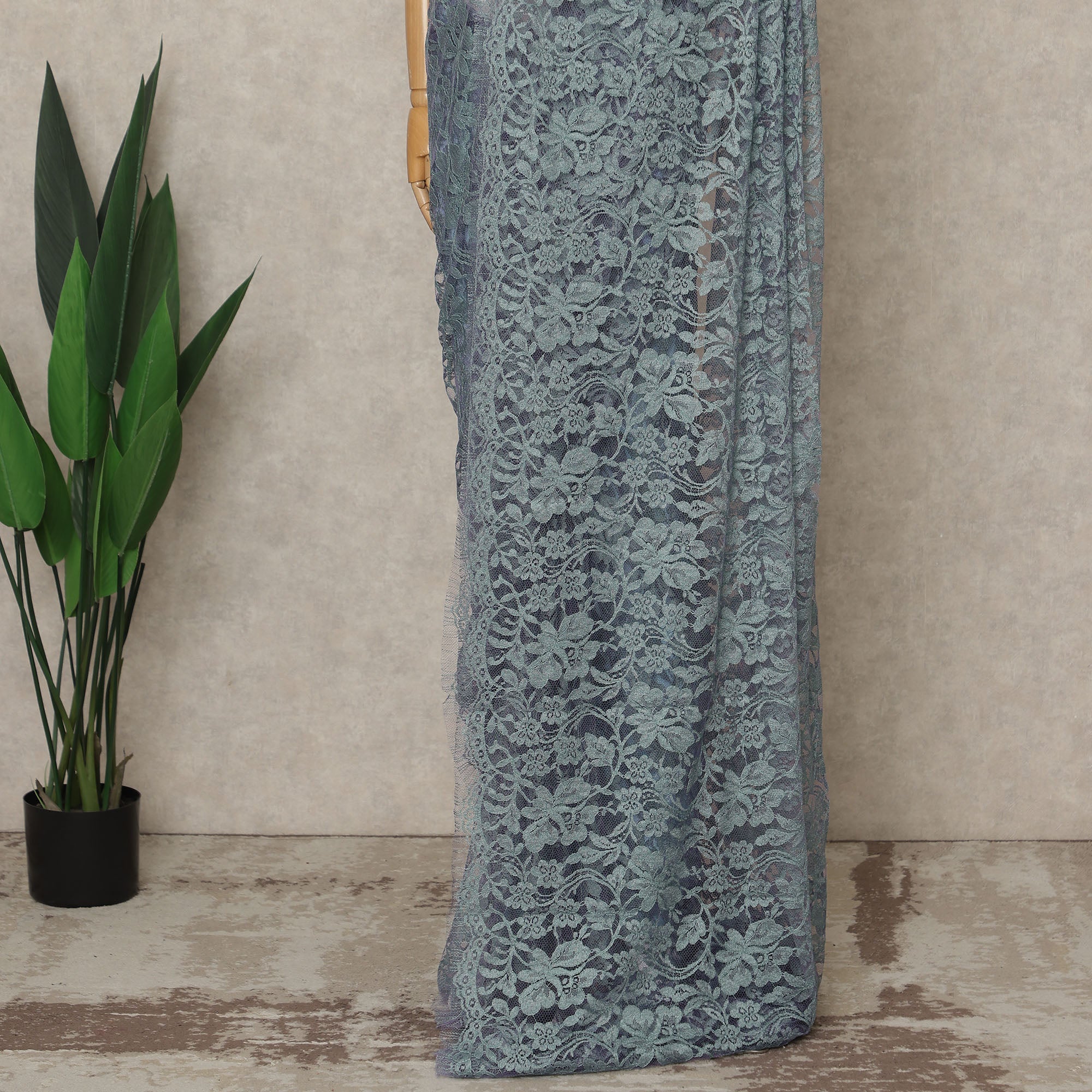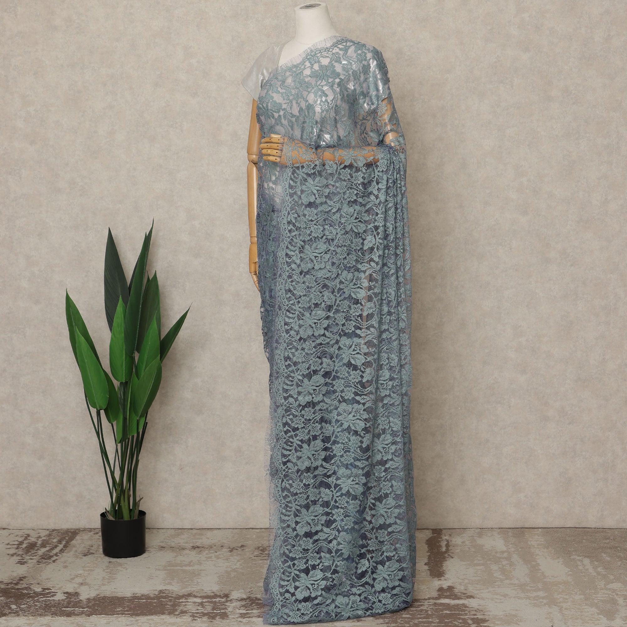 This Blue-Grey Premium French 2 Tone Chantilly Saree Lace showcases an elegant fusion of serene blue and muted grey tones that create a refined dual-shade effect, highlighting the intricate floral patterns and delicate transparency that are hallmarks of authentic French Chantilly craftsmanship; expertly crafted in France, this approximately 5.5-meter fabric drapes with exceptional fluidity and lightness, offering a luxurious fall ideal for designer sarees, evening couture, bridal occasions, and statement festive ensembles, while its soft hand-feel, metallic sheen, and sophisticated texture ensure both visual richness and superior garment quality—blouse not included.