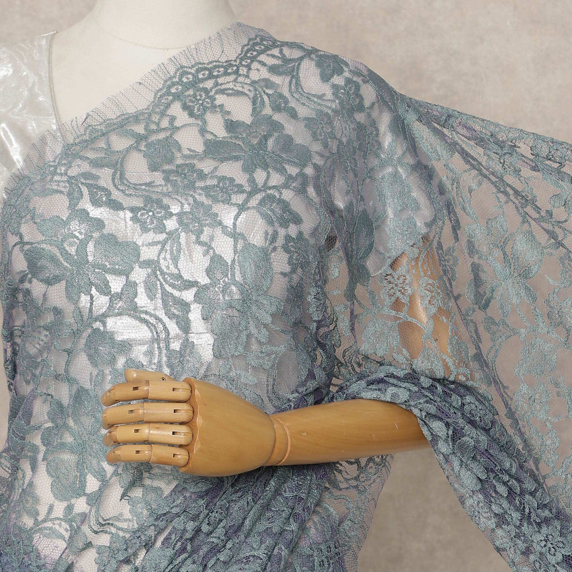 Beautiful blue-grey two-tone Chantilly lace with intricate floral motifs.