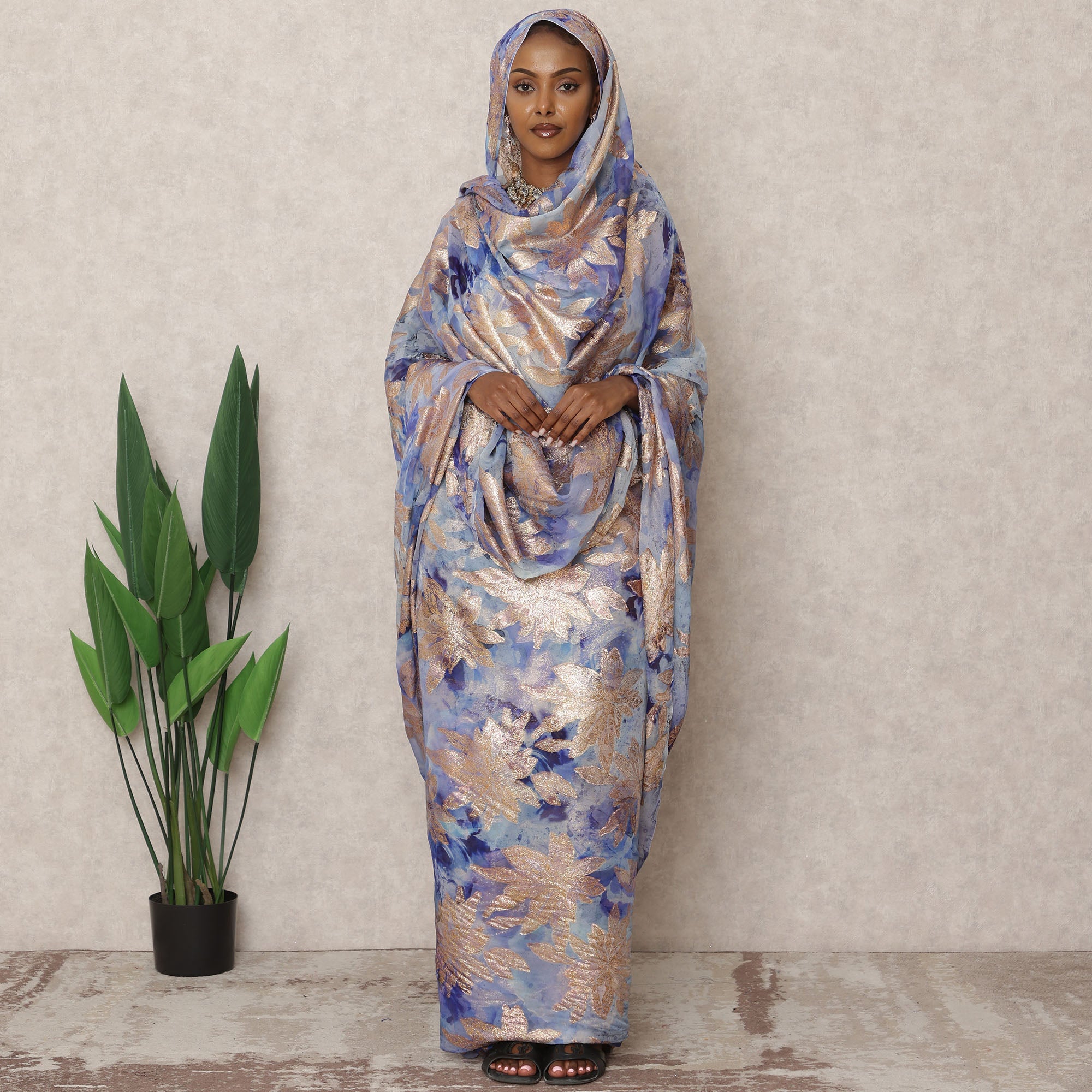 Immerse yourself in serene elegance with this blue premium Sudanese thobe, exquisitely crafted from pure Korean silk chiffon and elevated with radiant metallic lurex floral detailing that dances in the light. With a generous 4.5 meters in length and a luxurious 140 cm width, this thobe offers a graceful, airy drape ideal for festive gatherings, formal occasions, or traditional events. The cool-toned blue backdrop blends seamlessly with golden shimmer, offering a breathtaking harmony of contemporary style and cultural richness. Buy online now to experience Korean silk artistry tailored to traditional Sudanese heritage with a modern twist.
