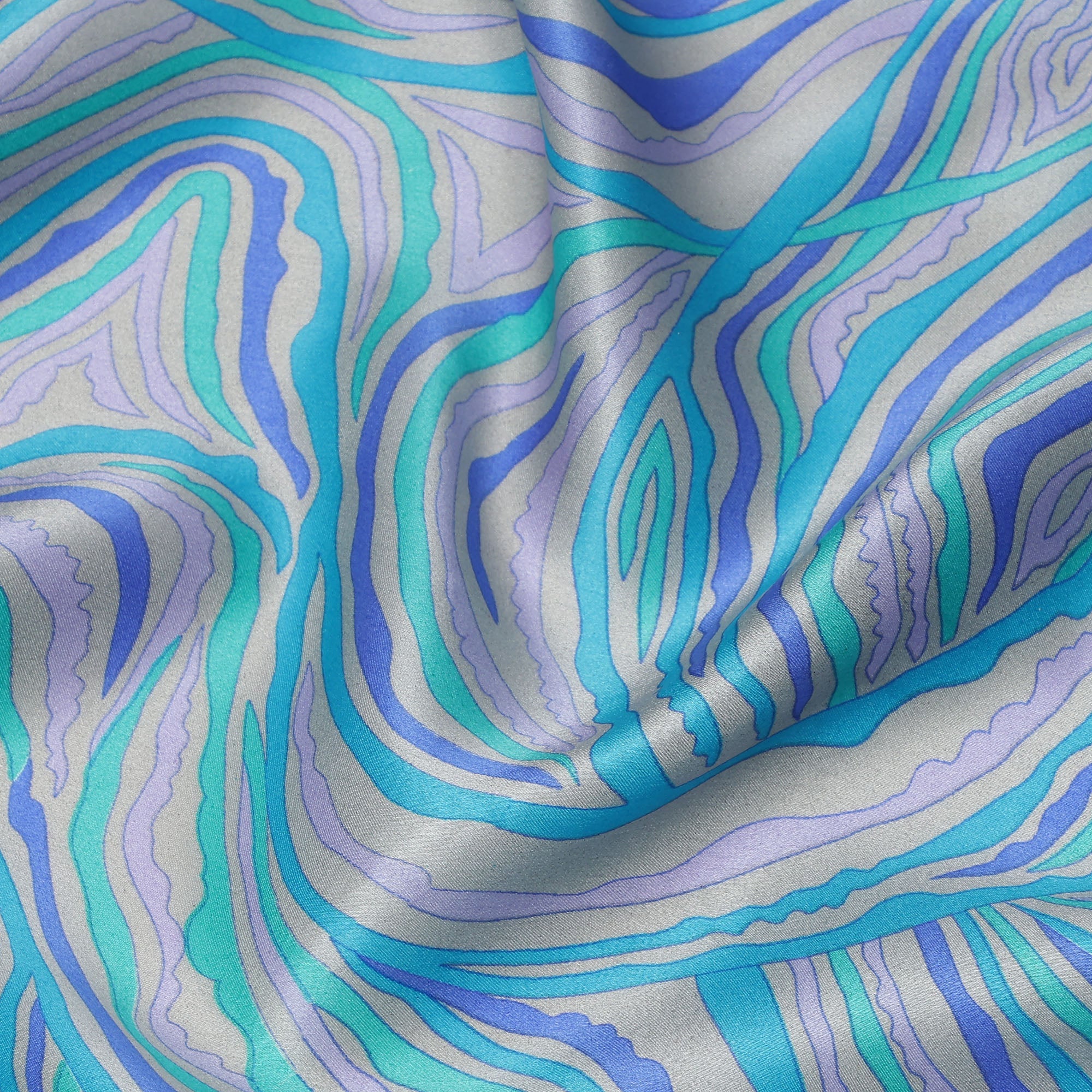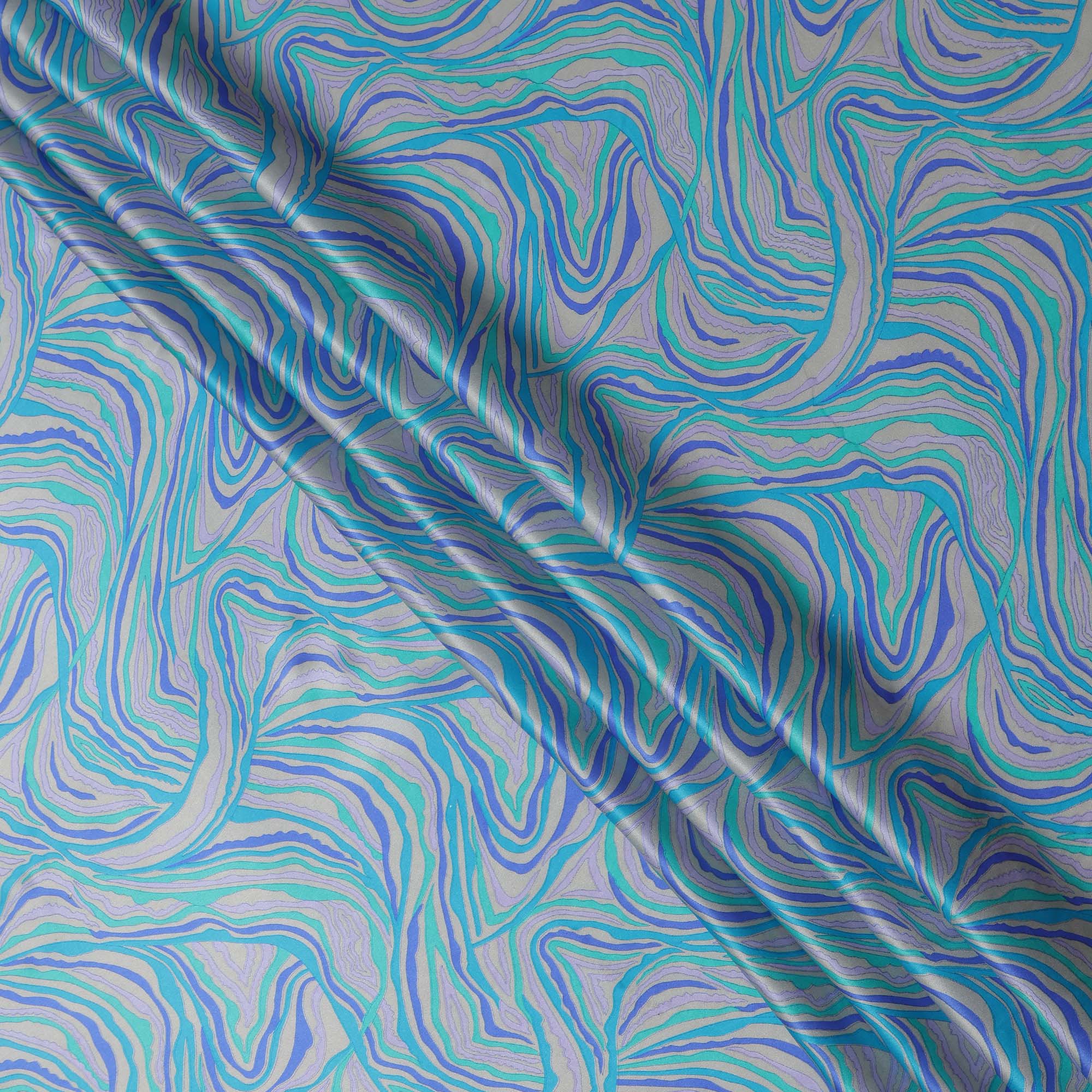 Blue Multicolor Abstract Wave Print Silk Satin Fabric 110 Cms Width India-D24991