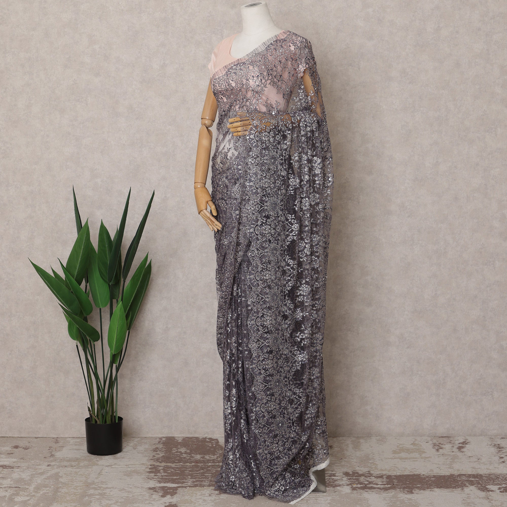 Turn heads with this Blue Premium French Metallic Chantilly saree lace fabric, an exquisite piece that merges dark elegance with fine European artistry. Measuring 5.5 meters in length and 110 cm in width, this French-imported lace fabric is crafted for couture-level ethnic wear, radiating glamour through its deep Blue base adorned with metallic threads and delicate stone embellishments. The intricate floral motifs spread across the sheer Chantilly lace create a refined contrast of bold color and graceful design, making it ideal for high-fashion sarees and festive ensembles. Its lightweight and airy nature ensures a fluid drape that’s both flattering and comfortable. Scalloped lace edges lend a luxurious finishing touch, while the shimmering surface reflects light beautifully, adding dimension to every pleat. Tailor this unstitched saree fabric to suit your unique style and make a powerful fashion statement at weddings, receptions, or elegant evening events. Blouse piece not included. To maintain the lace's exquisite finish, dry clean only. Shop online today and elevate your ethnic wardrobe with this dramatic and dazzling French lace creation.