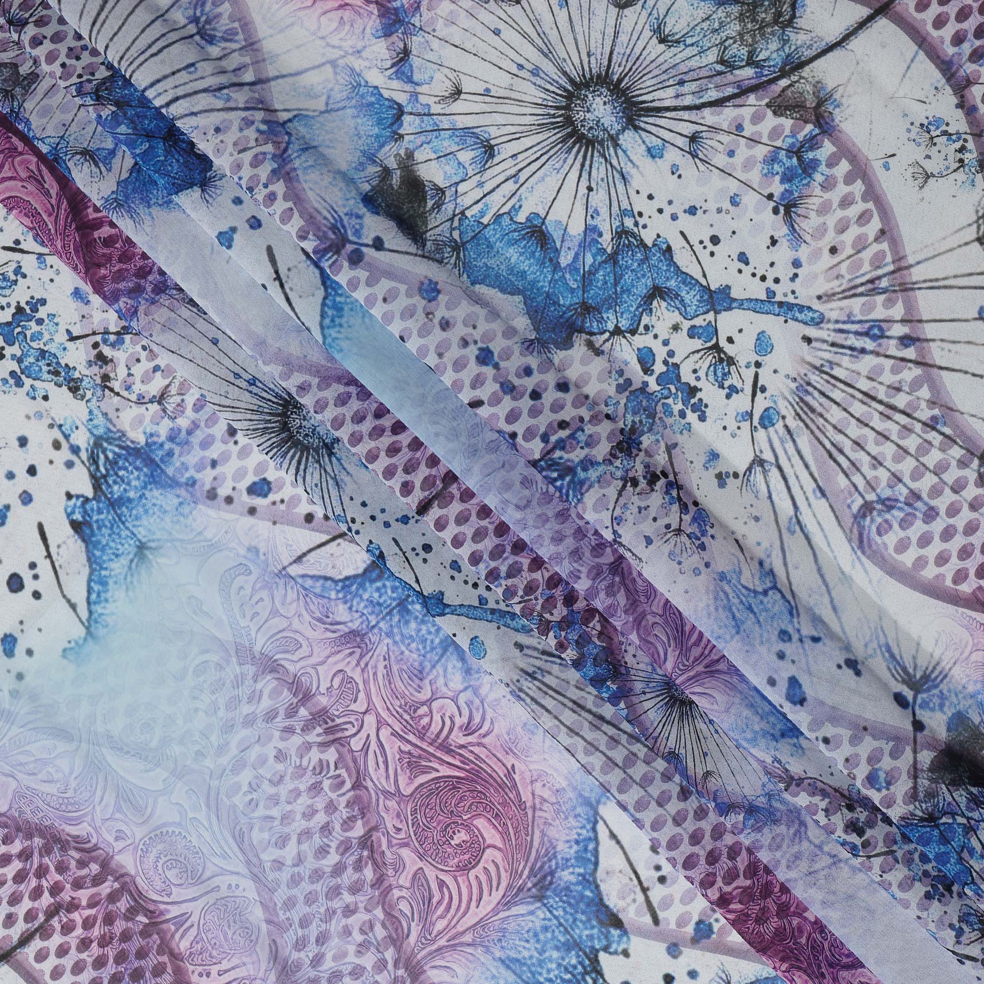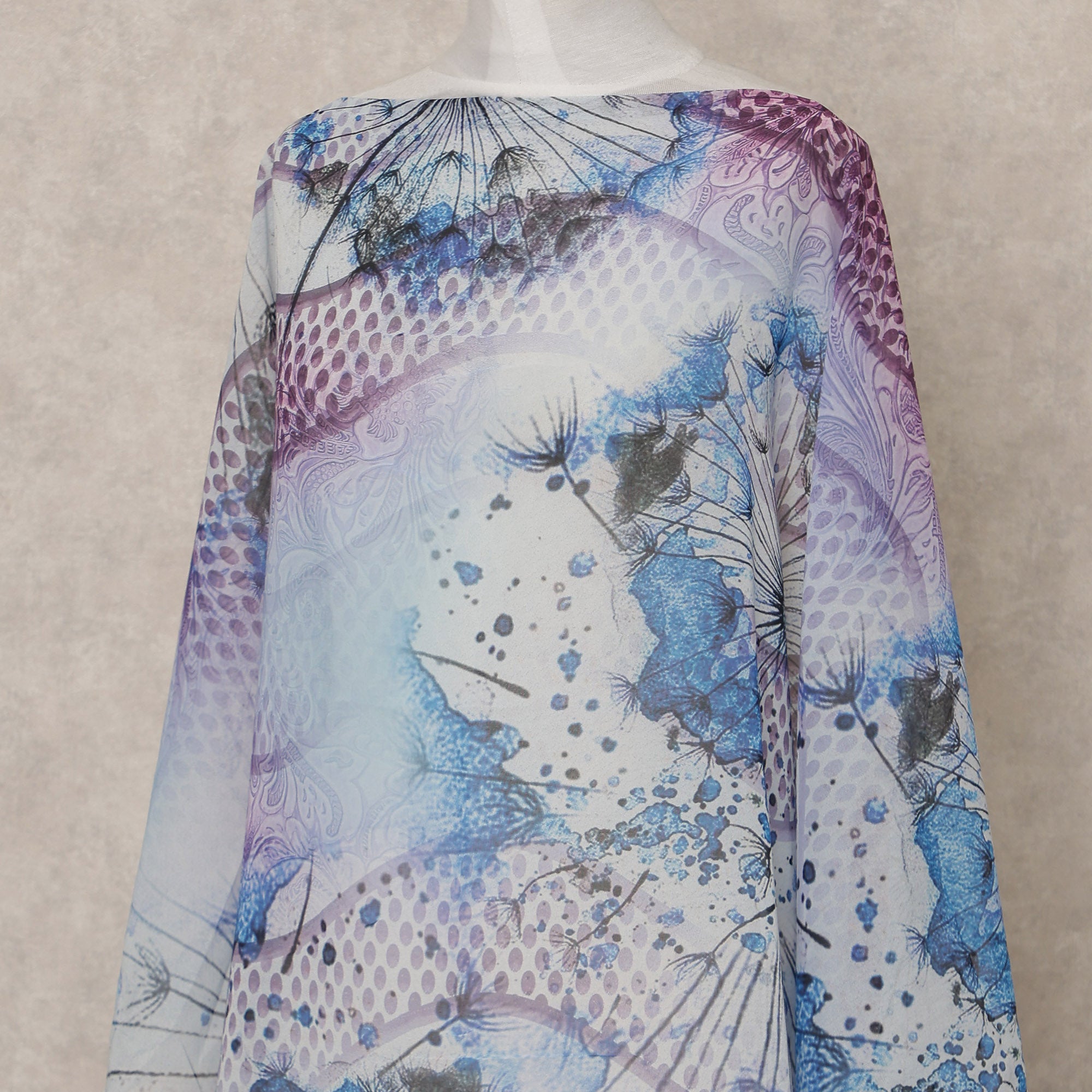 This blue and purple Somali cotton voile dirac fabric showcases a graceful blend of soft gradient tones, abstract motifs, and... Read more Read more