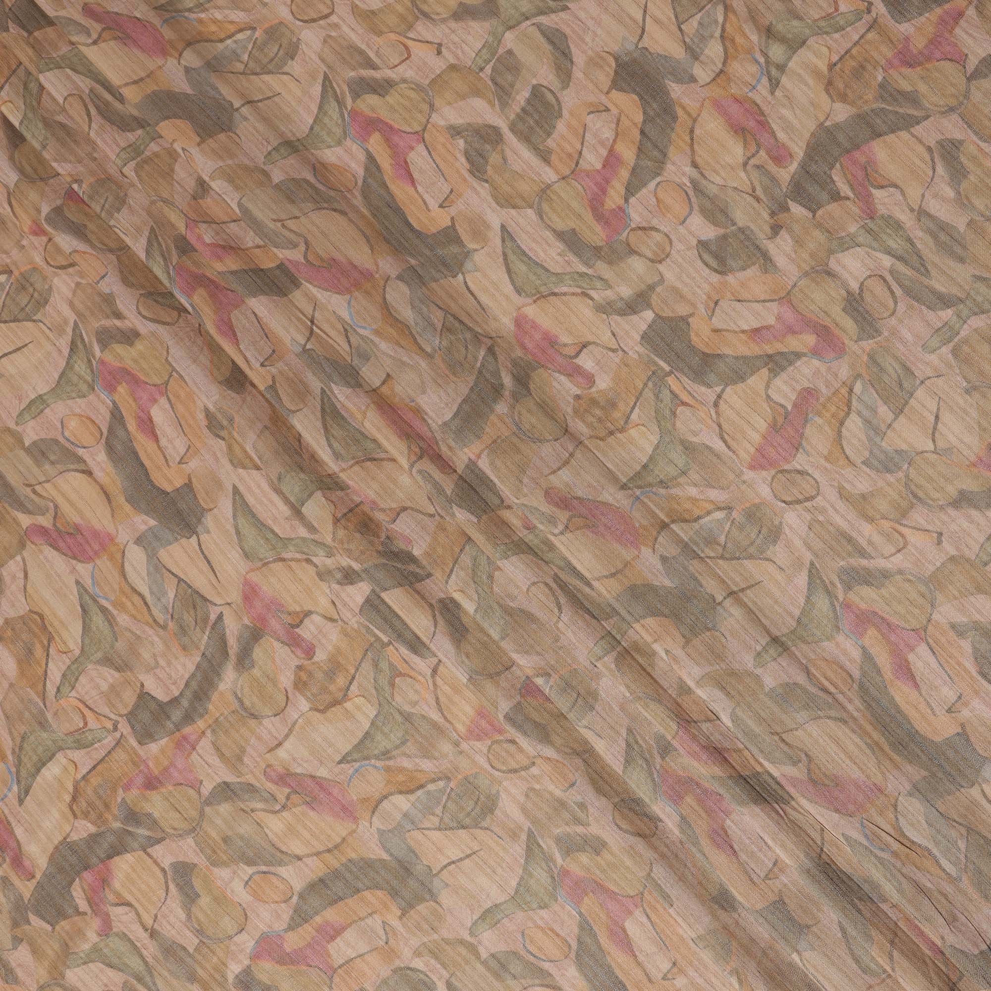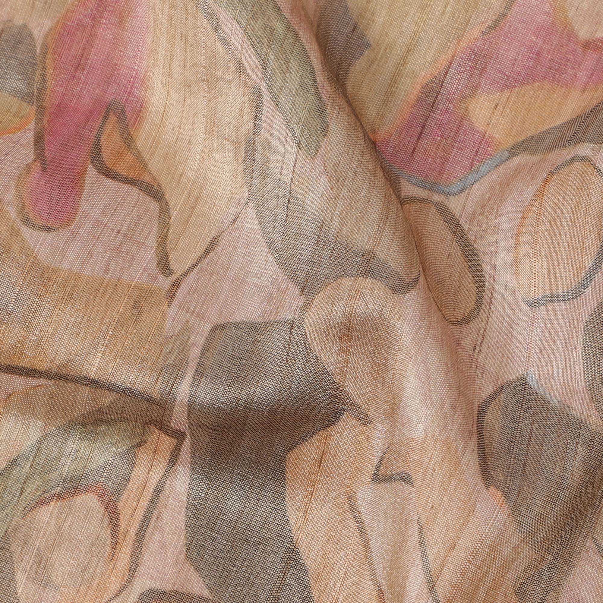 Blush Beige Base Abstract Pink Olive and Charcoal Printed Artistic Viscose Tussar Fabric with Subtle Self Stripes, 110 Cms Width, Made in India-D24359