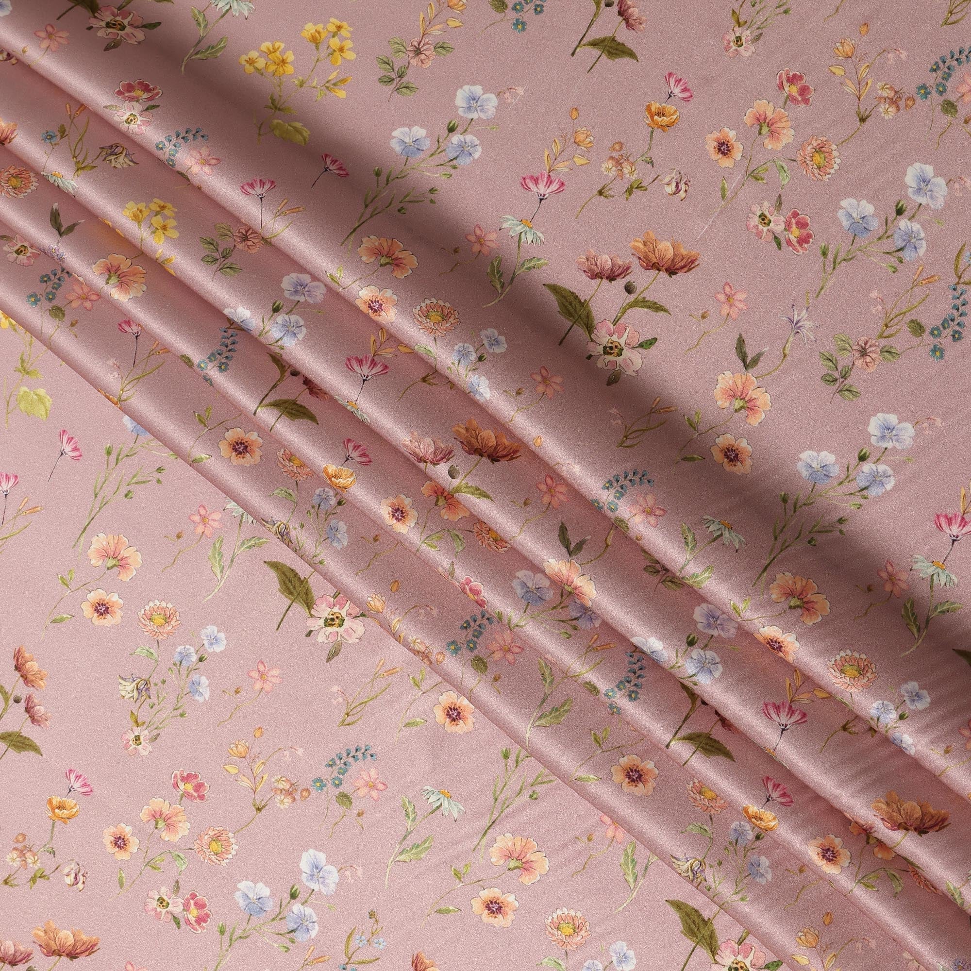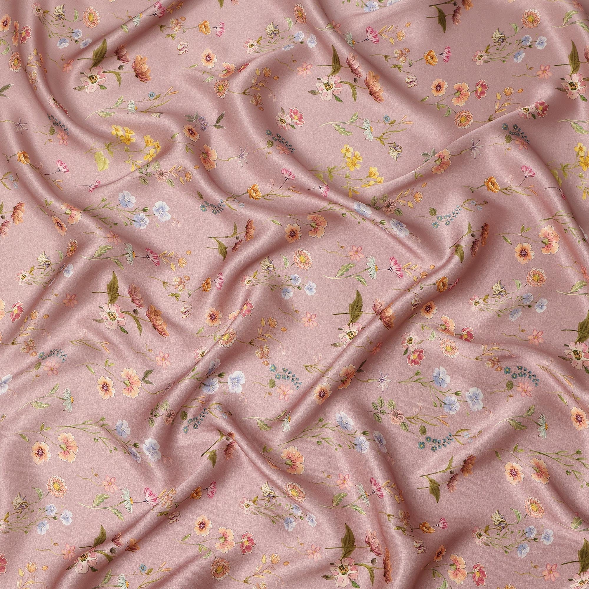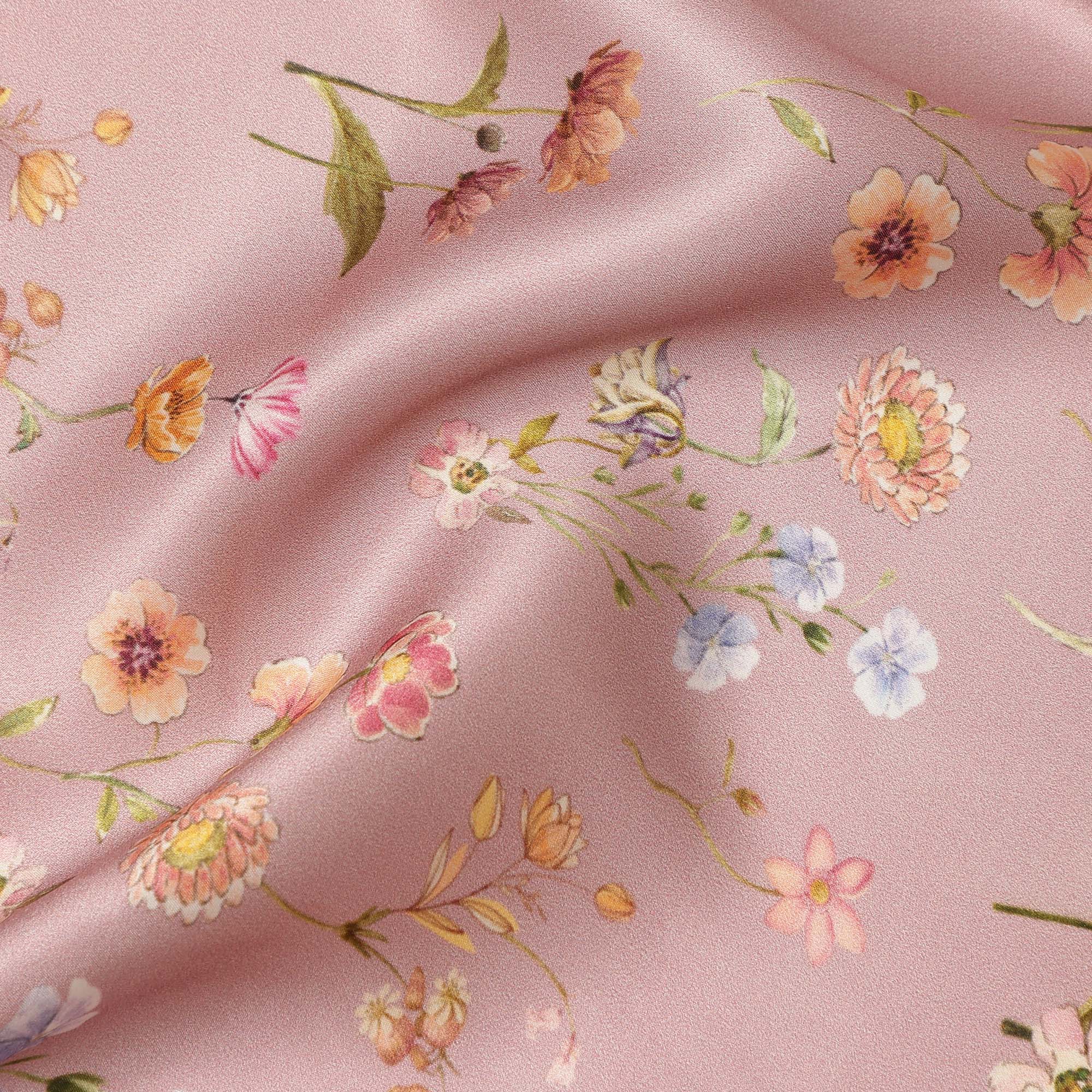 Blush Pink Delicate Floral Allover Printed Premium Pure Silk Satin Fabric, 110 Cms, India-D27086