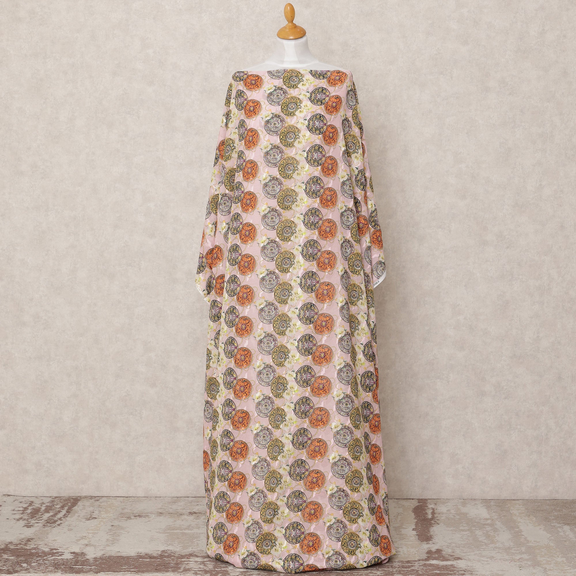Unveil a blend of softness and intricacy with this blush pink Somali cotton voile embroidery fabric, beautifully accented with multicolor circular motifs in tones of saffron orange, olive green, lavender grey, and mustard yellow. This 3.5-meter fabric is crafted in India from premium cotton voile known for its ultra-lightweight and breathable qualities, while the delicate embroidery adds depth and textural richness to the design. Perfectly suited for abayas, hijabs, tunics, or festive wear, the subtle base color allows the ornate motifs to shine, making it an ideal choice for statement pieces rooted in cultural elegance. With a width of 140 cm, it provides generous room for creative tailoring, ensuring comfort, grace, and style in every fold. Whether for daily modest wear or special occasions, this fabric blends Indian craftsmanship with Somali tradition seamlessly. Buy online now and bring home embroidered charm with timeless appeal. Shop online for fabric that feels as graceful as it looks.
