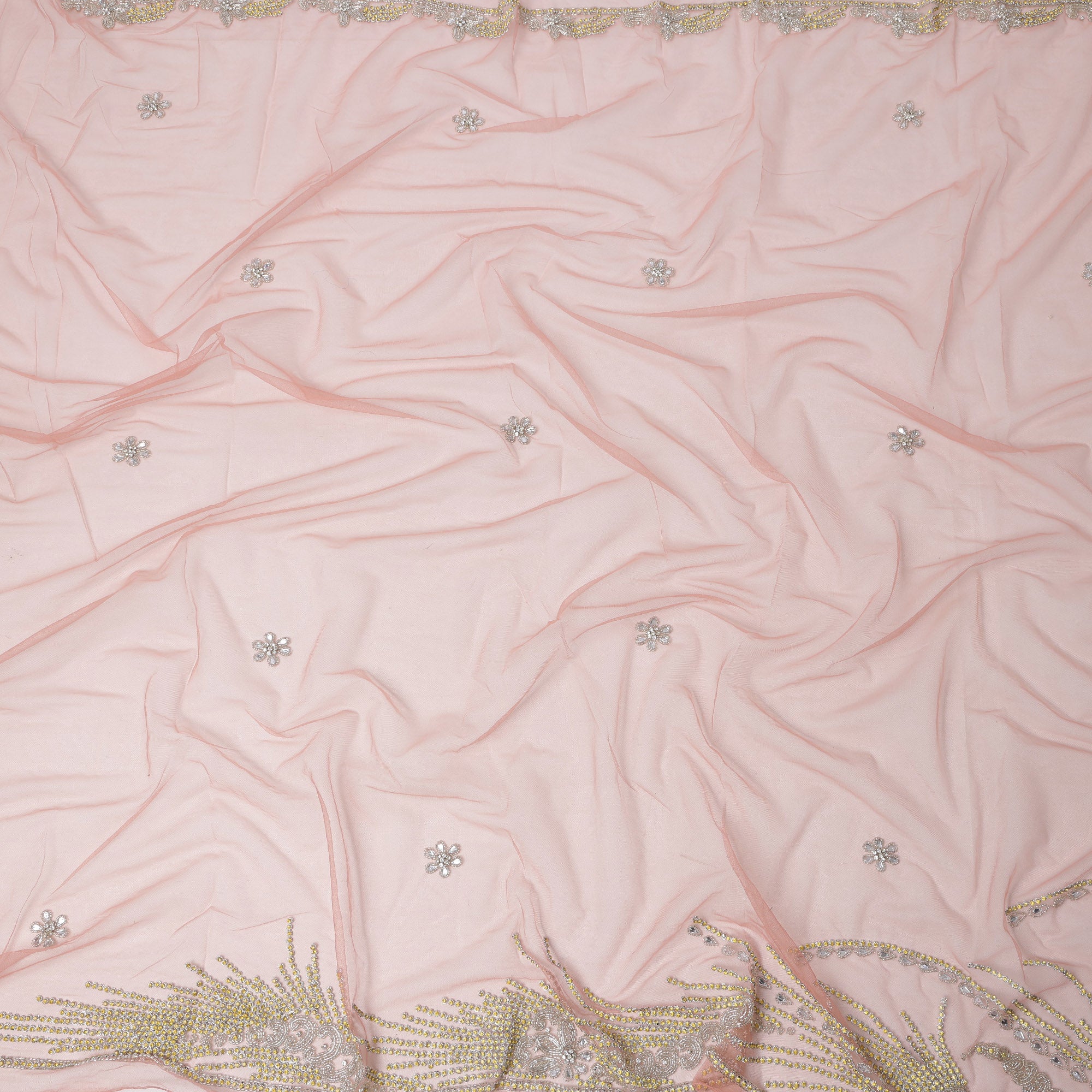 Blush Pink Embroidered Nylon Tulle Fabric with Floral Sequin Butis and Gold-Silver Beaded Border Work, 140 cm Width, Made in India-D23492