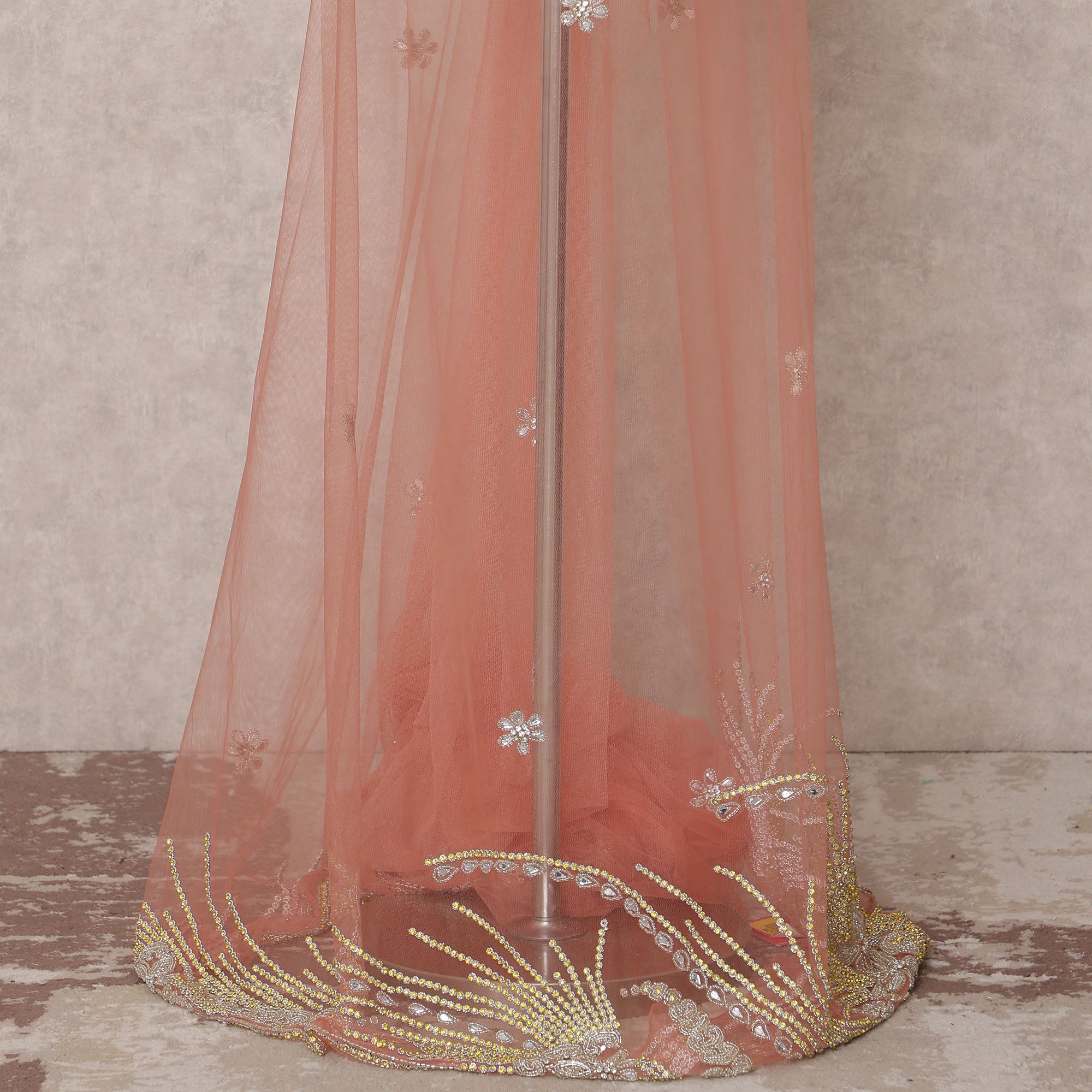 This Blush Pink Nylon Tulle Fabric brings together soft elegance and intricate embellishment, making it a timeless choice for bridal and festive couture. The fabric body is decorated with scattered floral butis created from shimmering sequins and delicate beads, while the lower edge showcases a luxurious border featuring golden and silver beadwork arranged in radiant, flame-like motifs. Crafted from fine, lightweight nylon tulle, this fabric ensures a beautiful drape and a translucent finish, perfect for dupattas, lehengas, and overlays. With a width of 140 cm and offered in a 3-meter length, it provides generous fabric coverage. Handcrafted in India, this piece exudes refined charm and cultural artistry. Shop online to enrich your ethnic wardrobe with a delicate yet impactful fabric.