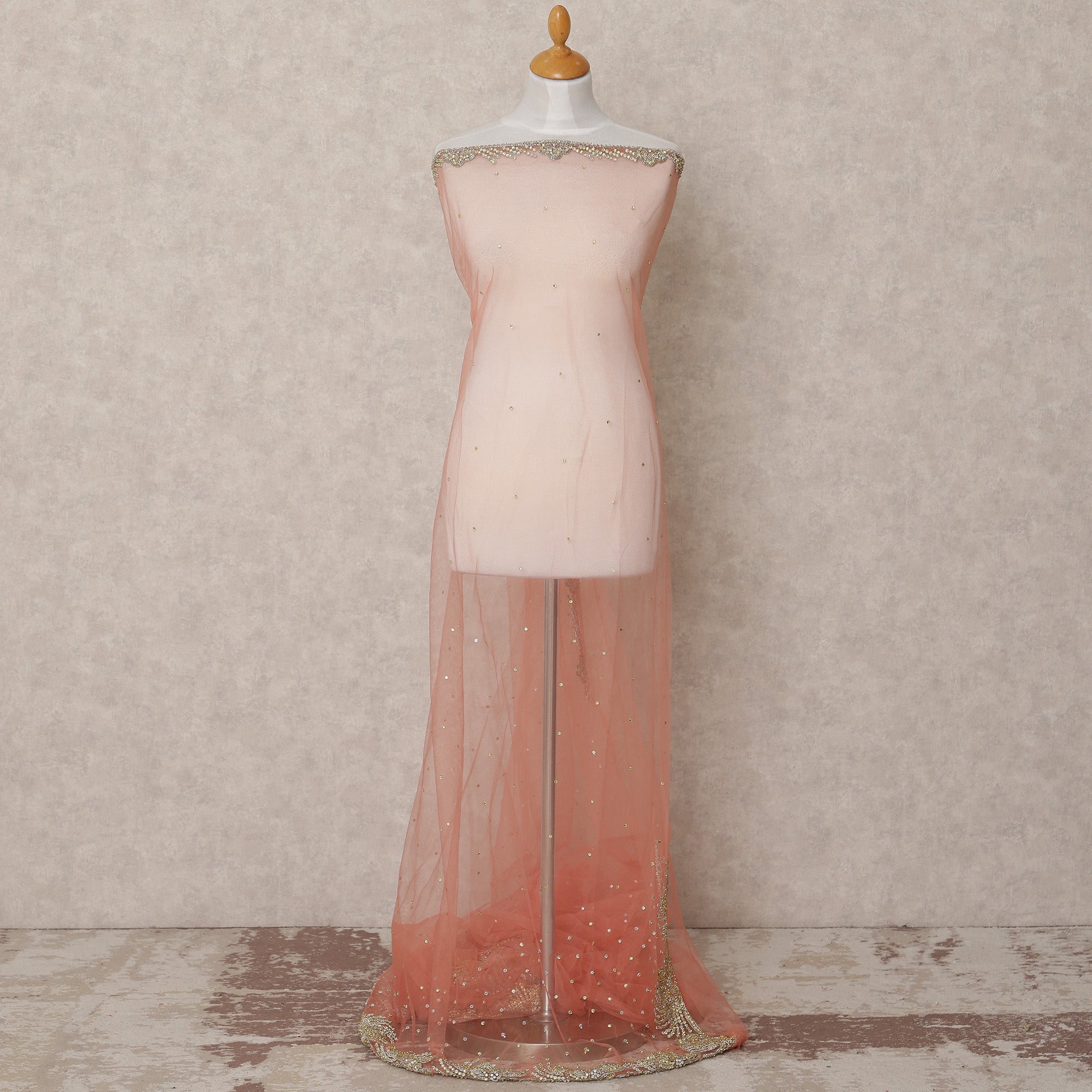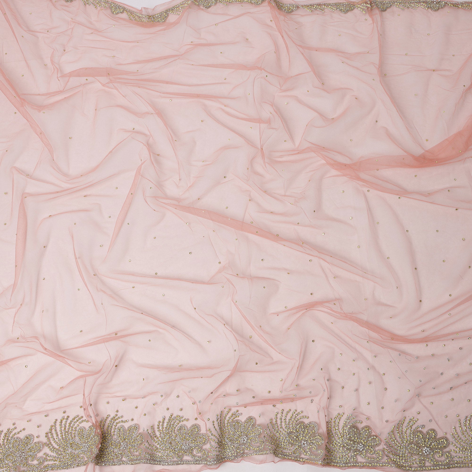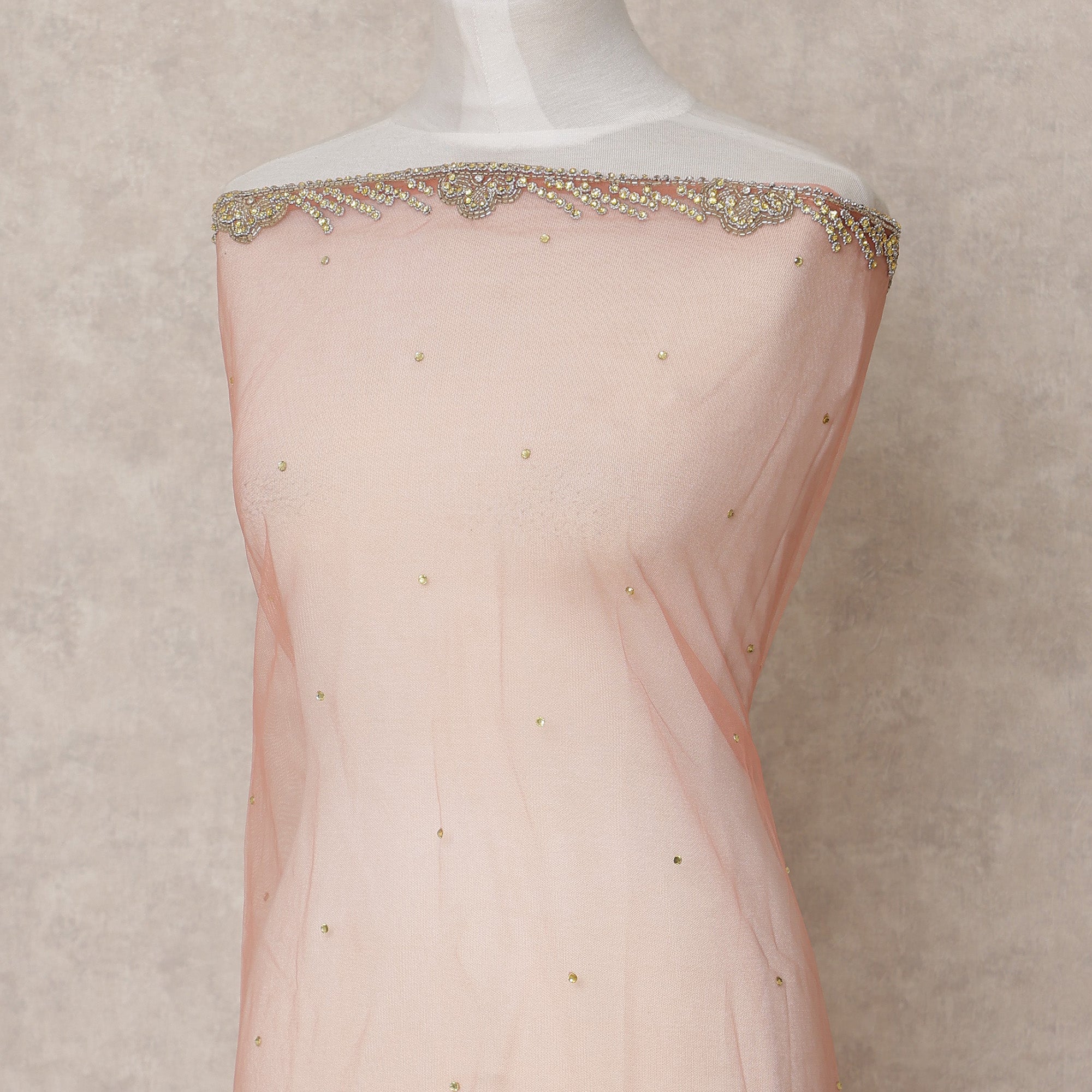 This Blush Nude Nylon Tulle Fabric exudes refined elegance through its delicate sequin scatter work that lightly shimmers across the sheer surface, creating a soft, glowing effect. The fabric is accentuated by a richly embroidered border composed of floral motifs crafted with intricate bead and gold sequin embroidery, forming a luxurious scalloped finish. Lightweight and breathable, this nylon tulle drapes fluidly, making it ideal for bridal dupattas, lehenga borders, or graceful overlays. Measuring 140 cm in width and offered in a 3-meter cut, this fabric is a versatile and elegant choice for ethnic couture. Handcrafted in India, it is a celebration of traditional craftsmanship and understated luxury. Shop online for timeless fabric that speaks sophistication.