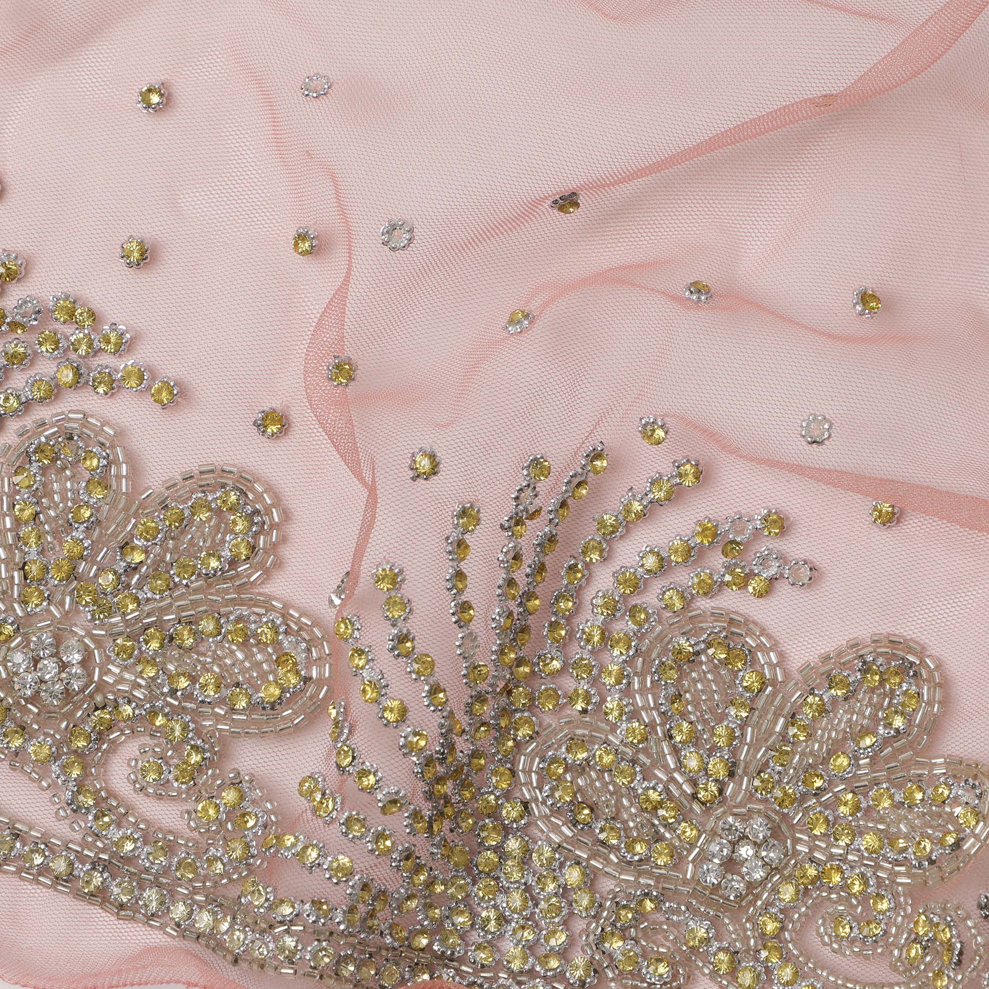 Blush Pink Embroidered Nylon Tulle Fabric with Gold Sequin Scatter Work and Floral Beaded Border, 140 cm Width, Made in India-D23499