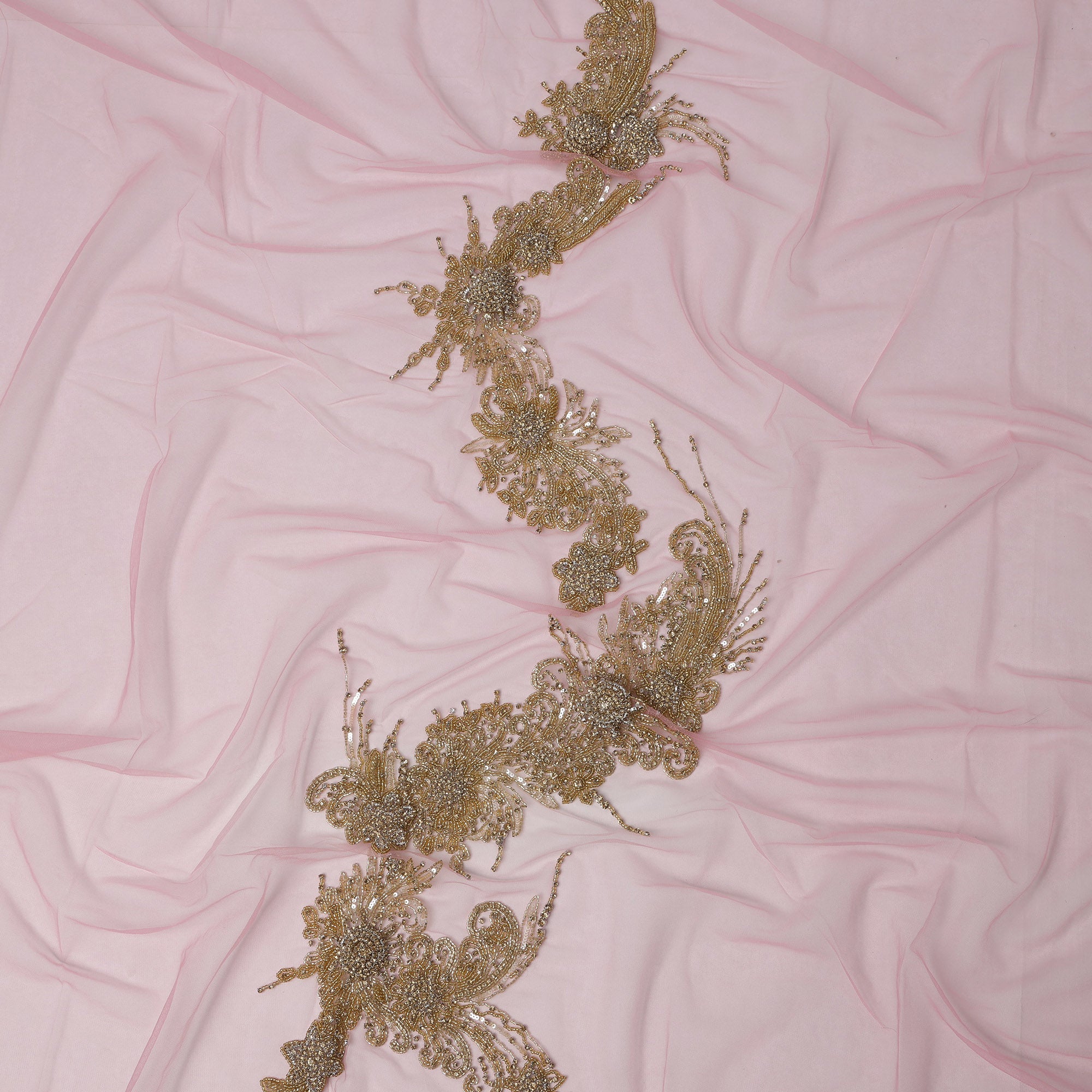 Make a dramatic style statement with this Blush Pink Net Fabric, adorned with luxurious antique gold embroidery. Crafted to captivate, this fabric features a stunning cascading floral design in intricate zardozi-style sequin, thread, and beadwork that runs in an elegant serpentine motif. The delicate blush pink net base offers a soft, feminine contrast to the bold metallic embellishments, making it a perfect choice for high-end designer sarees, lehenga dupattas, cocktail gowns, and couture outfits. Measuring 140 cm in width and sold in a 3-meter length, this lightweight net fabric effortlessly combines traditional craftsmanship with a modern silhouette. Whether you're designing a bridal statement or a red-carpet-worthy ensemble, this embroidered net fabric is a regal addition to your collection. Buy online to infuse elegance and opulence into your creations.