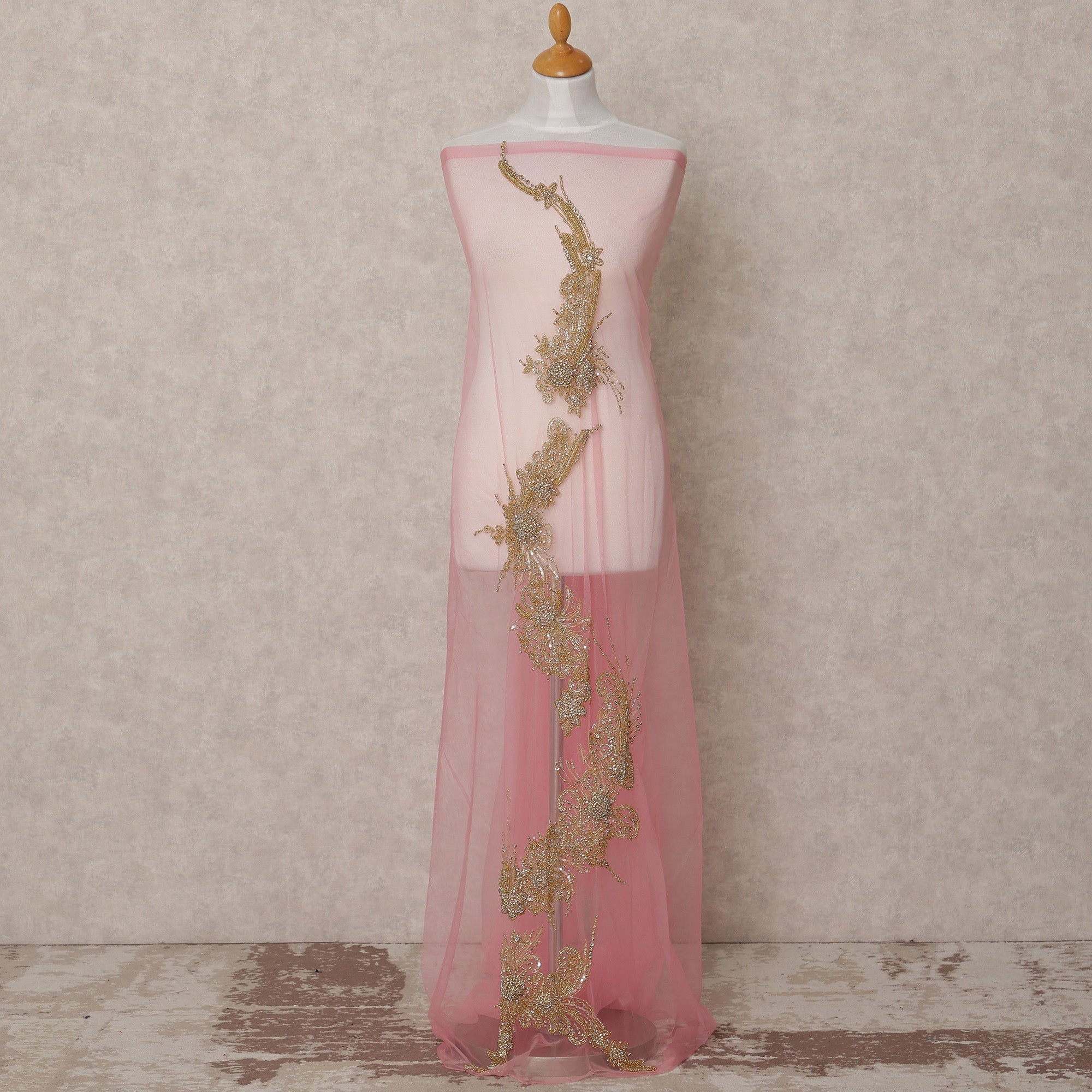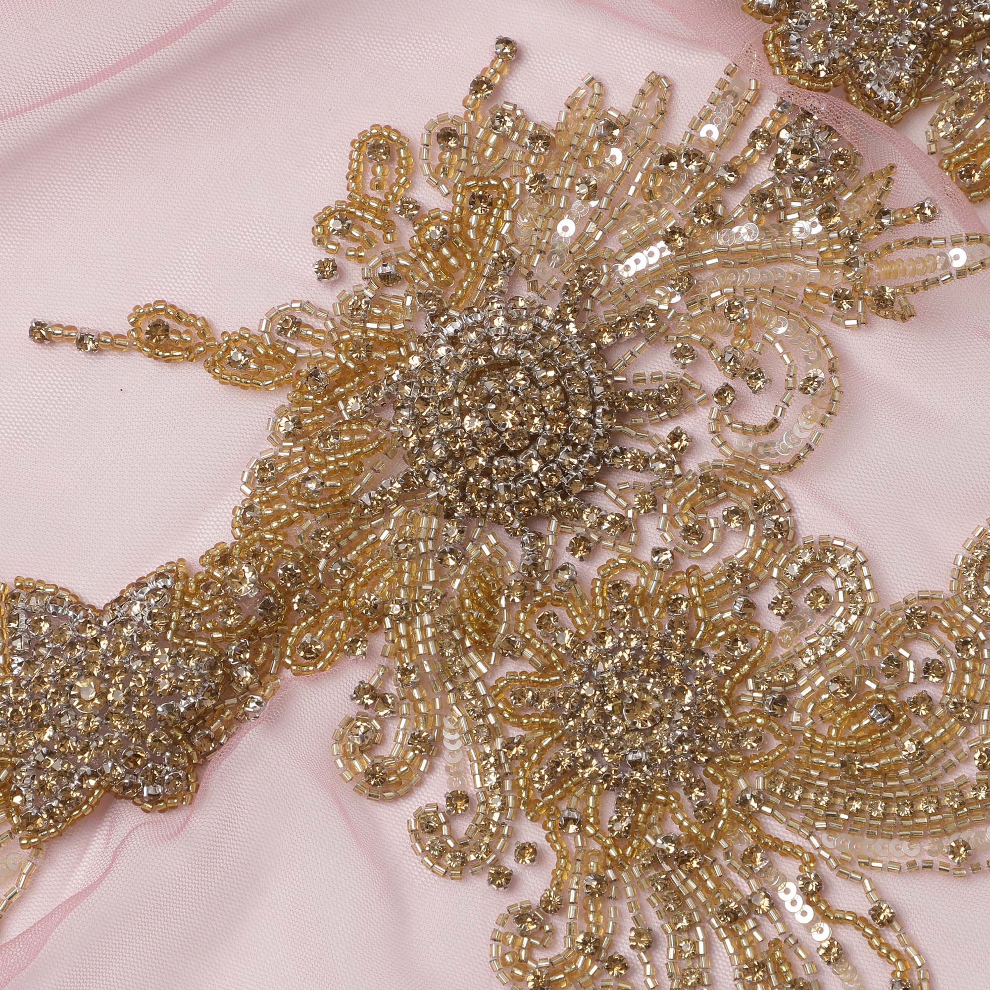 Blush Pink Net Fabric with Antique Gold Sequin & Bead Floral Work – 140 cm Width-D23508