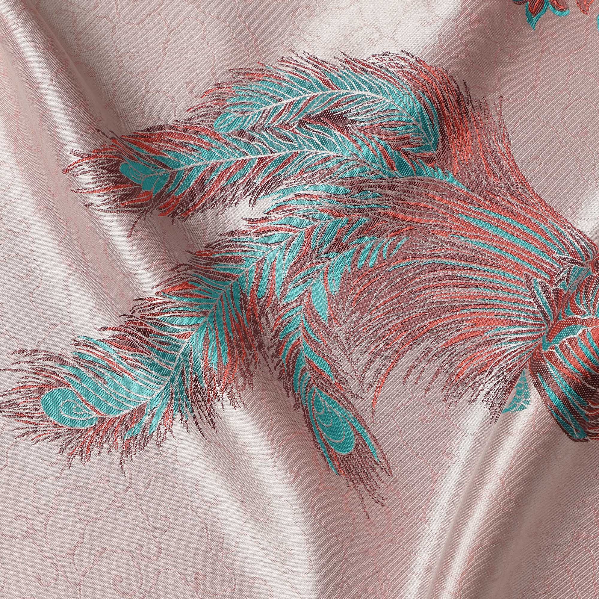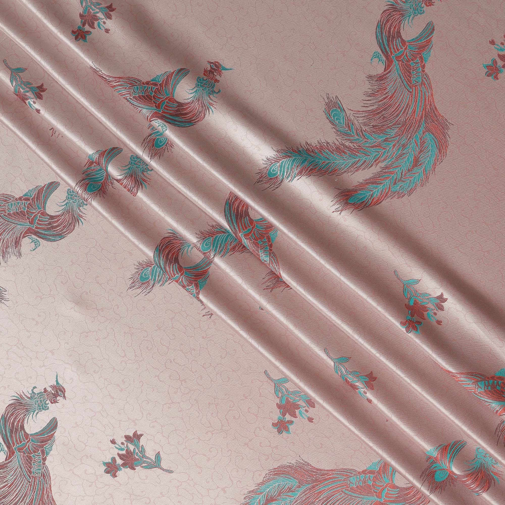 Blush Pink Peacock Motif Printed Premium Pure Silk Satin Fabric, 110 Cms, China-D27073