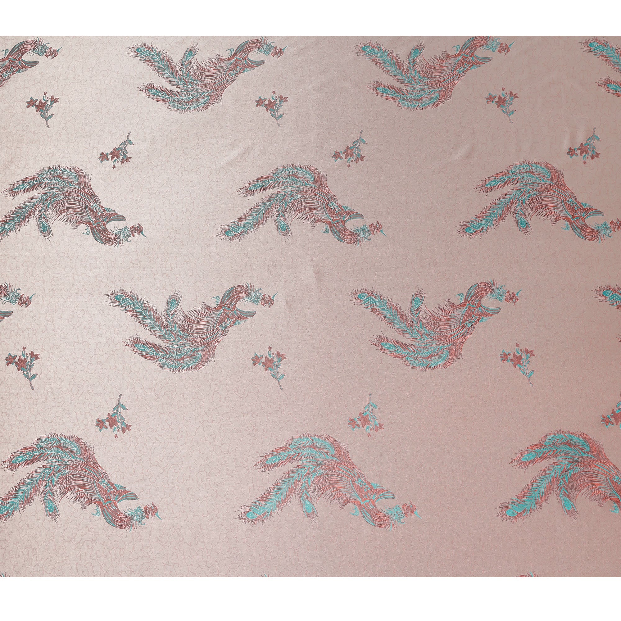 Soft blush pink base highlighted with elegant peacock motif print for a luxurious aesthetic.
