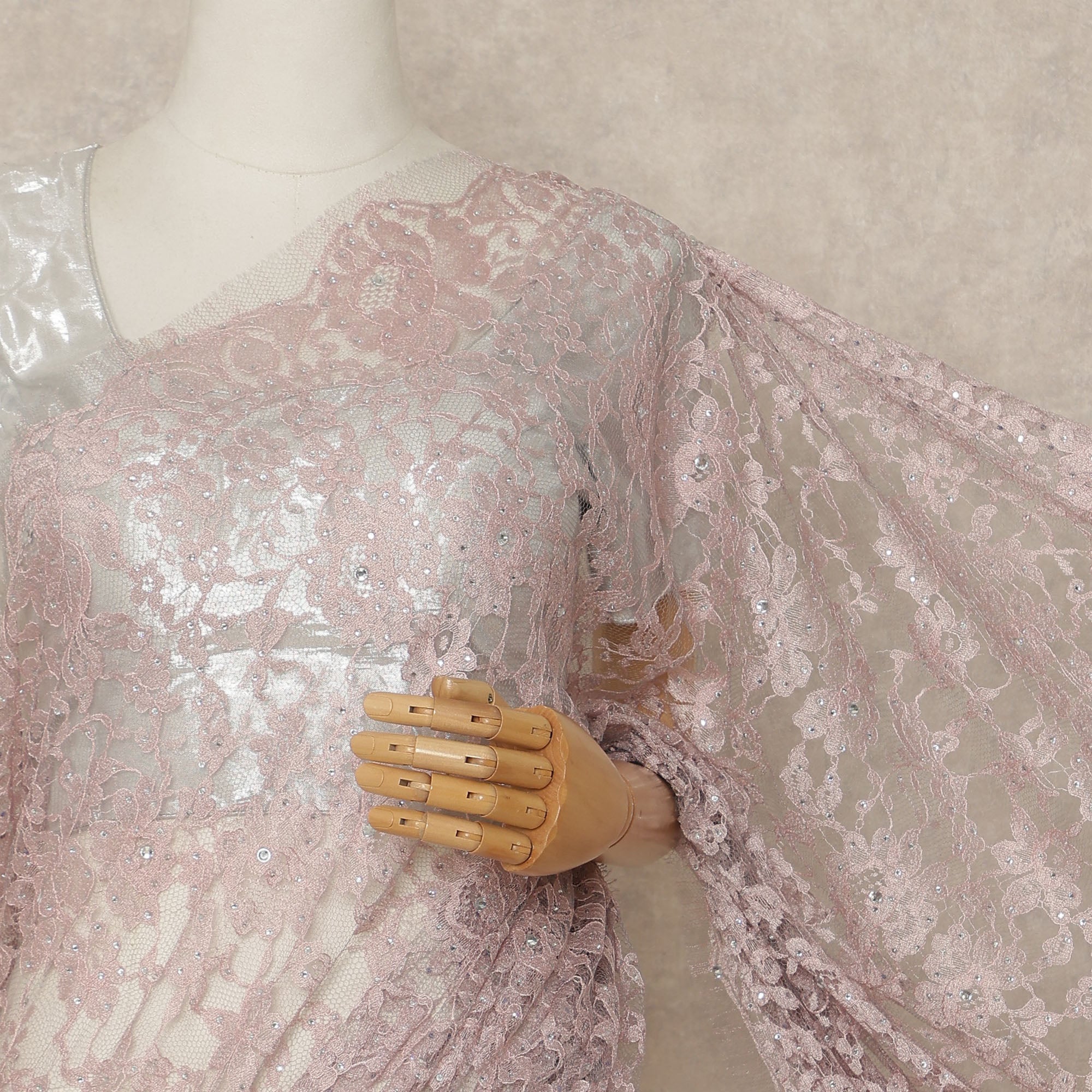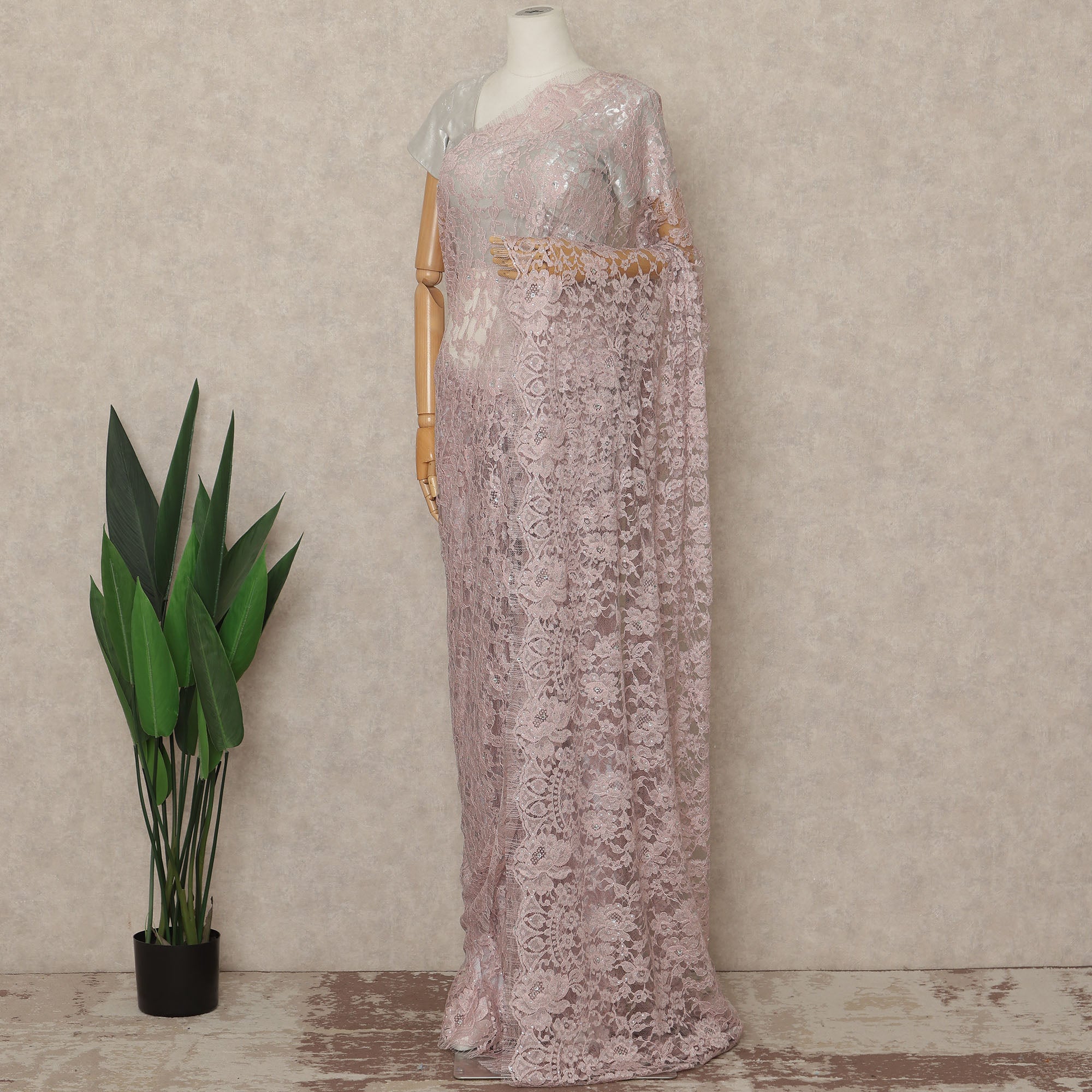 This blush pink premium French Chantilly saree lace with stone work is an elegant and delicate lace fabric crafted in France, featuring intricate floral Chantilly patterns enhanced with subtle stone embellishments for a soft, refined sparkle. The lace has a lightweight, breathable net base that drapes beautifully, making it ideal for luxurious sarees, couture ensembles, and special occasion wear. Supplied as a single continuous piece of approximately 5.5 meters with a generous 110 cms width, it allows seamless pleating and graceful flow while maintaining a sophisticated, non-metallic finish. Blouse not included.