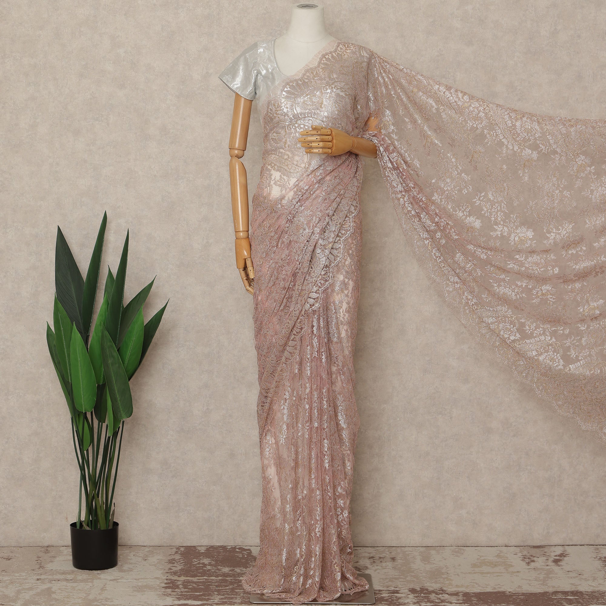 Premium French Chantilly lace with blush pink metallic finish for a soft and luxurious look
