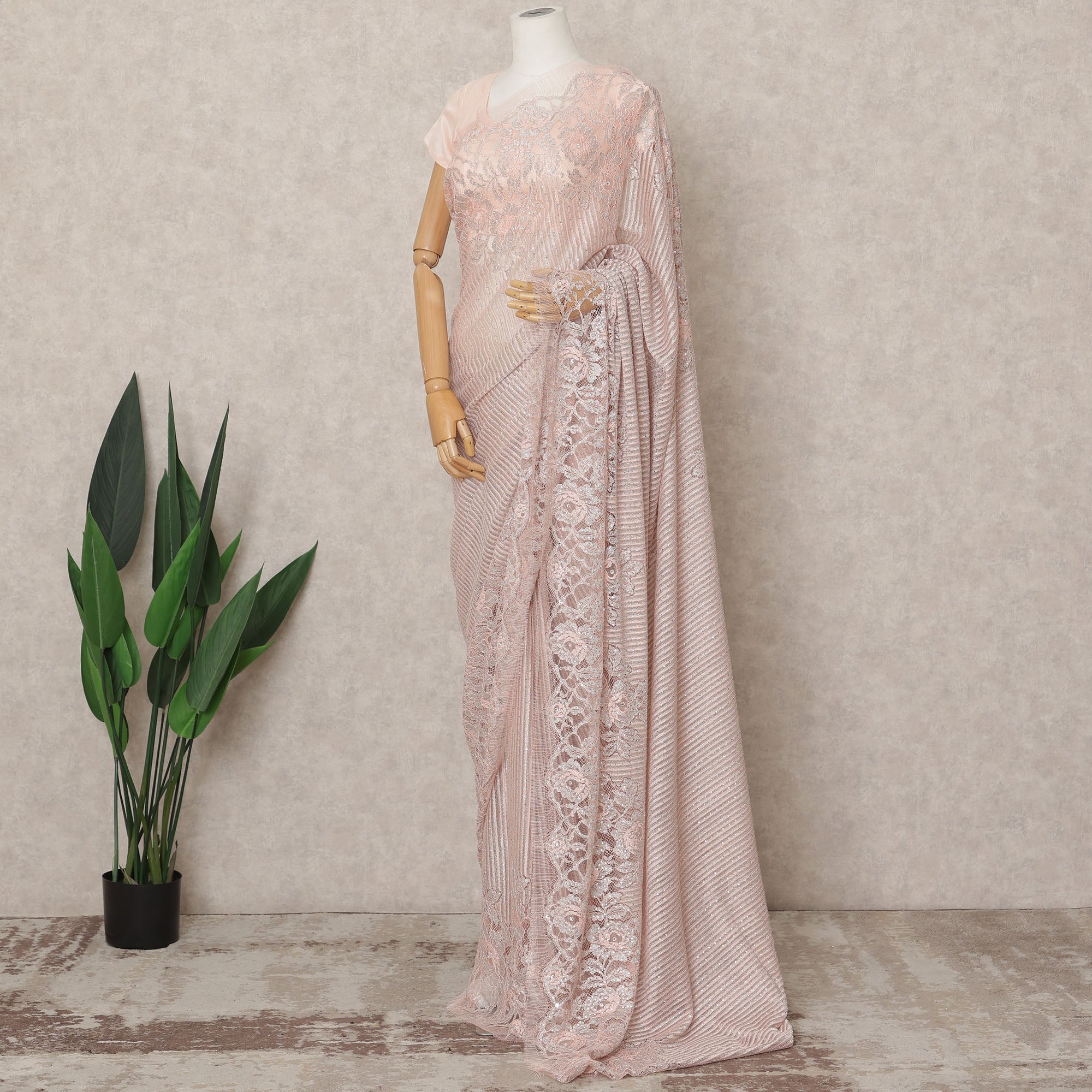 Blush Pink Premium Metallic Chantilly Lace Saree with Stone Work, 5.5 Meters Length, 110 Cms Width, Made in France-D23886