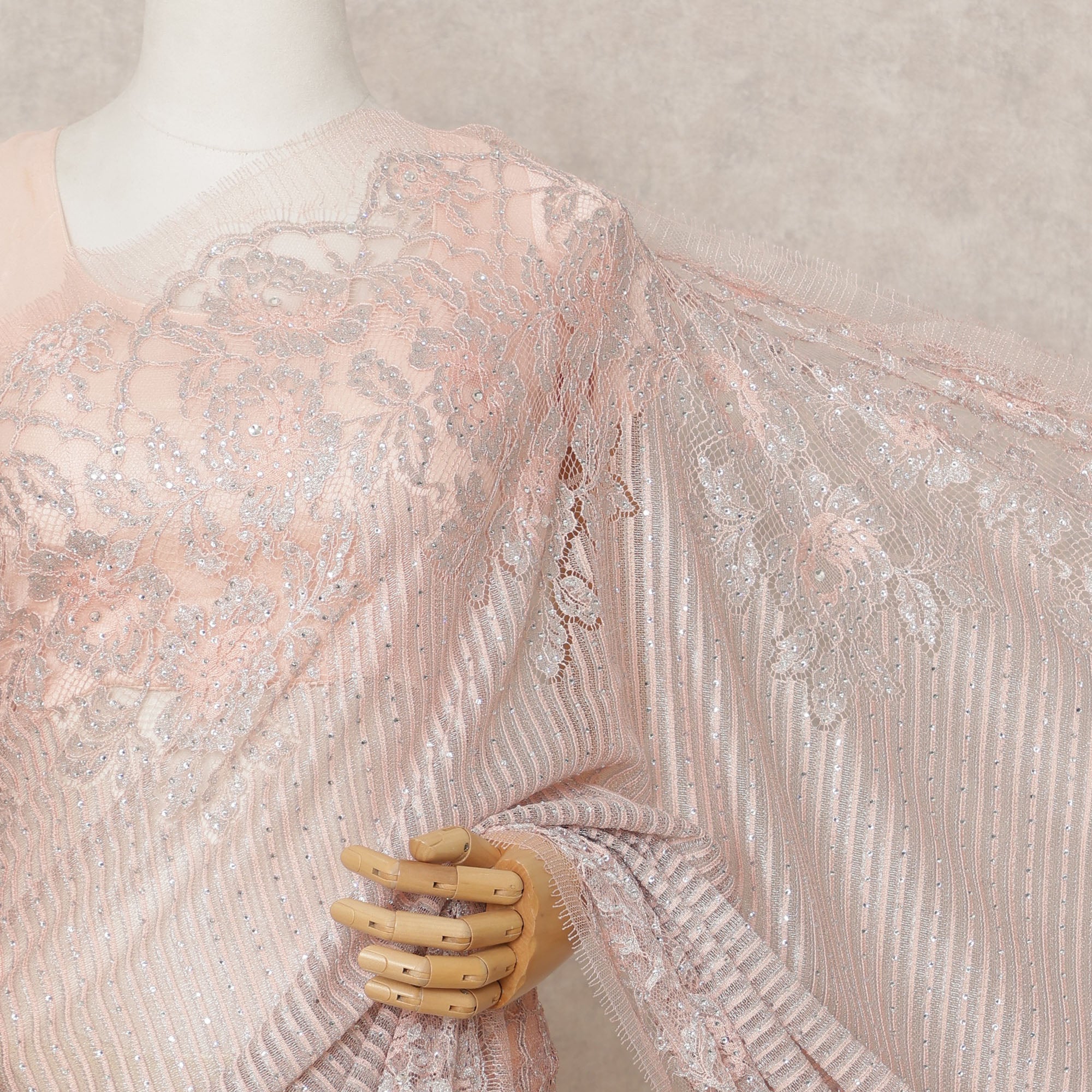 Crafted from blush pink Chantilly lace with soft metallic striped finish