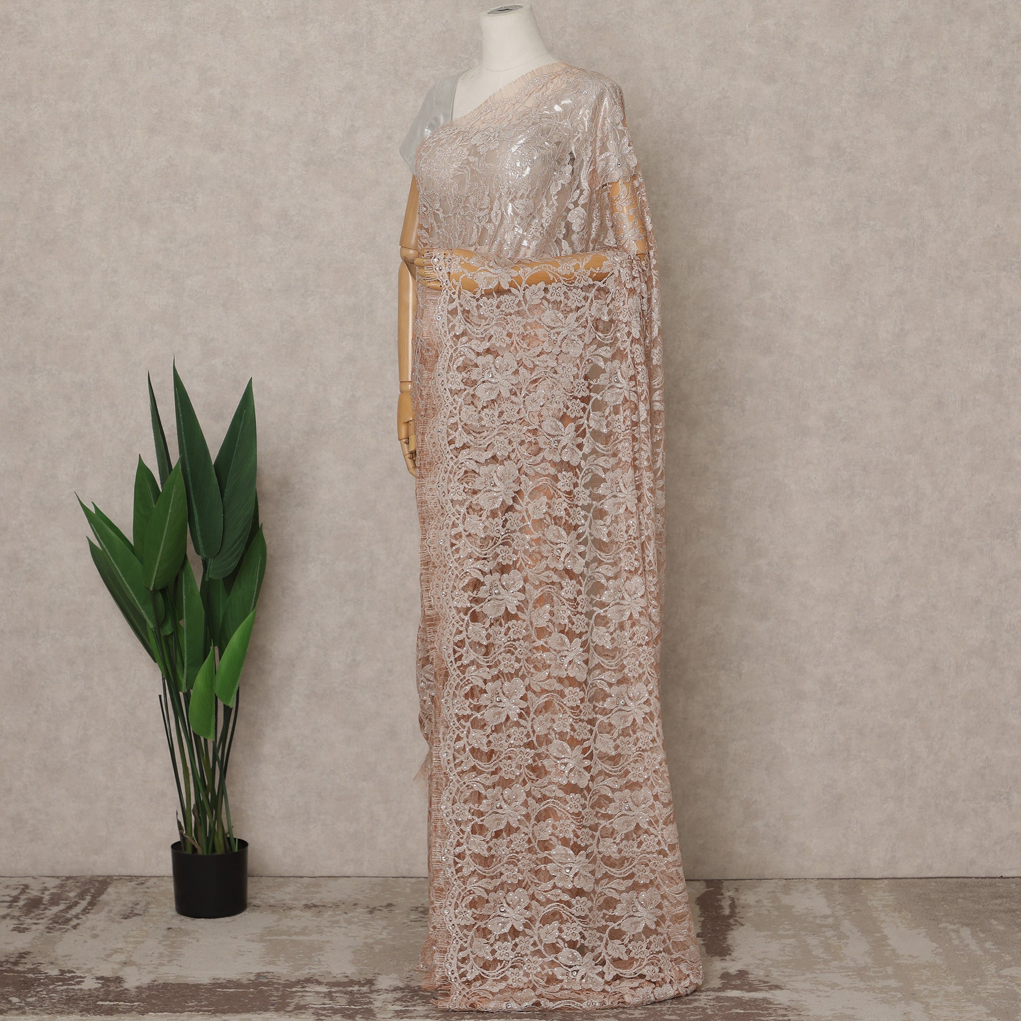 This Blush Rose Premium French Chantilly Lace Saree with Stone Work captures the essence of delicate femininity blended with opulent craftsmanship, featuring a soft blush-rose tone illuminated by shimmering metallic lacework meticulously woven in France using authentic Chantilly techniques. The saree showcases intricate floral and vine motifs that glisten beautifully across the fabric, lending a sophisticated, couture-inspired elegance ideal for weddings, receptions, cocktail nights, festive celebrations, and sophisticated evening events. Despite its luxurious sheen and detailed artistry, the saree remains feather-light and incredibly comfortable, draping effortlessly with its generous 5.5-meter length and 110 cm width that allow smooth pleating and graceful movement. The transparent lace overlay enhances its romantic aura, adding depth and fluidity without compromising comfort. Crafted with Regal-quality precision, this saree offers lasting durability while preserving the delicate beauty of its metallic threadwork when cared for with gentle dry-clean maintenance. Pair it with a blush, rose-gold, champagne, or metallic blouse to elevate its soft radiance. Shop online and buy online to experience the charm of true French craftsmanship, intricate lace artistry, and modern blush-rose elegance captured in this exquisite Chantilly lace saree. (Blouse not included)