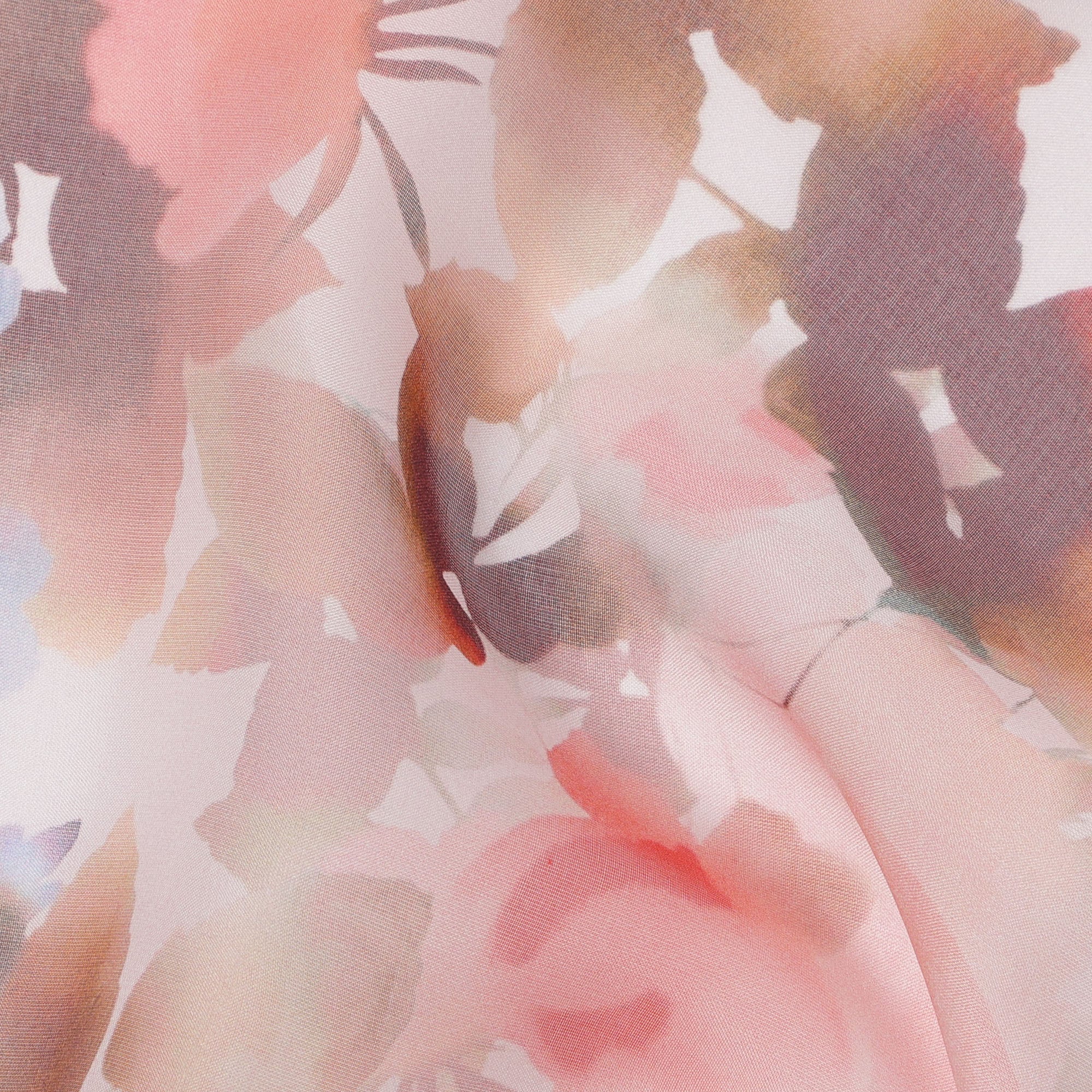 Blush White Base Rose Garden Blurred Floral Printed Pure Silk Chiffon Fabric, 110 Cms Width, Made in South Korea-D24014
