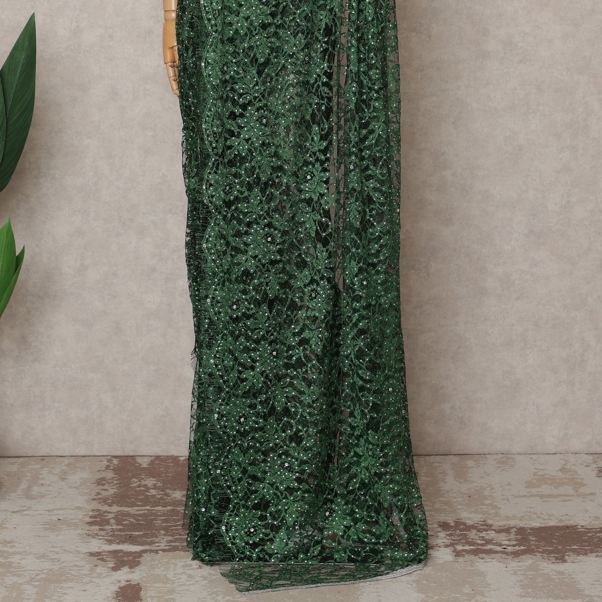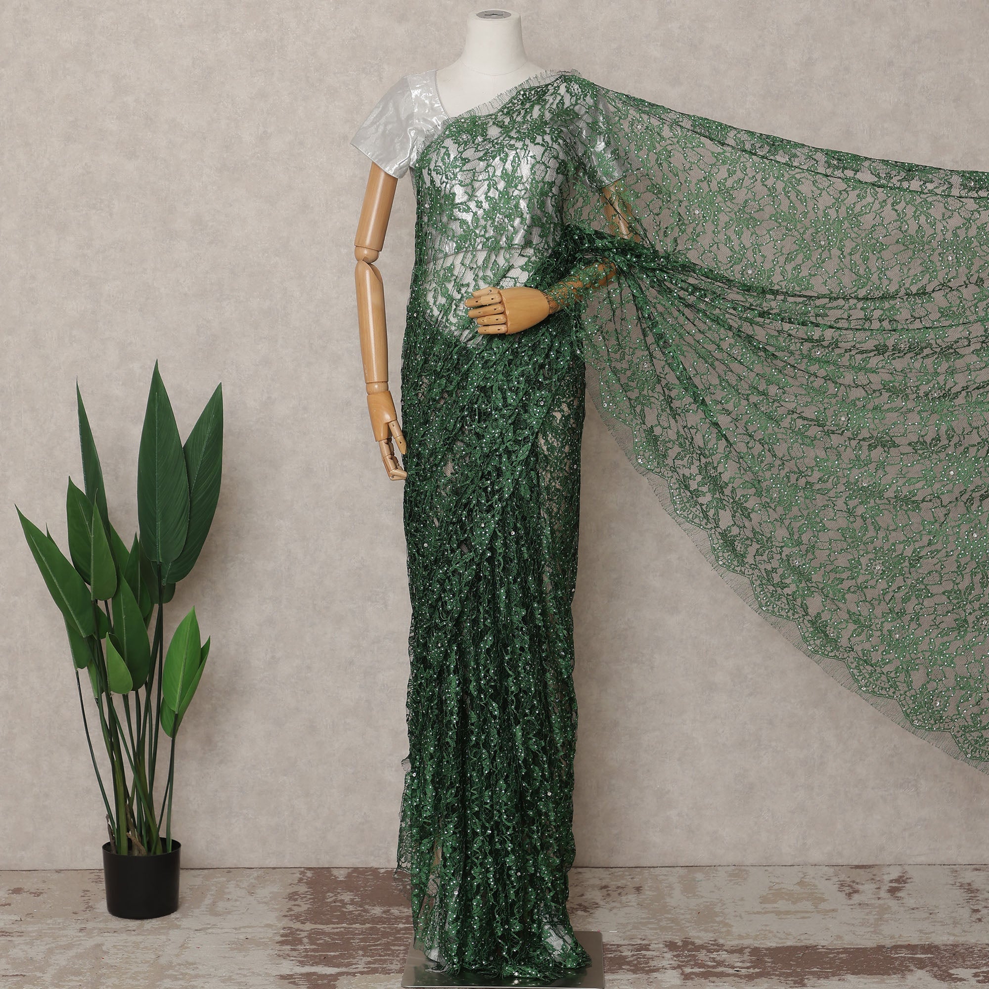 Bottle Green Premium French 2-Tone Chantilly Lace Saree with Stonework, 5.5 Mtrs with 110 Cms Width, Imported from France-D25426