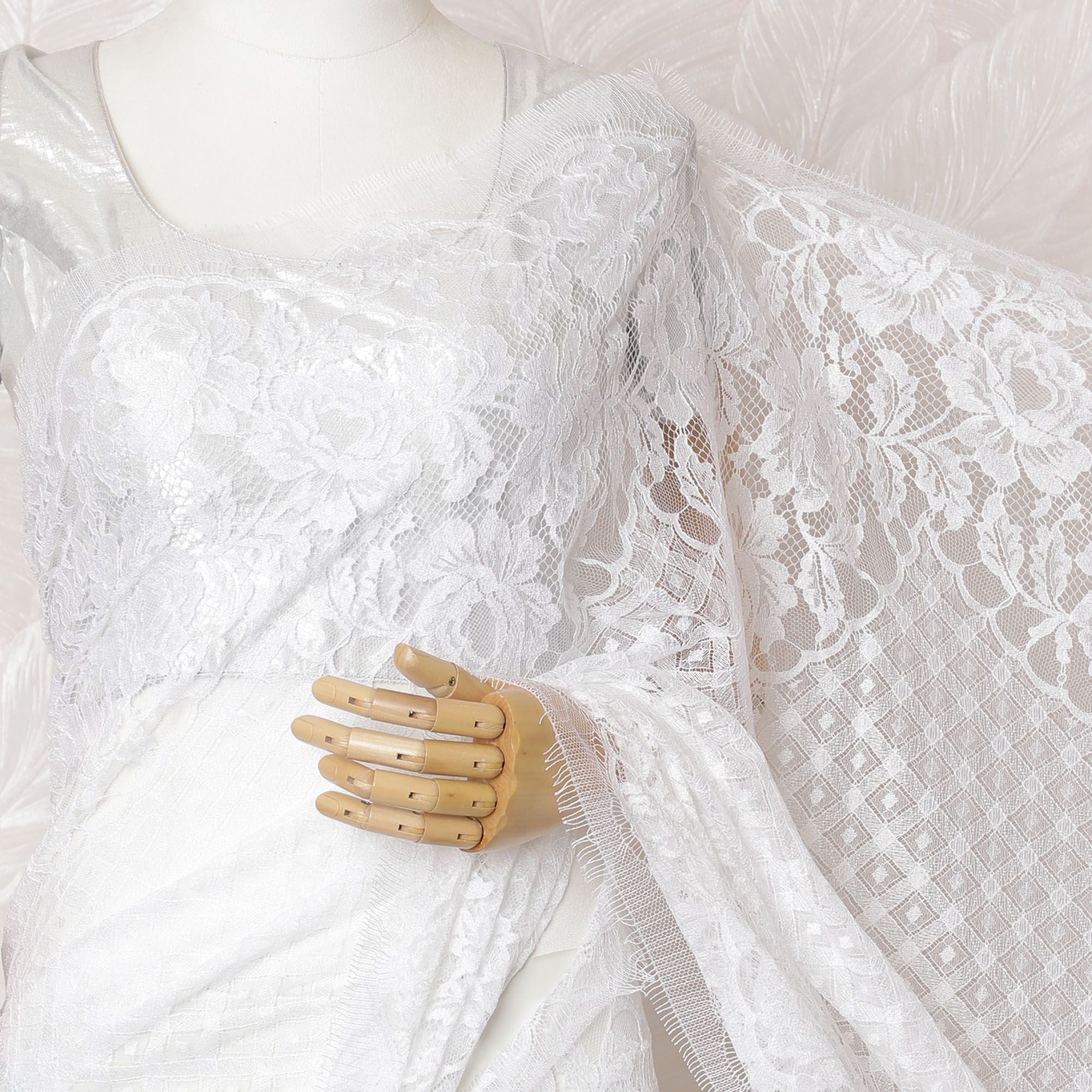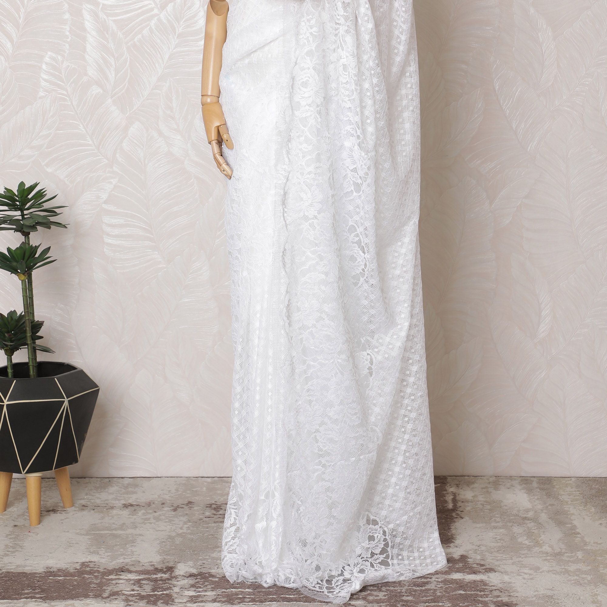 Bridal White French Chantilly Lace Saree - 110cm Width, 5.5M Length-D18830
