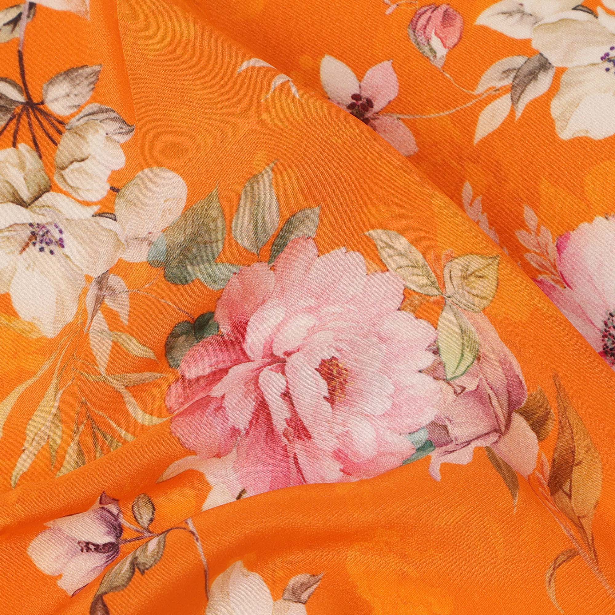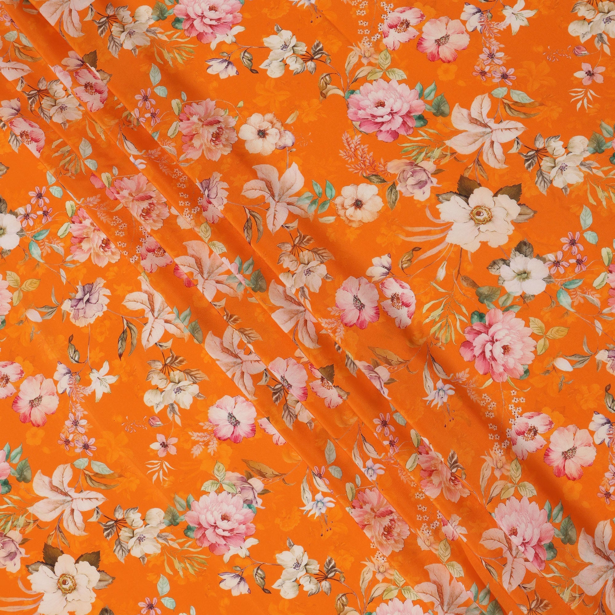 Bright Orange Base Multicolor Botanical Bloom Printed Pure Silk Crepe Fabric, 110 Cms Width, Made in India-D23967