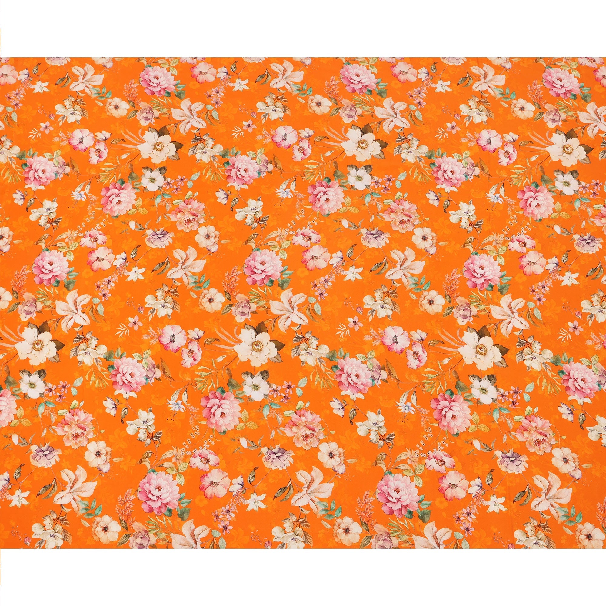 Infuse vibrancy and elegance into your wardrobe with this Bright Orange Base Multicolor Botanical Bloom Printed Pure Silk Crepe Fabric,... Read more Read more