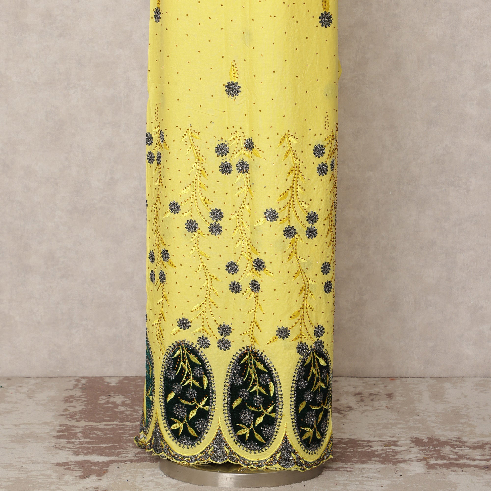 Step into the spotlight with this vibrant bright yellow blended cotton fabric, gracefully accented with delicate blue floral embroidery and an elaborate scalloped border in rich green and navy. Crafted with premium quality cotton blend, this fabric offers a breathable, soft texture ideal for festive outfits and traditional wear. The design features small dotted patterns interspersed with embroidered florals throughout the body, while the lower edge showcases grand embroidery with arched leaf motifs, making it visually stunning for sarees, kurtis, or designer suits. With a width of 130 cms and a length of 3.0 meters, it allows ample room for versatile styling and easy tailoring. Made in India with a focus on fine craftsmanship, this fabric brings together cultural richness and contemporary brightness, making it perfect for festive and celebratory ensembles. Shop online now and buy this eye-catching fabric to create show-stopping ethnic wear with ease and elegance.