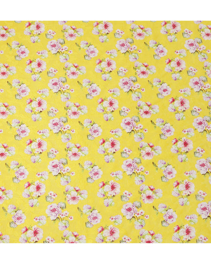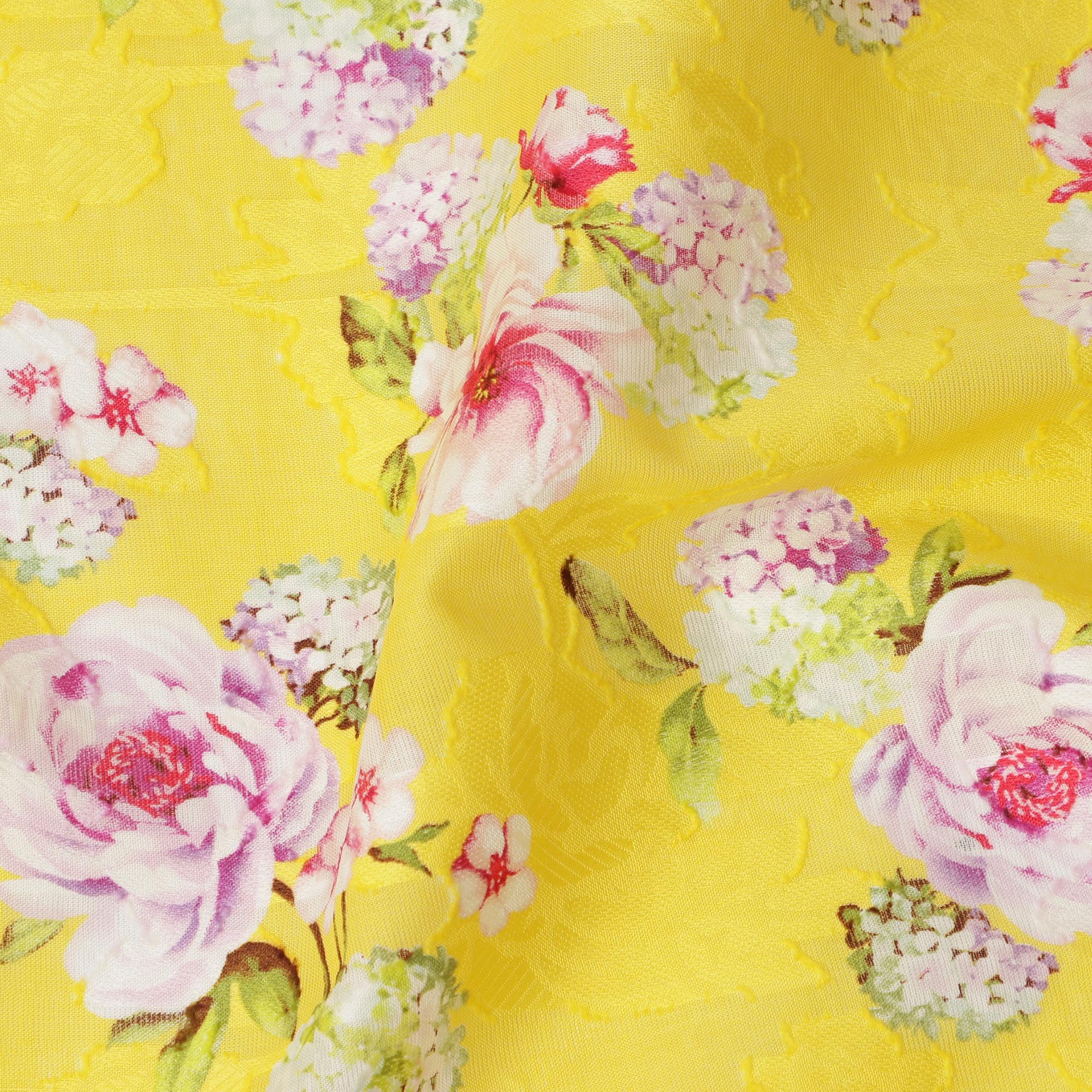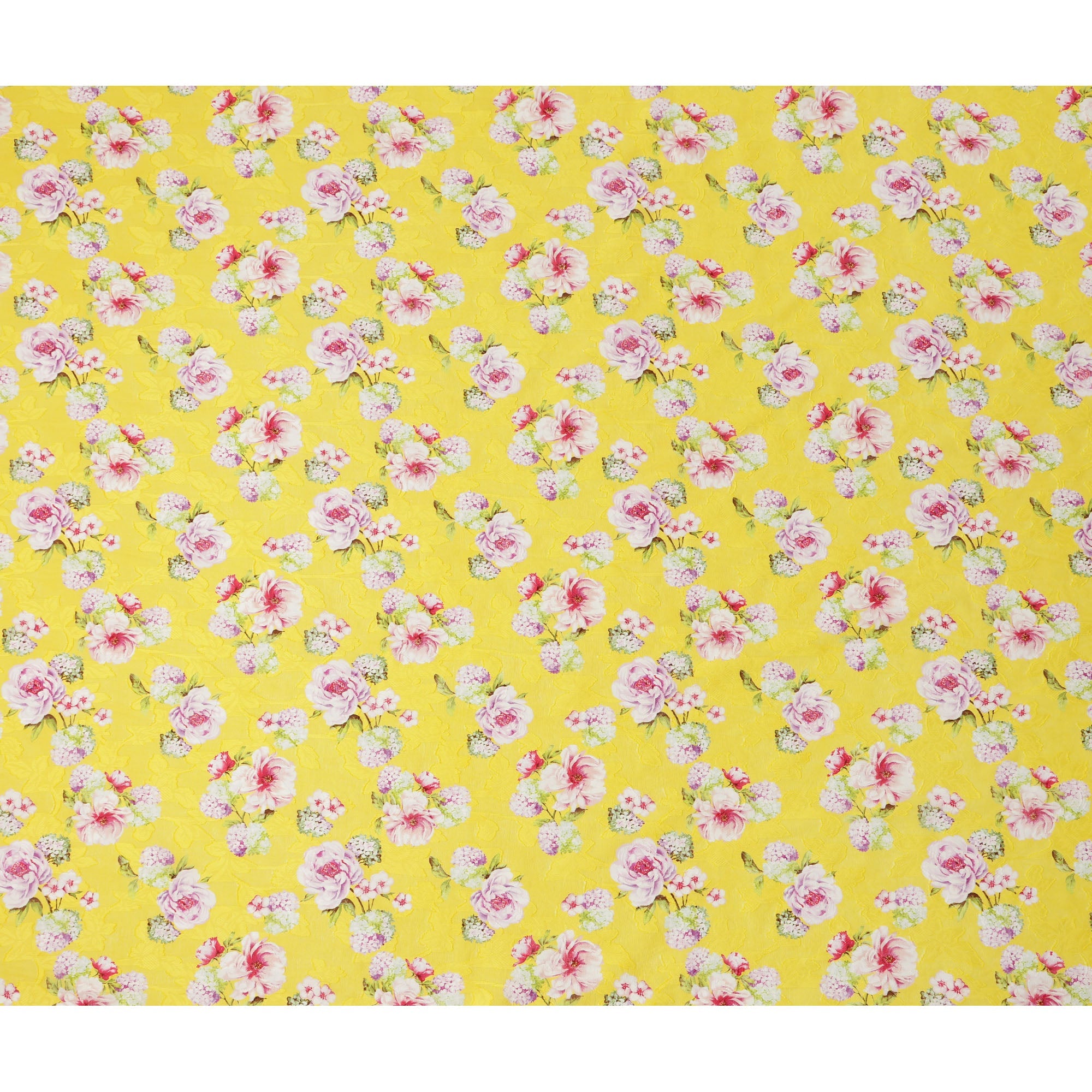 Elevate your designs with this bright yellow and pink floral Uragiri cotton voile jacquard fabric from Japan. Featuring a radiant yellow background adorned with delicate pink and white roses, complemented by soft green leaves and subtle lilac accents, this fabric exudes elegance and charm. The lightweight and breathable cotton voile drapes beautifully, making it perfect for dresses, blouses, scarves, and summery fashion pieces. The jacquard weave adds a touch of texture, enhancing its sophisticated appeal. With a width of 110 cm, this high-quality fabric is ideal for both modern and classic designs.