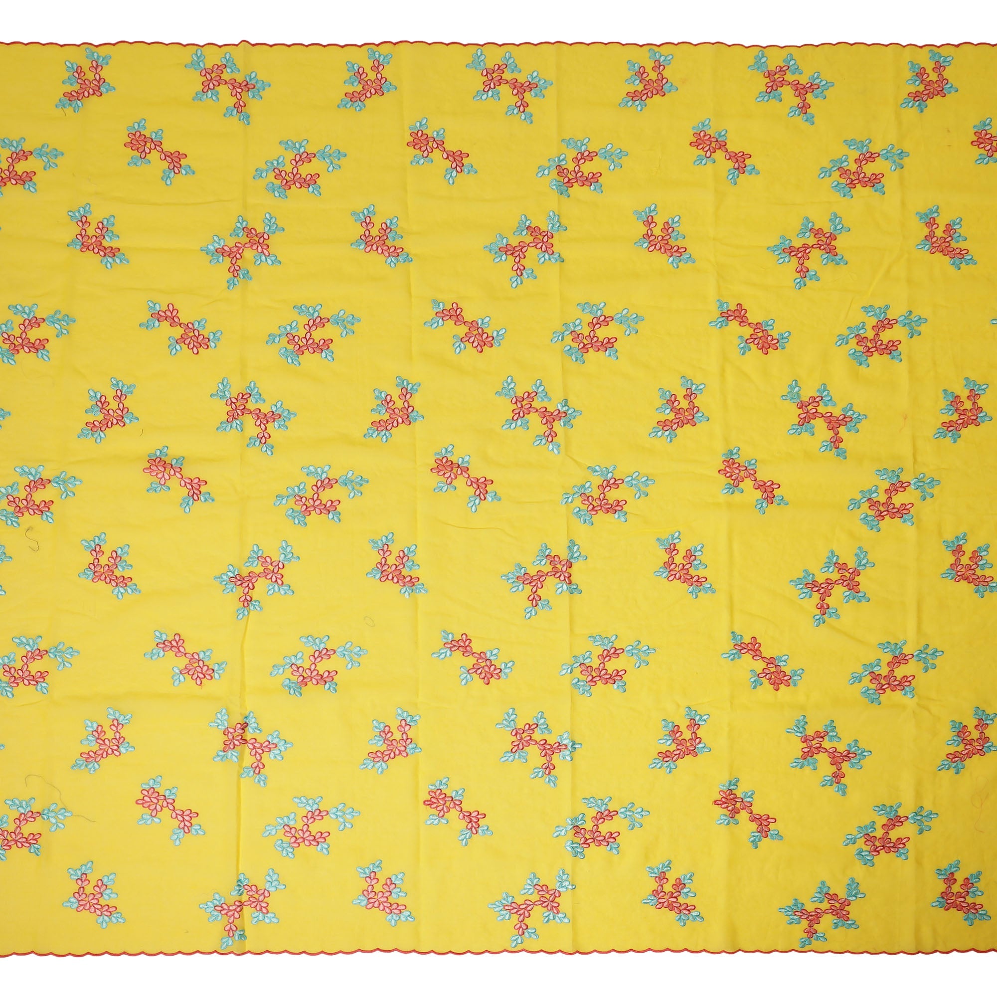 Colorful floral embroidery adds charm to the bright yellow base.
