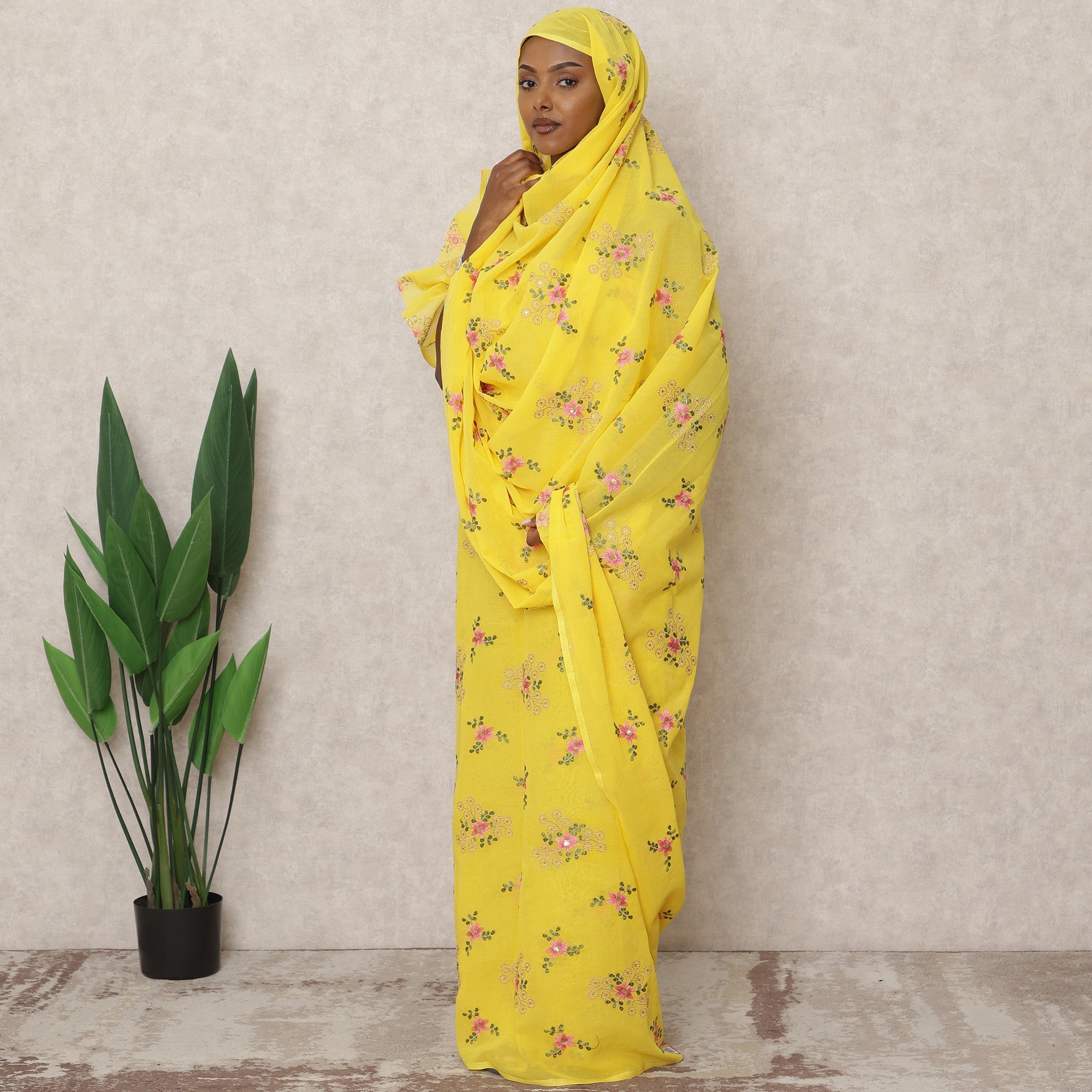 Infuse your ethnic wardrobe with joyful elegance through this Bright Yellow Traditional Sudanese Thobe, made from soft pure cotton voile and embellished with charming multicolor floral embroidery that captures the spirit of celebration and tradition. With a length of 4.5 meters and a width of 140 cm, this thobe ensures generous draping in authentic Sudanese style while providing maximum comfort through its breathable and lightweight cotton voile fabric. The lively yellow base is beautifully complemented by delicate embroidery in pink, green, and white tones, making it ideal for festive occasions, cultural gatherings, or everyday elegance. Expertly made in India, the fabric flows effortlessly with a soft texture that feels gentle on the skin and offers graceful movement. The floral embroidery, placed uniformly across the fabric, adds visual richness without overwhelming the design. Easy to care for with hand wash maintenance, this thobe is a vibrant blend of tradition, craftsmanship, and wearability. Buy online today to bring home a piece that radiates brightness and cultural beauty—shop online to make it yours.