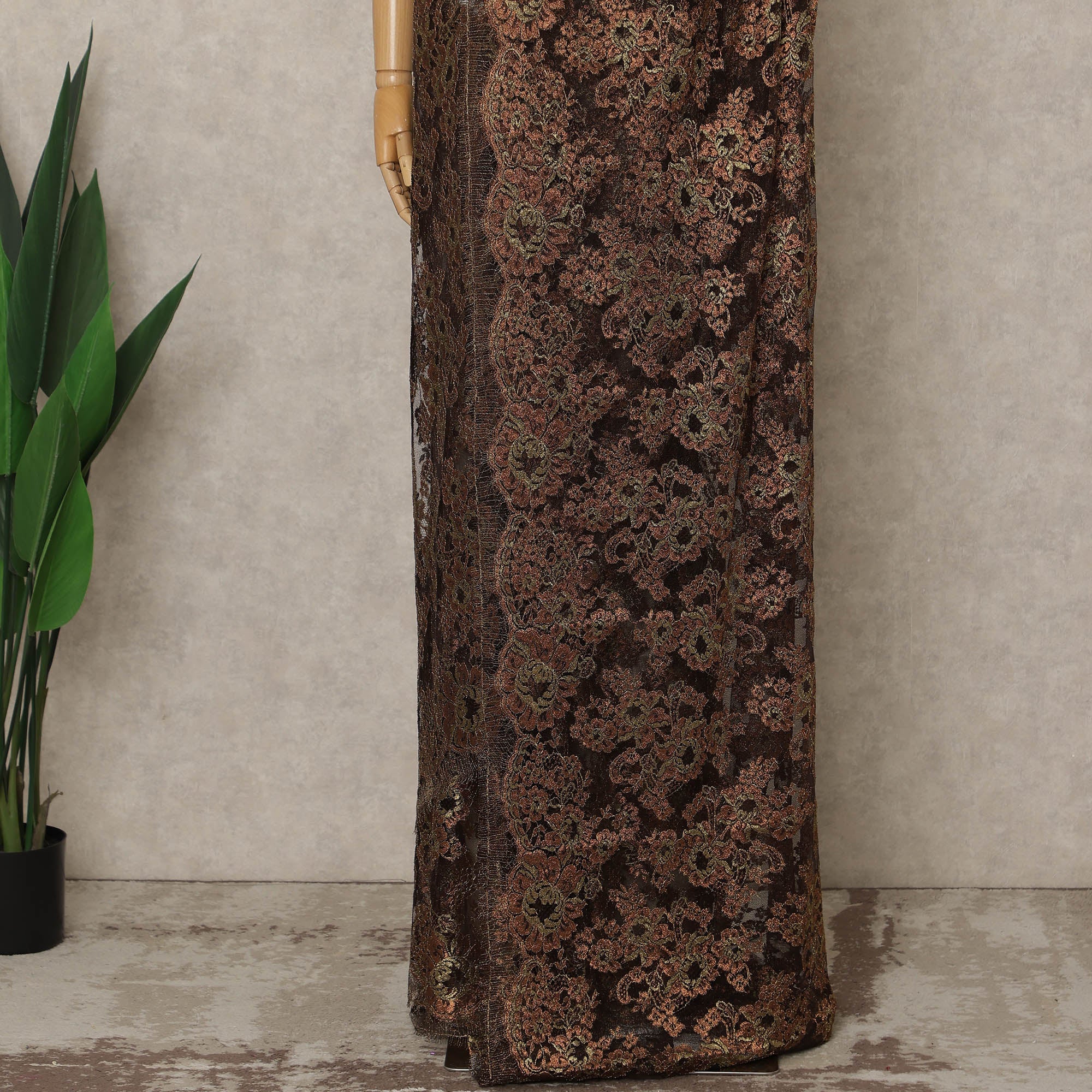 Bronze Brown Premium French Metallic Chantilly Lace Saree, 5.5 Mtrs Length, 110 Cms Width, Crafted in France-Blouse Not Included-D26692