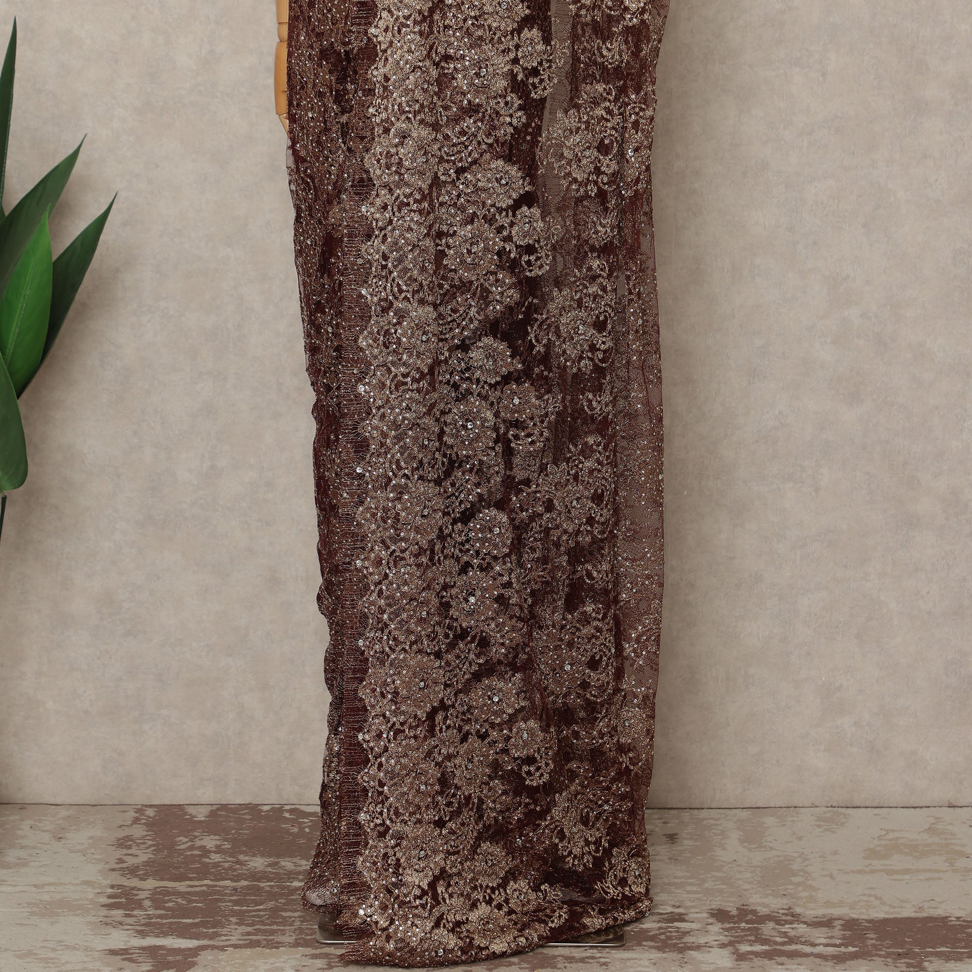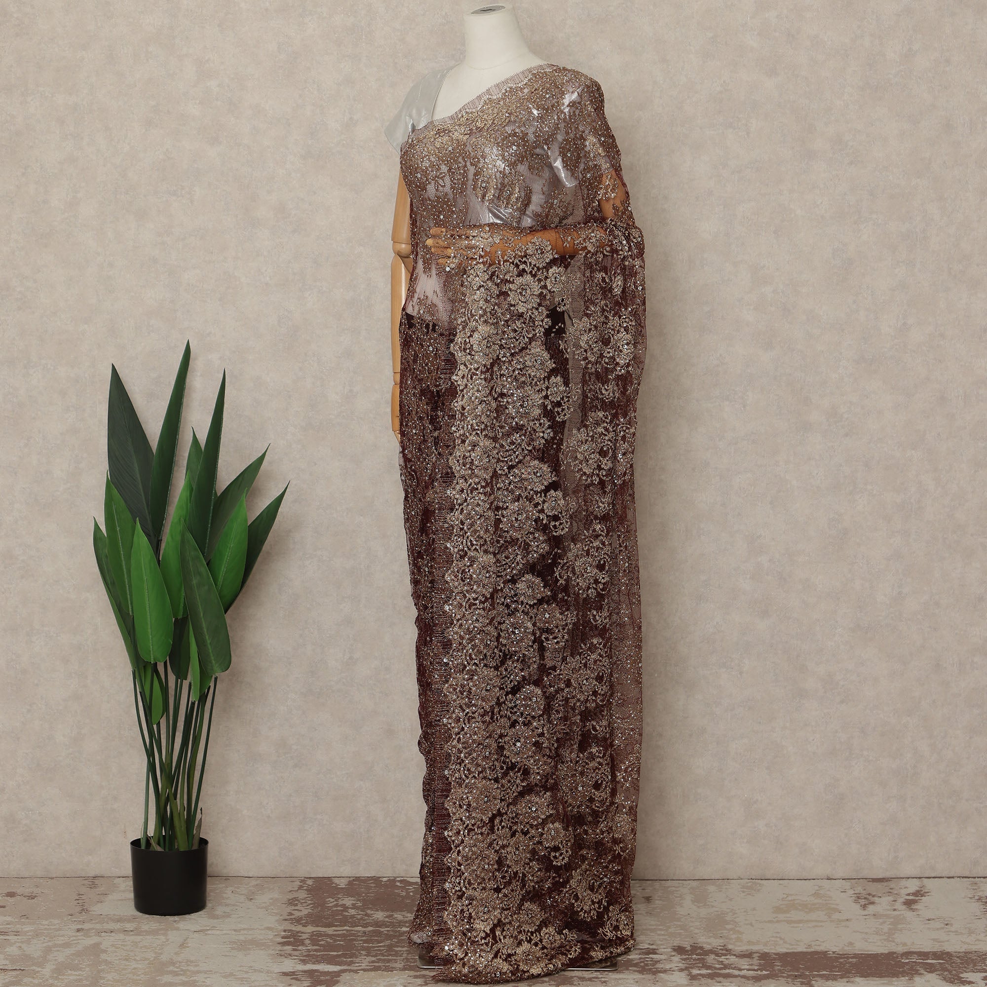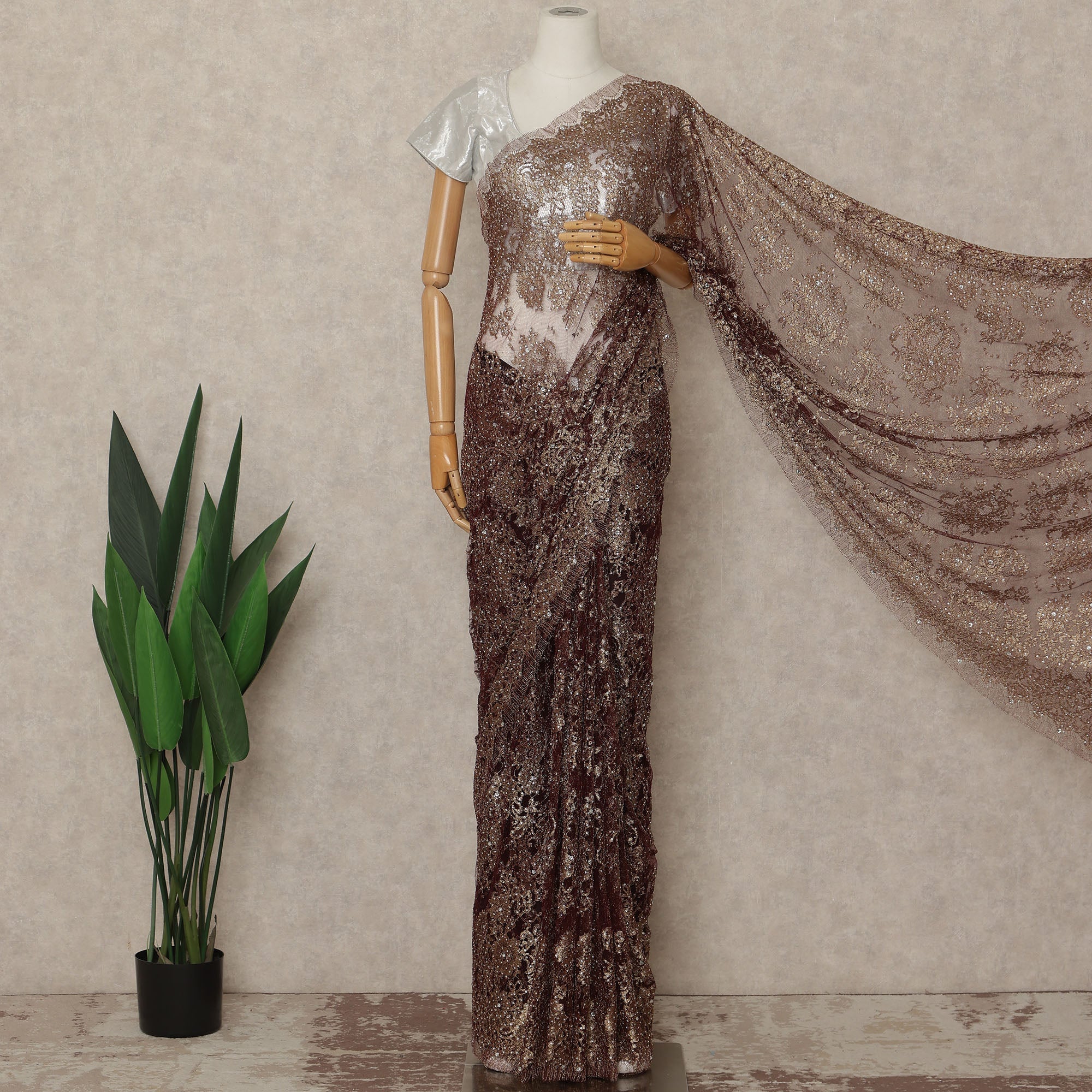 This bronze brown premium French metallic Chantilly saree lace with stone work is a luxurious and statement-making fabric crafted in France, featuring intricate floral Chantilly patterns woven with a subtle metallic finish and enhanced with delicate stone embellishments for rich sparkle. The finely detailed net base offers graceful drape and fluid movement, making it ideal for couture sarees, bridal wear, and high-end occasion ensembles. Supplied as a single continuous piece of approximately 5.5 meters with a wide 110 cms width, it allows seamless pleating and elegant fall while maintaining a refined metallic sheen. Blouse not included.