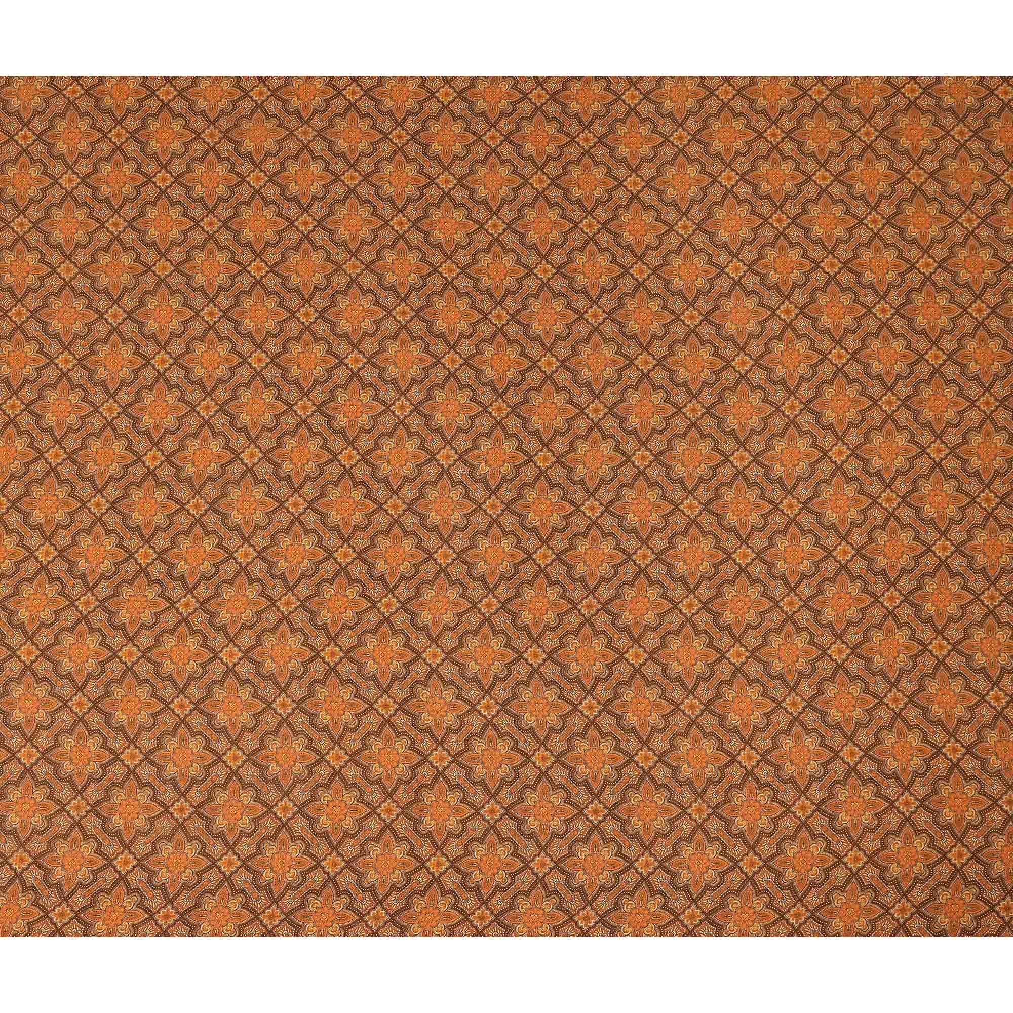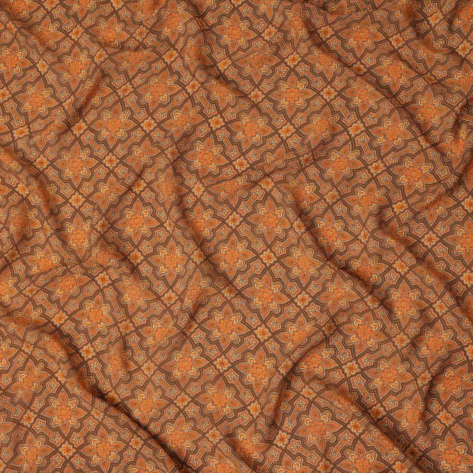 This brown geometric floral printed silk crepe fabric features an intricate vintage tile pattern with detailed floral motifs arranged in a symmetrical grid over a rich brown base with warm orange accents. Crafted from premium silk crepe, it offers a smooth texture and an elegant fluid drape that enhances both structured and flowing silhouettes. The lightweight and breathable quality ensures comfortable wear throughout the day, making it ideal for dresses, blouses, skirts, scarves, and refined ethnic ensembles. With a width of 110 cms, it provides ample flexibility for creative tailoring and designer projects. Perfect for fashion designers, boutiques, and sewing enthusiasts, this fabric blends classic pattern artistry with luxurious softness to create timeless garments suited for festive occasions and sophisticated everyday wear.