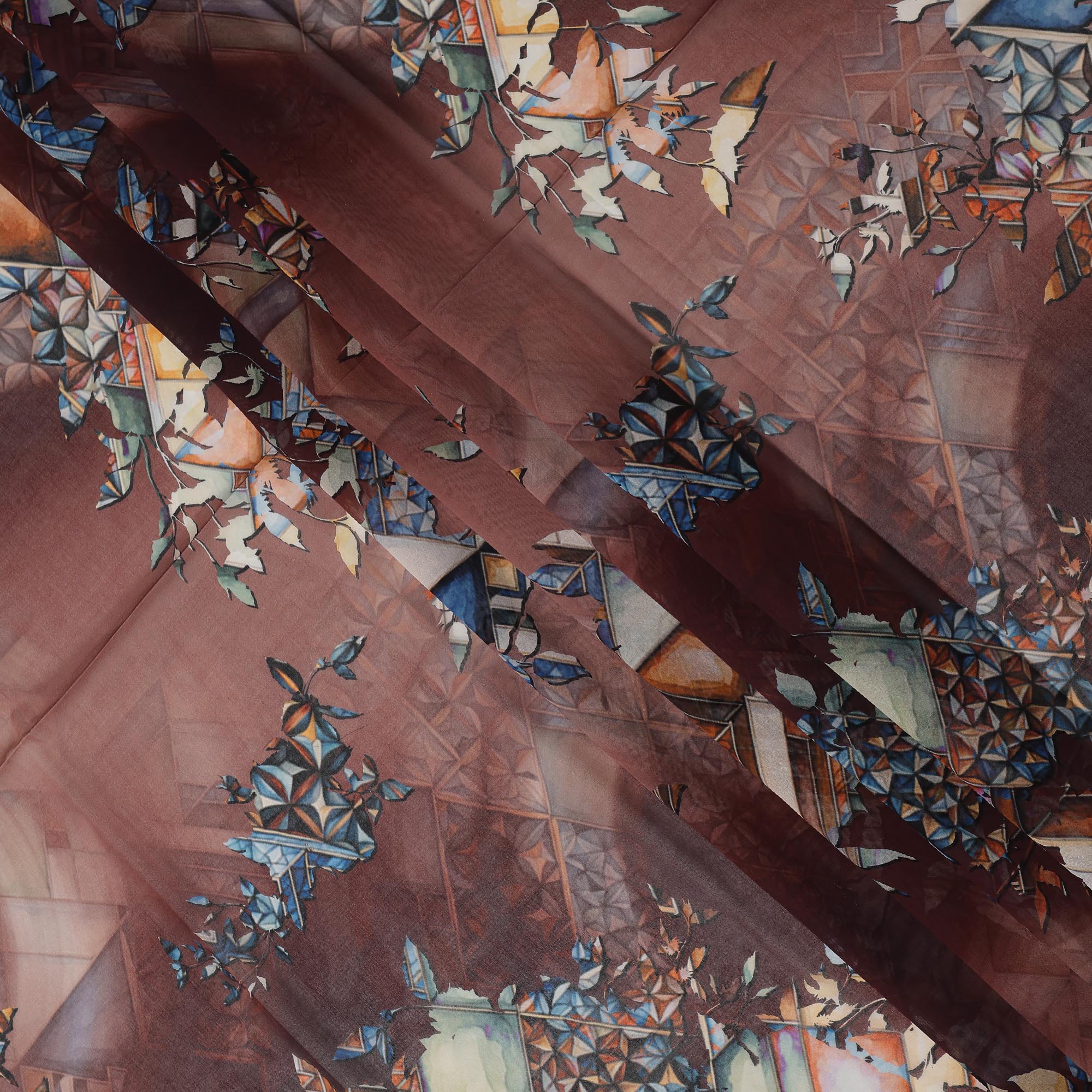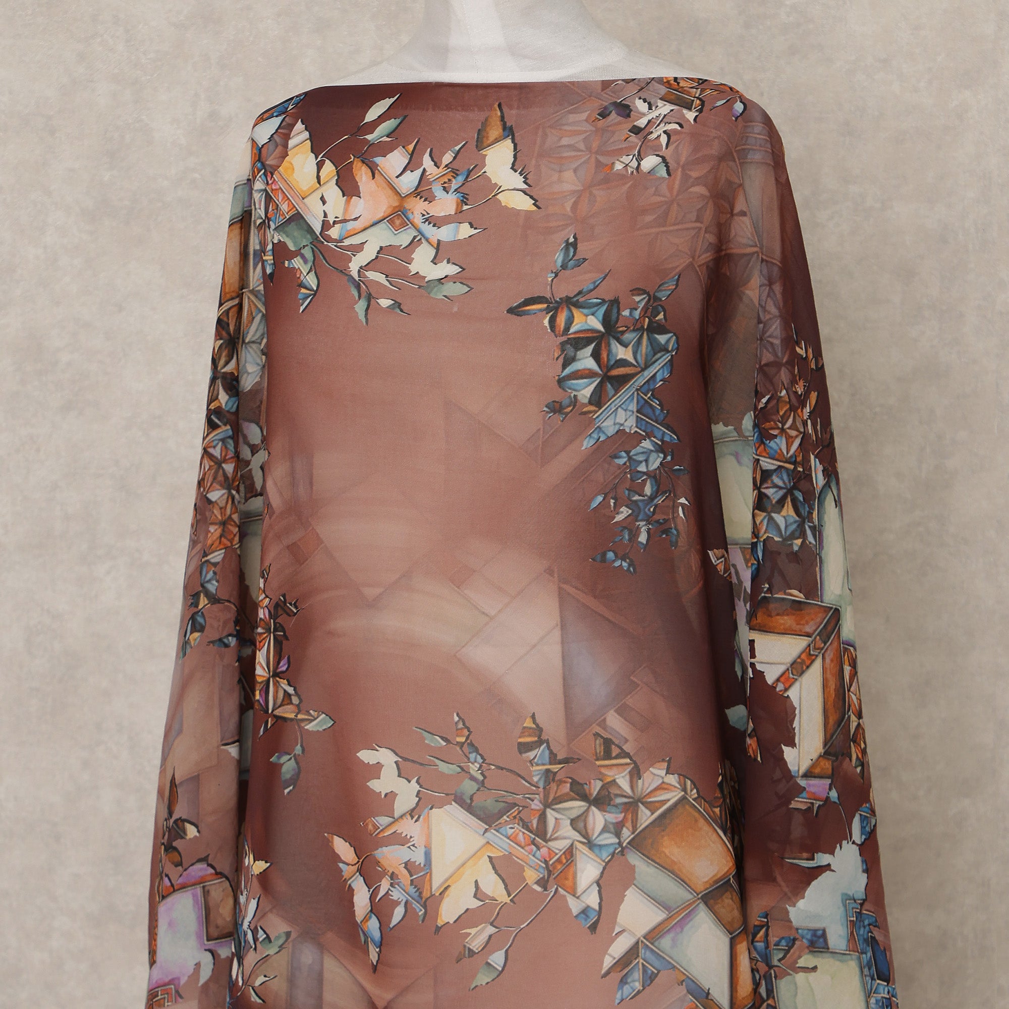 This brown Somali cotton voile dirac fabric showcases a striking blend of geometric and abstract floral-inspired prints in shades of... Read more Read more