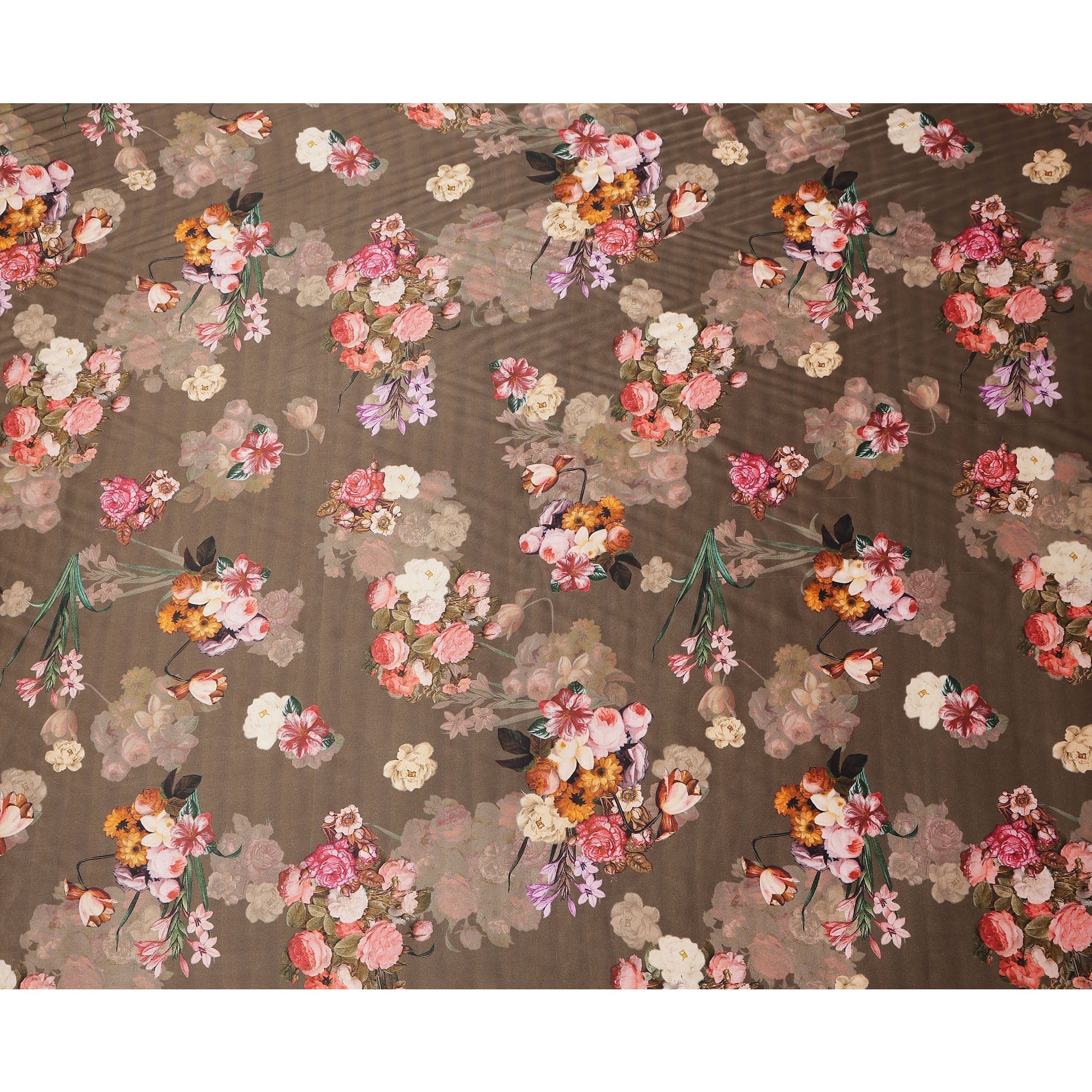 Brown Multicolor Floral Print Synthetic Satin Fabric, 140 Cms Width, India-D25222
