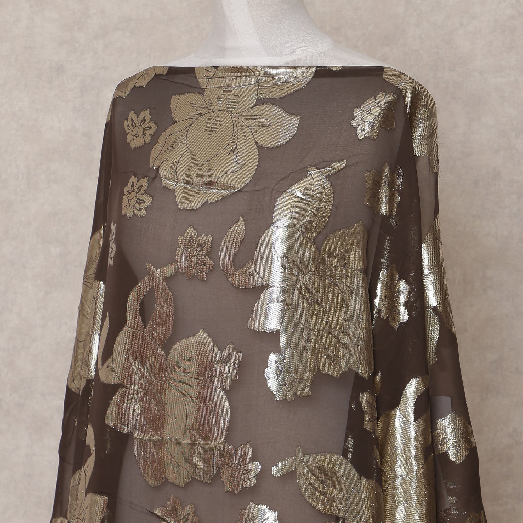 • Sale -50% Brown Traditional Somali Silk Chiffon Dirac Fabric with Metallic Lurex, 3.5 Mtrs, Width 140 Cms, Made in South Korea-D25064